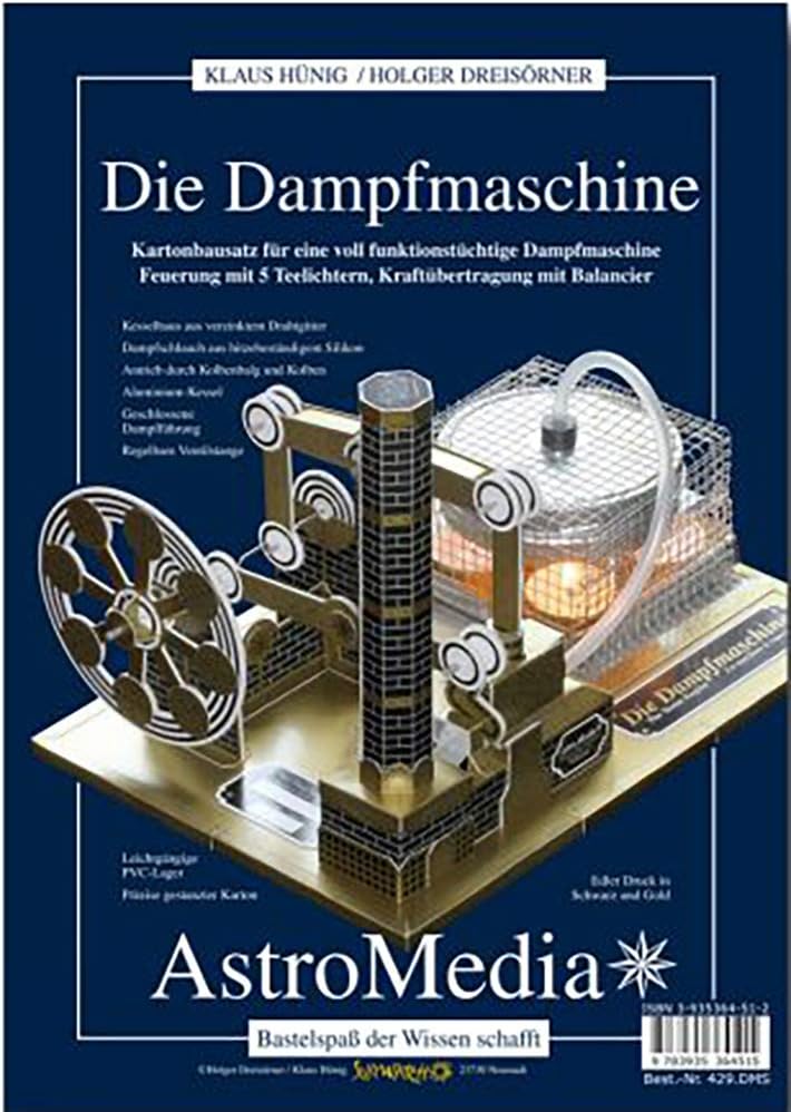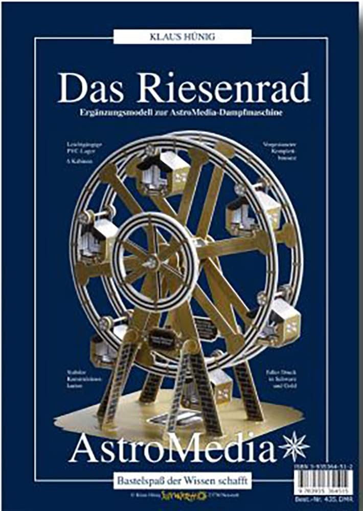 La ruota panoramica, alimentata dal motore a vapore. Ottieni entrambi come kit. La ruota panoramica è mantenuta in movimento dal motore a vapore. È progettato per un funzionamento particolarmente fluido e ha un potente rapporto di trasmissione di 15:1, ovvero la girante che fa girare la ruota panoramica ha un diametro 15 volte più grande della ruota motrice fissata all'albero motore del motore a vapore. La macchina a vapore è un kit di cartone ed è alimentata da vapore bollente.