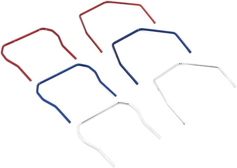 Adatto per: Slash Stampede Un set di tre barre stabilizzatrici per una gamma di regolazione più ampia per adattarsi allo stato attuale della pista barra stabilizzatrice in acciaio a molla regolabile Cromo 2 mm (duro) (nero), blu 1,8 mm (medio) (argento), rosso 1,6 mm (morbido)