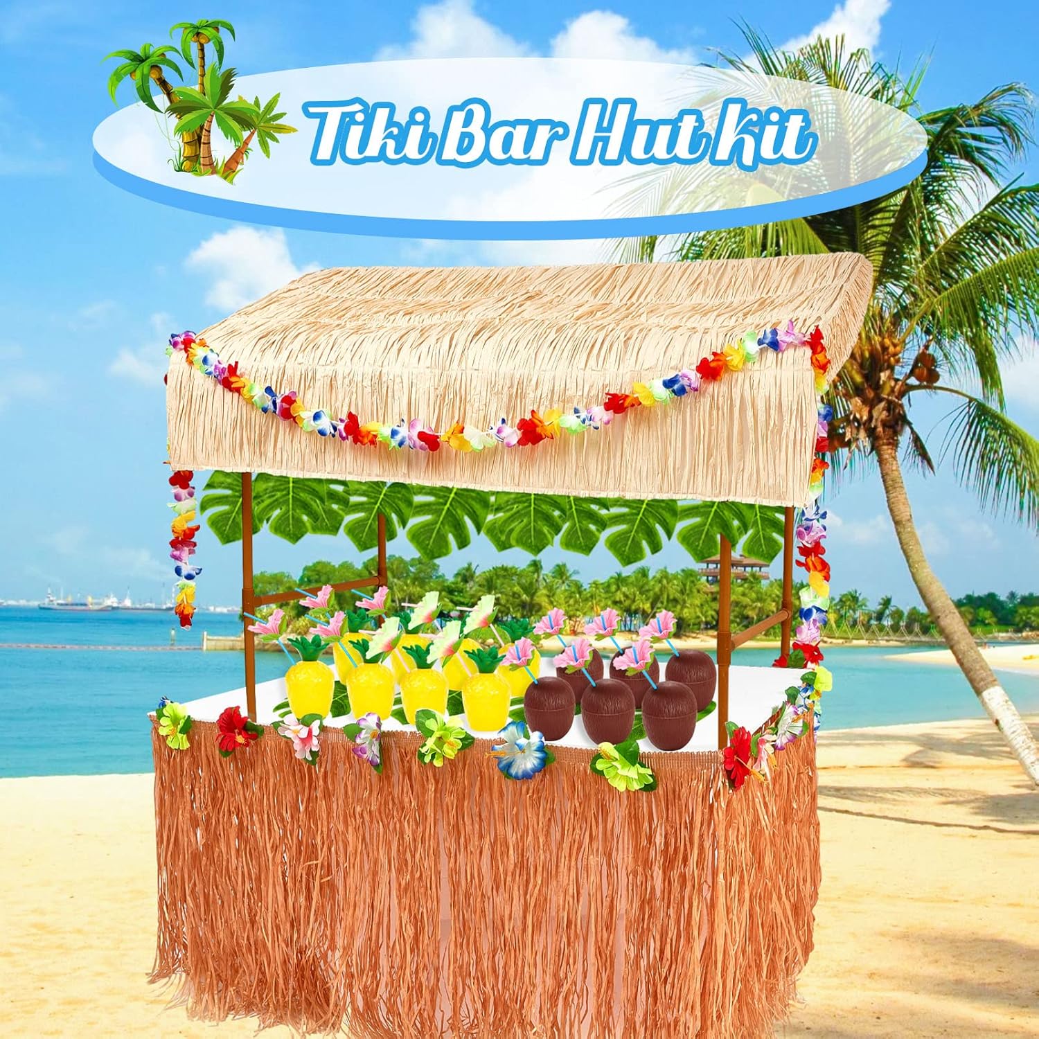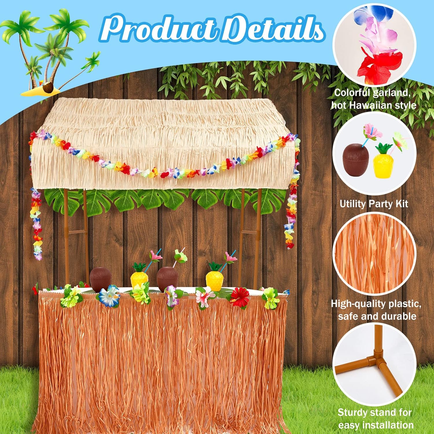 Facile da montare: il telaio del tetto in erba della capanna tiki bar è composto da 4 diverse lunghezze di pali sezionati in plastica e 4 diversi connettori che si incastrano e si rompono facilmente per una pulizia e uno stoccaggio efficienti che consentono di regolare l'altezza; Ci saranno le istruzioni per l'installazione, basta seguire le istruzioni per assemblare Stabile e robusto: il telaio del supporto da tavolo tiki hut bar è composto da 4 aste segmentate in plastica di qualità e connettori accurati, non facili da rompere, con tetto in plastica finta paglia; Il tiki bar da esterno è pieghevole, facile da riporre, comodo per il prossimo incontro e può essere applicato più volte Kit capanna Tiki Bar: riceverai 1 capanna tiki bar con decorazione a ghirlanda di ibisco, 1 gonna da tavolo hawaiana, 24 foglie di palma tropicale artificiale, 24 fiori di ibisco, 24 ghirlande hawaiane colorate, 12 tazze di cocco, 12 tazze di ananas e 4 nastri. Foglie tropicali artificiali e fiori di ibisco: le foglie di palma hawaiane e i fiori di plastica hawaiani sono realizzati in materiale poliestere di qualità, sembrano foglie e fiori veri, è facile fissarli con nastro adesivo o attaccarli al muro per creare splendidi bomboniere per feste luau Ghirlanda di ibisco e tazze per feste Luau: le ghirlande di ibisco sono realizzate in morbido materiale poliestere leggero, comodo al tatto, affidabile e riutilizzabile; I bicchieri da festa hawaiani con cannucce e fiori di ibisco colorati sono realizzati in plastica PP, robusti e di lunga durata, e sono riutilizzabili dopo la pulizia