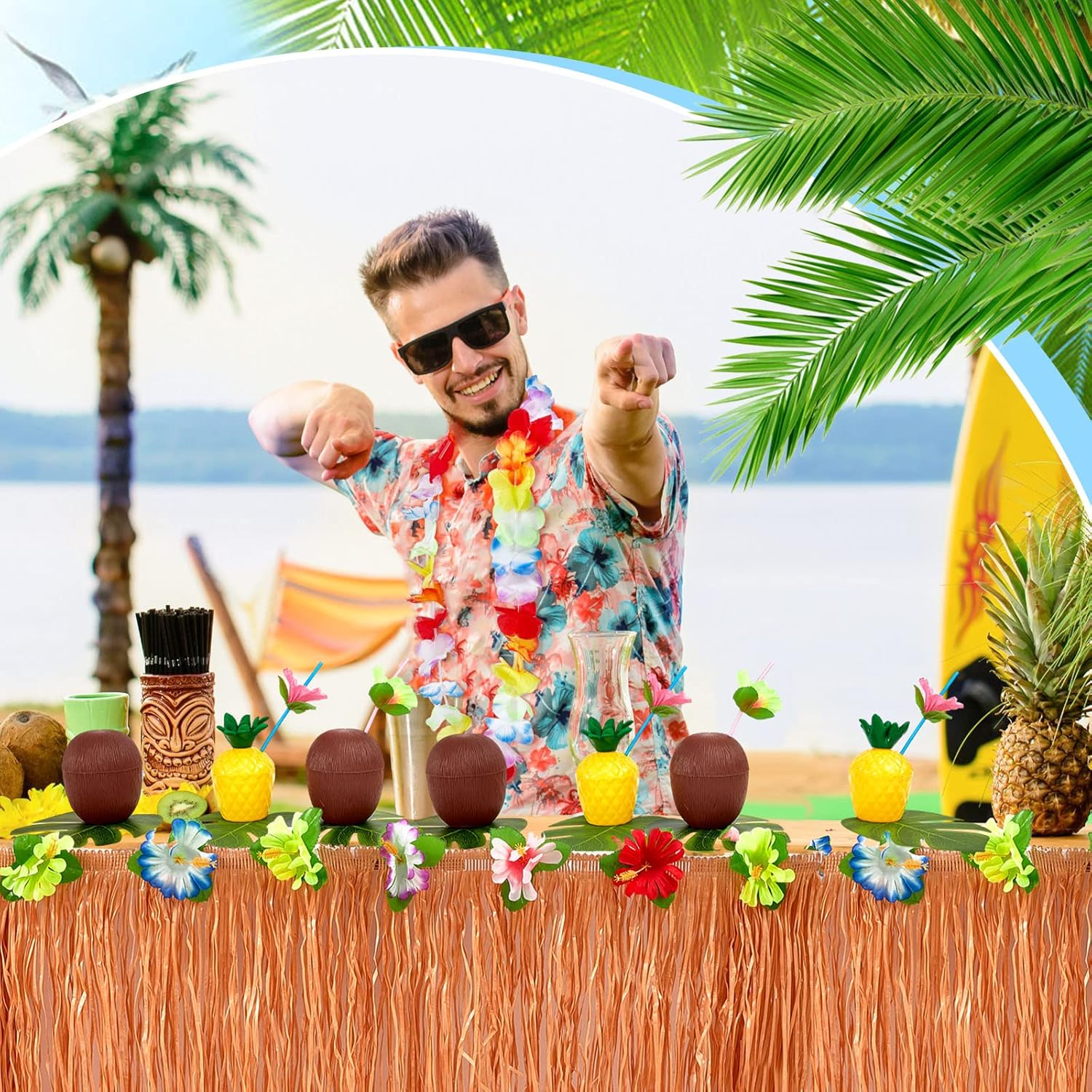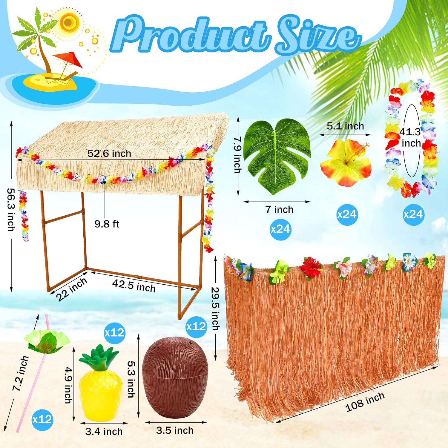 Kit capanna Tiki Bar: riceverai 1 capanna tiki bar con decorazione a ghirlanda di ibisco, 1 gonna da tavolo hawaiana, 24 foglie di palma tropicale artificiale, 24 fiori di ibisco, 24 ghirlande hawaiane colorate, 12 tazze di cocco, 12 tazze di ananas e 4 nastri. Ghirlanda di ibisco e tazze per feste Luau: le ghirlande di ibisco sono realizzate in morbido materiale poliestere leggero, comodo al tatto, affidabile e riutilizzabile; I bicchieri da festa hawaiani con cannucce e fiori di ibisco colorati sono realizzati in plastica PP, robusti e di lunga durata, e sono riutilizzabili dopo la pulizia Stabile e robusto: il telaio del supporto da tavolo tiki hut bar è composto da 4 aste segmentate in plastica di qualità e connettori accurati, non facili da rompere, con tetto in plastica finta paglia; Il tiki bar da esterno è pieghevole, facile da riporre, comodo per il prossimo incontro e può essere applicato più volte Foglie tropicali artificiali e fiori di ibisco: le foglie di palma hawaiane e i fiori di plastica hawaiani sono realizzati in materiale poliestere di qualità, sembrano foglie e fiori veri, è facile fissarli con nastro adesivo o attaccarli al muro per creare splendidi bomboniere per feste luau Facile da montare: il telaio del tetto in erba della capanna tiki bar è composto da 4 diverse lunghezze di pali sezionati in plastica e 4 diversi connettori che si incastrano e si rompono facilmente per una pulizia e uno stoccaggio efficienti che consentono di regolare l'altezza; Ci saranno le istruzioni di installazione, basta seguire le istruzioni per assemblare