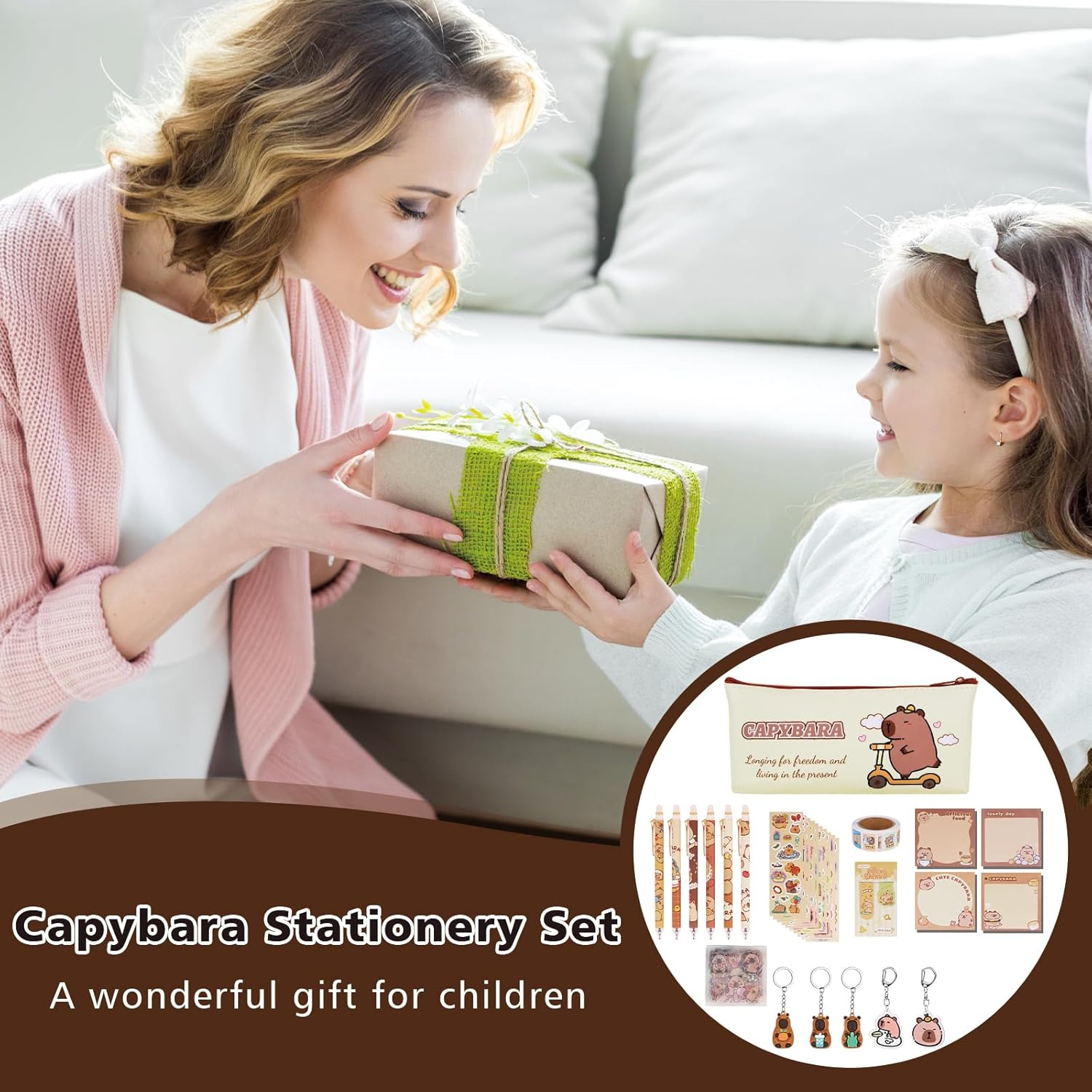 Set di Capibara Cancelleria: il capibara cancelleria include 1 x capibara astuccio, 6 x capybara penne cancellabili, 30 x capybara adesivo (10 adesivi carini + 20 adesivi trasparenti), 2 x segnalibro magnetico, 4 x block notes con motivi (200 fogli), 3 x capybara portachiavi, 2 x mini ciondoli e 1 x rotolo di adesivi per diario, il tutto con un grazioso design a tema Capybara! Tessuto Resistente: Capibara astuccio realizzato in materiale resistente all'usura e ai graffi che unisce resistenza e morbidezza al tatto. Il robusto guscio esterno protegge i tuoi effetti personali e il design flessibile ne garantisce la maneggevolezza, rendendolo perfetto per la scuola, i viaggi o l'uso quotidiano. Borsa Multifunzionale: Capibara astuccio può essere utilizzato non solo come astuccio, ma anche come elegante trousse, organizer da viaggio o contenitore creativo. Perfetto per la scuola, i viaggi o come organizer per il trucco. Cute Cancelleria Capybara: Le capybara penne cancellabili consentono una scrittura precisa; in caso di errore, è possibile cancellarlo facilmente con il cappuccio della penna. I segnalibri magnetici mantengono le pagine in posizione, facilitando la lettura. Con gli altri accessori Capybara, puoi personalizzare i tuoi articoli e donare loro un aspetto molto carino. Astuccio Kawaii: Il grazioso set di cancelleria Capybara è amato da bambini e bambine ed è un ottimo regalo per i bambini per stimolare il loro interesse per l'apprendimento. Può essere regalato anche agli adulti che amano le cose carine.