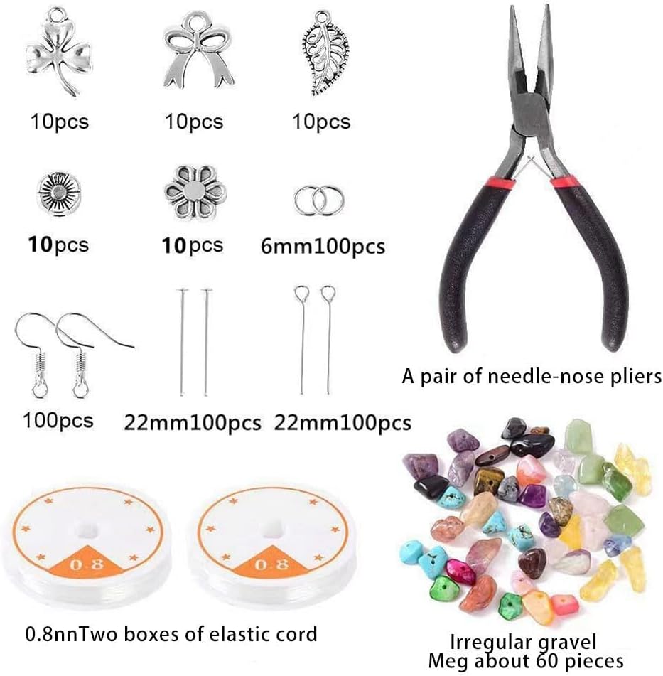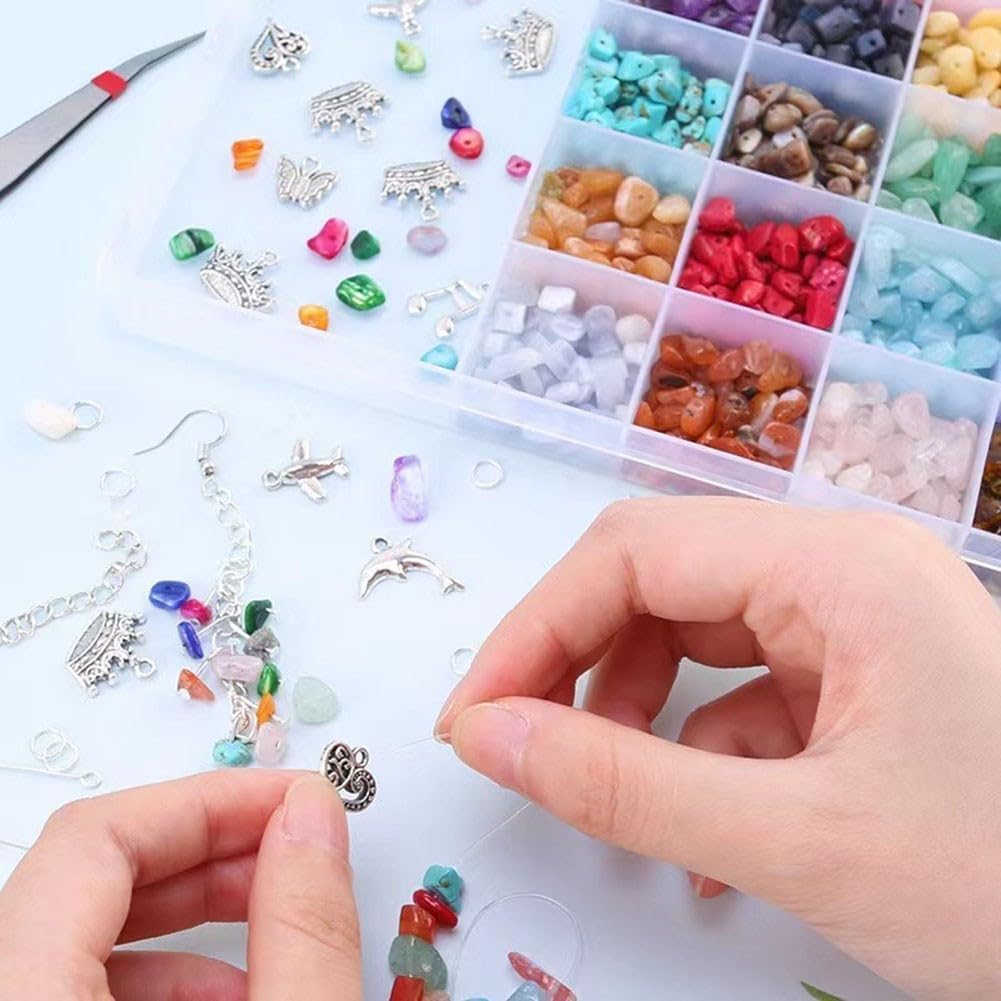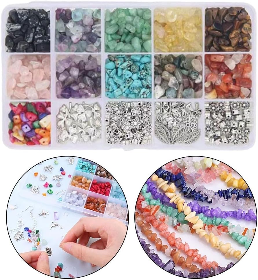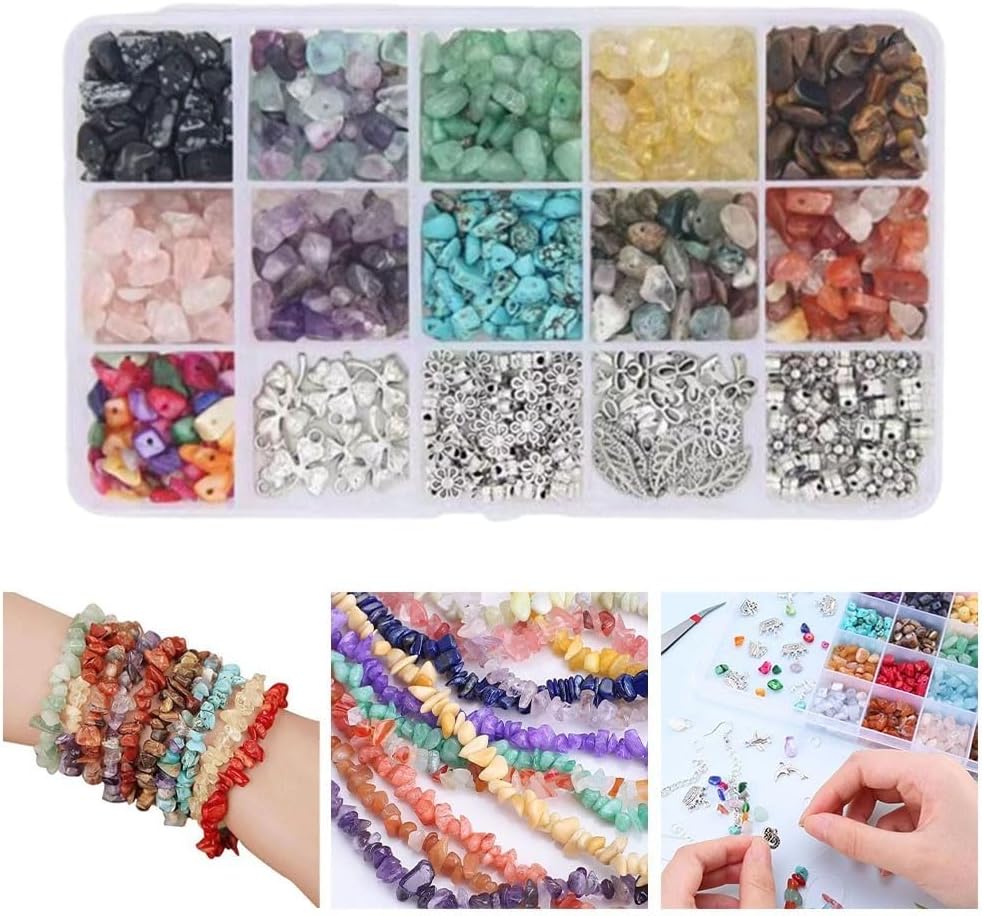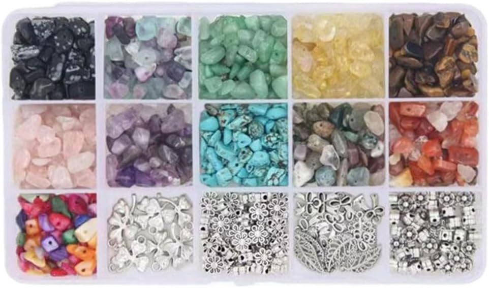Kit versatile per la creazione di gioielli: questo kit per la creazione di gioielli include 11 griglie con circa 60 pezzi per griglia, 40 accessori in lega di zinco, 100 ganci per orecchie, 100 aghi a fondo piatto da 22 mm, 100 aghi a forma di nove da 22 mm, 100 anelli in ferro da 6 mm, 2 corde elastiche da 8 mm e un paio di pinze a becchi ad ago. Fornisce tutto ciò di cui hai bisogno per creare i tuoi gioielli unici. Perline belle e uniche: questo kit per la creazione di gioielli presenta circa 660 perline in diversi colori vivaci. Queste perline sono accuratamente lucidate in forme irregolari e hanno fori da 1 mm praticati in esse, consentendo una facile infilatura e infinite possibilità di design. Lascia che la tua creatività salga e progetta gioielli nel suo genere con queste perline gemst. Ampia gamma di applicazioni: questo set per la creazione di gioielli fai da te è adatto per creare bracciali, collane, cavigliere, orecchini, spille, anelli e altri lavori fai da te. Condividi la gioia del fai da te con i tuoi amici e familiari e crea per le occasioni speciali. Perfetto sia per principianti che per esperti produttori di gioielli. Materiale: le perline e gli accessori di questo kit sono realizzati con materiali in lega, resistenti e lucentezza di lunga durata. Crea gioielli che non solo sembrano belli, ma resistono anche alla prova del tempo. Confezione comoda e completa: questo kit per la creazione di gioielli viene fornito in una pratica scatola per mantenere tutti i componenti organizzati e facilmente accessibili. Con tutto ciò di cui hai bisogno in confezione, puoi iniziare subito il tuo viaggio di creazione di gioielli. Lascia correre la tua immaginazione ed esprimi il tuo stile unico con questo kit completo per la creazione di gioielli. Totale caratteri: 679