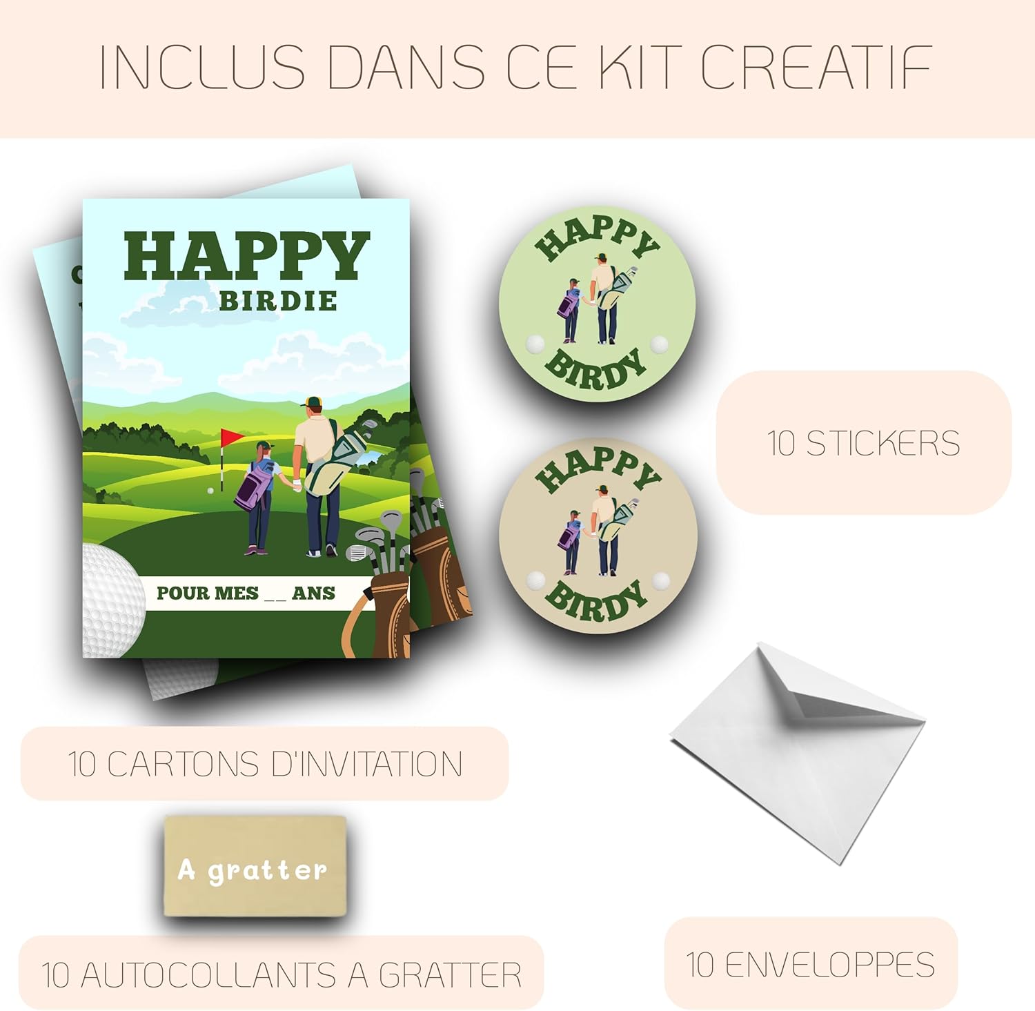 Un invito che fa sensazione! Trasforma il tuo compleanno in un'esperienza unica ed elegante con questo mistero kit di invito a tema golf. Ideale per golfista e golfista, grandi e piccini, questo set completo offre facilmente un tocco di raffinatezza e cordialità al tuo evento. Un set completo ed esclusivo. Ogni kit da golf include 10 biglietti d'invito con motivi raffinati, 10 adesivi dorati da grattare per un tocco di sorpresa e 10 buste perfette per un trasporto postale o un ritiro pulito. Un set premium progettato per un evento memorabile! Adatto per ragazze e ragazzi. Alta qualità per una resa perfetta! Realizzate in Francia, questi biglietti di invito premium sono stampati su carta spessa (400 gr), per una stampa nitida e duratura. Il formato A6 (10,5 x 14,8 cm) è ideale per una spedizione ordinata, aggiungendo un tocco di eleganza alla tua celebrazione. I ricordi saranno garantiti. Un'organizzazione semplificata e veloce! ⏳Grazie al loro design intelligente, queste carte con i campi di testo facilitano la scrittura di informazioni essenziali (data, indirizzo luogo, ora). Genitori e figli partecipano, pur offrendo inviti personalizzabili; originali ed eleganti ai prompt. Un'atmosfera golfica garantita! Perfetto per una festa sul verde o un torneo con gli amici, questo kit di invito golf assicura un'atmosfera coinvolgente appena ricevendo i cartoni di invito. Un evento prestigioso, posto sotto il segno del gioco, della sfida dell'eccitazione e del divertimento!