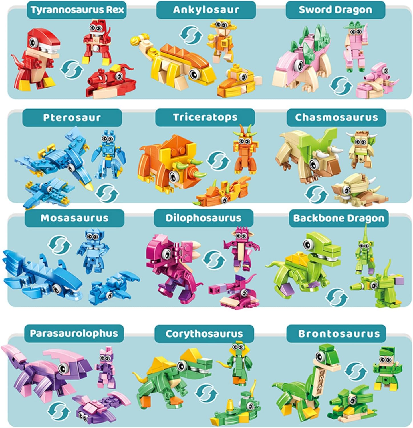 Kit di costruzione dinosauro 12 in 1 per bambini: include 12 mini set confezionati singolarmente, ciascuno con 3 opzioni di costruzione. I bambini possono costruire 12 dinosauri diversi, ideali per il gioco creativo e il divertimento dell'apprendimento continuo. Giocattolo per l'apprendimento precoce incentrato sullo STEM: incoraggia le capacità motorie, il pensiero spaziale, la creatività e le capacità di risoluzione dei problemi. Un divertente gioco educativo che sviluppa pazienza e concentrazione, perfetto per bambini dai 4 anni in su. Alta qualità e sicurezza: realizzato in plastica ABS resistente e liscia. I mattoncini si adattano perfettamente e si tengono saldamente insieme, per un gioco sicuro e indisturbato senza rischio di lesioni. Divertimento pratico: supporta l'apprendimento cognitivo attraverso la costruzione attiva. Incoraggia il gioco senza schermo e rafforza l'attenzione, la coordinazione occhio-mano e la creatività nei piccoli costruttori. Divertimento in famiglia e divertimento da collezione: una grande attività per genitori e bambini. Dopo la costruzione, i mini modelli diventano graziosi oggetti da collezione o decorazioni - per indimenticabili momenti di gioco insieme.
