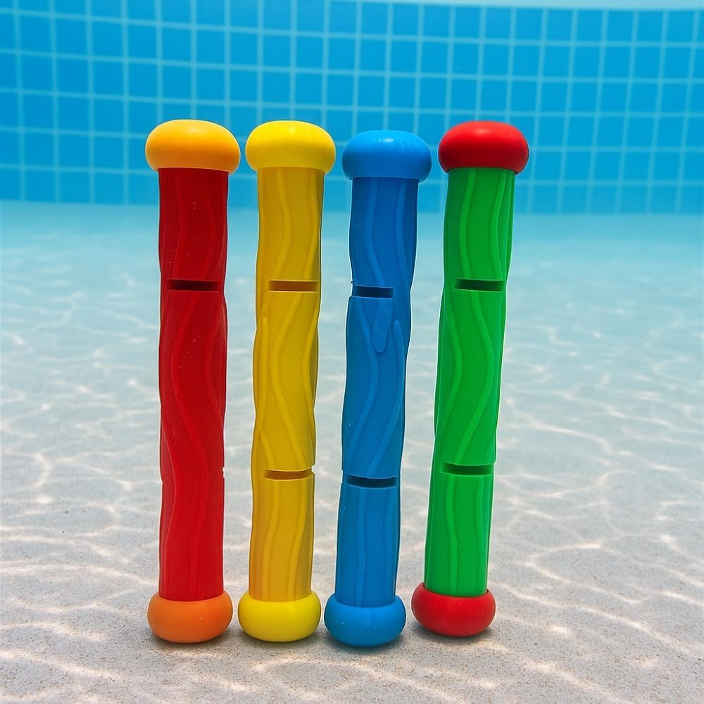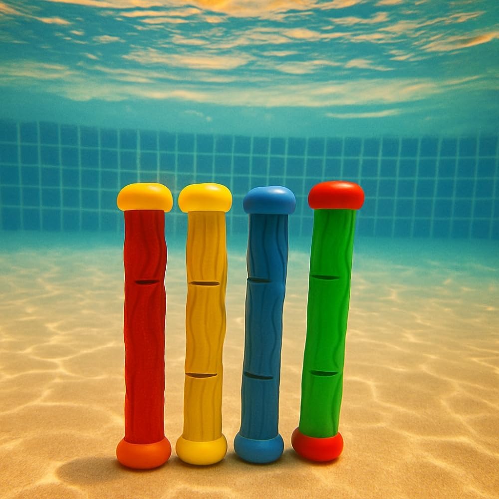 Apprendimento giocoso del nuoto Questi bastoncini da immersione consentono ai bambini di esercitare lo snorkeling mentre si divertono. La loro forma ponderata li spinge a nuotare sott'acqua, sviluppando così la loro facilità, respirazione e fiducia nell'ambiente acquatico. Design ergonomico e sicuro Ogni bastone è progettato con estremità arrotondate e materiali morbidi ma resistenti, evitando qualsiasi rischio di lesioni. La loro consistenza facilita la presa anche per le piccole mani bagnate. Visibilità ottimale grazie ai colori vivaci Con colori vivaci (rosso, blu, giallo, verde), questi bastoncini sono facili da individuare sul fondo della piscina, stimolando l'acuità visiva e il riflesso di ricerca sott'acqua. Gioco collettivo stimolante Ideale per giochi a molti, il kit favorisce la competizione amichevole, la collaborazione e il superamento di sé. Può essere utilizzato in giochi educativi, lezioni di nuoto o semplicemente per divertirsi. Compatto, leggero e facile da trasportare Il kit si inserisce facilmente in una borsa da piscina o in una valigia da vacanza. È perfetto per famiglie, centri ricreativi o club di nuoto che desiderano offrire un'attività salvaspazio e molto efficiente.