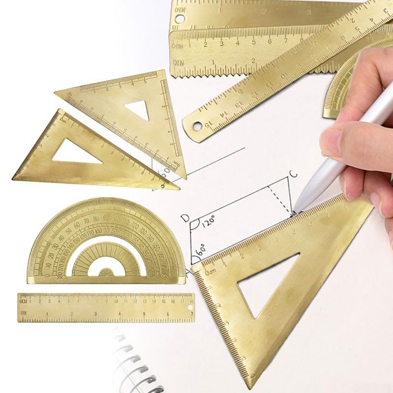 Robusta struttura in ottone: questo set di righelli è sapientemente realizzato in ottone massiccio per una maggiore durata e stabilità contro piegature e usura, rendendolo adatto sia per studenti che per professionisti. [Strumenti di ingegneria precisi] Ogni pezzo è meticolosamente progettato con finiture lucide che misurano accurate essenziali per attività di disegno e applicazioni di ingegneria. Design artistico funzionale: il righello triangolare destro e il goniometro sono dotati di fori di posizionamento innovativi che facilitano il disegno preciso degli angoli unendo funzionalità e creatività. Portatile e comodo: con le sue dimensioni compatte di 18 cm e i molteplici campi di misurazione, questo set si adatta facilmente in borse per l'uso a scuola, al lavoro o attività creative.