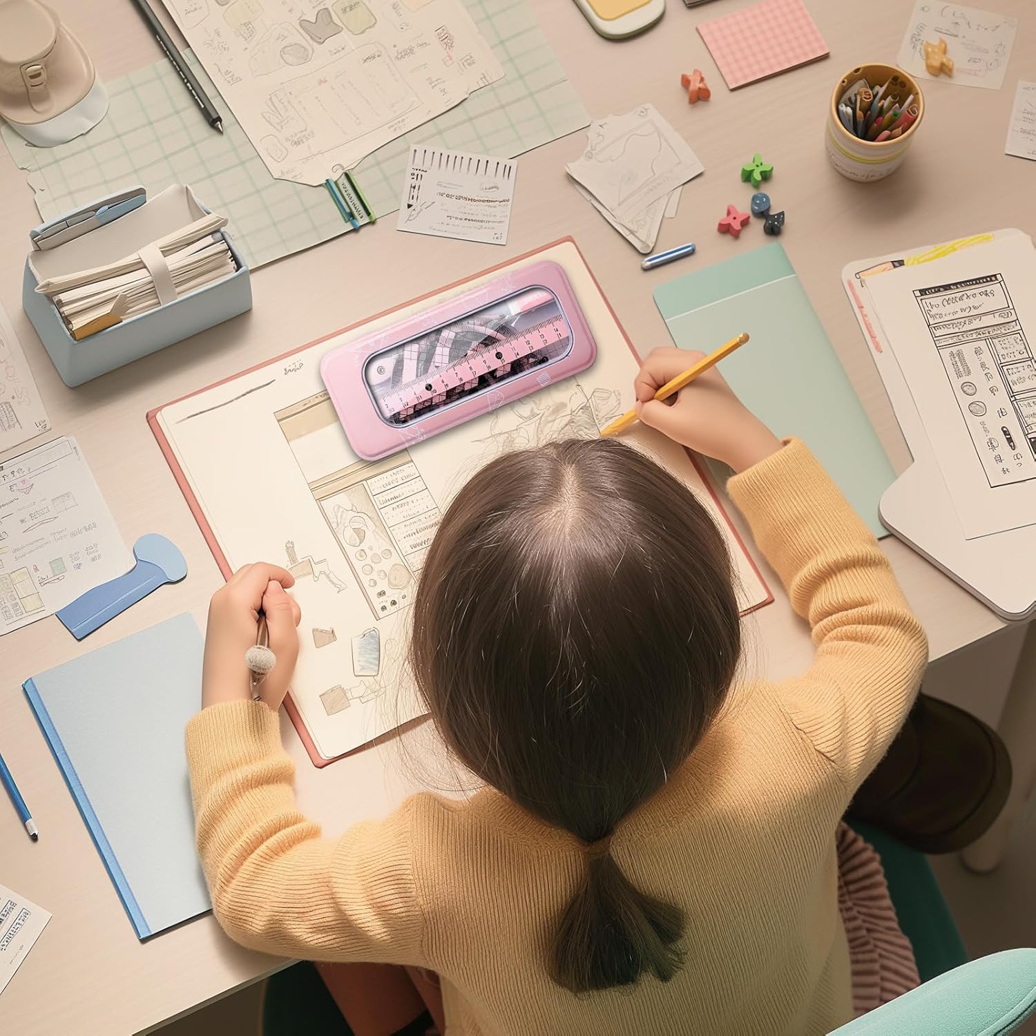 Strumenti di Precisione: Questo set di geometria include compasso e goniometro con dettagliata, garantendo misurazioni accurate e disegni impeccabili per studenti durante lezioni di matematica, studio autonomo e compiti complessi senza errori Set completo cancelleria: Il set geometria offre una collezione di articoli di cancelleria ben organizzata che soddisfa le esigenze degli studenti; la fusione di praticità e design contemporaneo lo rende adatto all'uso quotidiano, garantendo che sia un eccellente regalo per il rientro a scuola per giovani studenti alle prese con compiti di geometria Designo pratico di archiviazione: Il kit di geometria offre una soluzione funzionale con scomparti ben divisi che contengono saldamente un set di 8 strumenti, prevenendo la perdita degli e garantendo organizzazione per un accesso immediato quando riposto in zaini o cassetti, ideale per studenti e creativi che necessitano avere gli strumenti sempre a portata di mano durante progetti o lezioni Design Creativo Giovanile: Il set di geometria mostra motivi geometrici accattivanti abbinati a un tema bicromo trasparente, ottenendo un effetto colorazione fashion che stimola l'interesse degli adolescenti durante lo studio. Strumento didattico a basso riflesso: La presenza di scale a contrasto attenuato e superfici opache minimizza i riflessi, garantendo massima chiarezza d'uso durante compiti di matematica o progetti tecnici mentre favorisce l'apprendimento concentrato