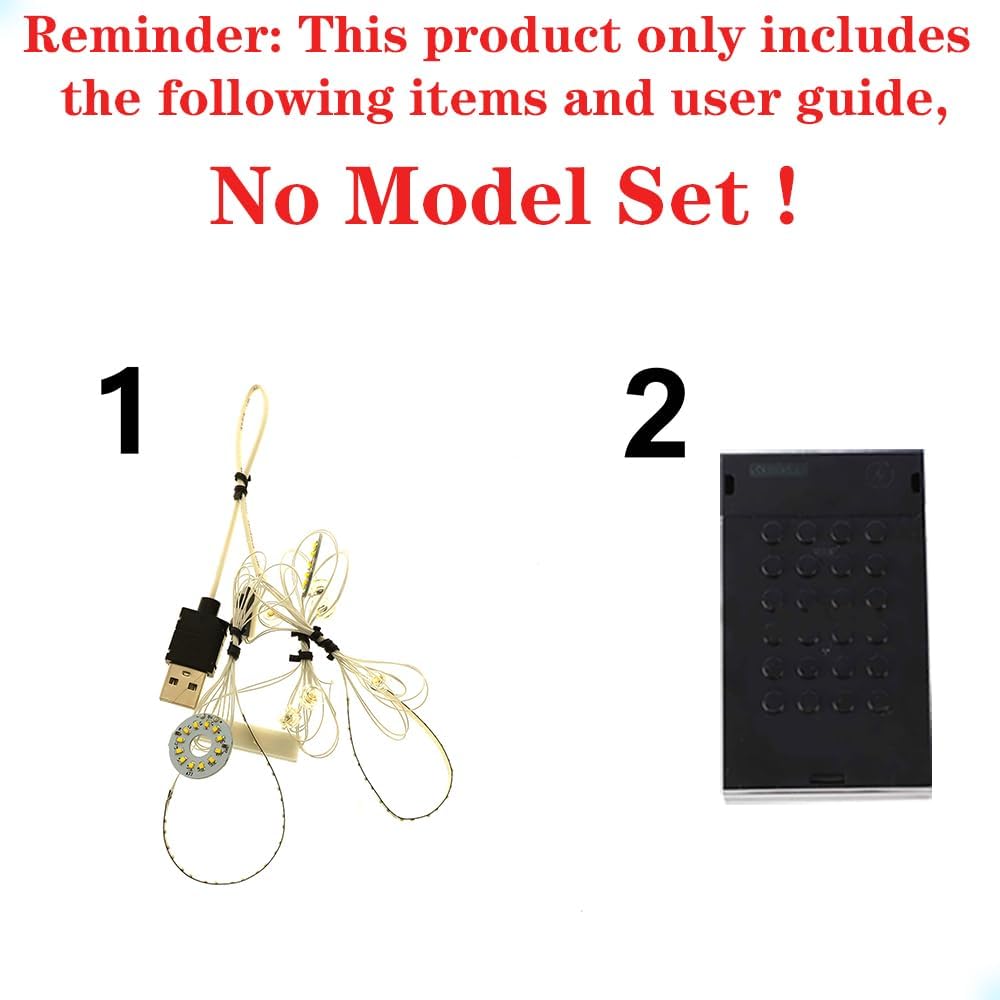 Model Set NON incluso - Model Set NON incluso - Model Set NON incluso - Model Set NON incluso - Model Set NON incluso. Si prega di notare: Questo prodotto include solo gli elementi mostrati nella terza immagine. Non include il set di modelli mostrato nei video e nelle immagini. Il set di modelli nel video e nelle immagini è solo per mostrare gli effetti di illuminazione. Istruzioni: Si prega di scaricare le istruzioni dettagliate in PDF secondo le indicazioni all'interno della confezione, oppure utilizzare "messaggio" per chiedere aiuto. Questo prodotto è specializzato e non è una versione universale. È adatto solo per il modello corrispondente e non per altri modelli. Si prega di controllare attentamente il numero e prestare attenzione alla versione. Prima dell'installazione, assicurarsi di eseguire un test di accensione. Per un migliore effetto di visualizzazione, abbiamo utilizzato i cavi di collegamento più piccoli. Quindi, durante l'installazione, si prega di essere il più attenti, accurati e pazienti possibile. Se hai domande, utilizza 'messaggio' per assistenza.