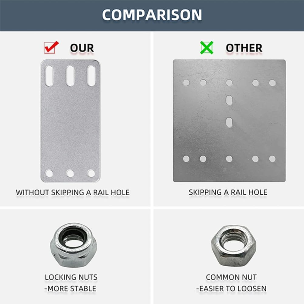 MATERIALE: piastra in acciaio di alta qualità, nessuna deformazione; Zincato per prevenire corrosione e ruggine. Dotato di dadi di bloccaggio per evitare che le viti si allentino a causa delle oscillazioni. APPLICAZIONE: Compatibile con tutti i comuni E-Track e X-Track universali. Queste piastre portanti sono adatte per supporti E-Track/X-Track singoli o multipli. FUNZIONE: Con il passare del tempo, l'e-track attaccato alla tavola di legno si allenterà o, se il carico è troppo pesante, l'e-track traballerà. In questo caso, è necessario collegare una piastra di supporto alla scheda per tenere in posizione la guida elettronica! NUOVO DESIGN: A differenza di altri, la nostra piastra posteriore si adatta perfettamente ai fori delle viti della guida elettronica senza saltare il foro della guida. Pertanto, le viti possono essere inserite in qualsiasi foro della guida per garantire un bloccaggio più stretto.