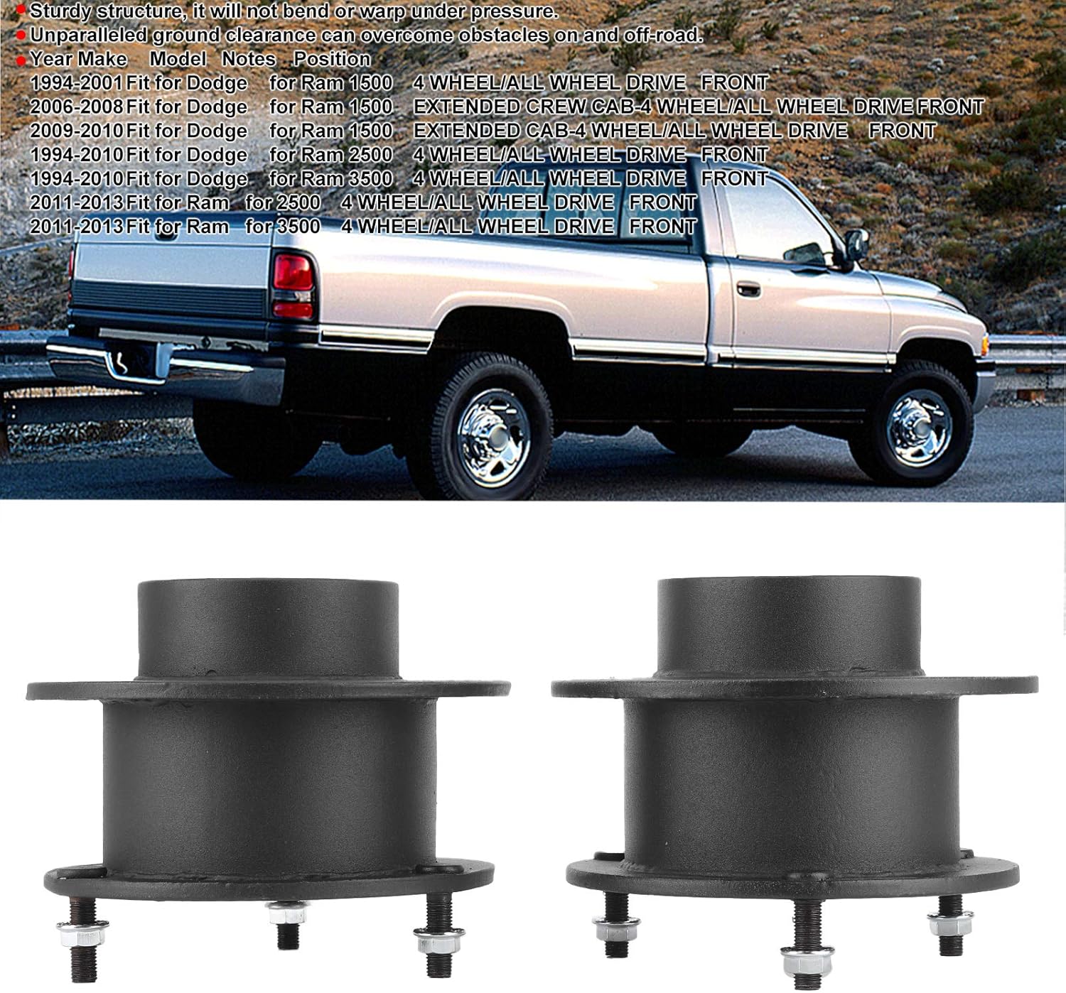 Anteriore da 3 pollici effettivi: questo kit di livellamento solleva il tuo veicolo di 3 pollici effettivi nella parte anteriore, fornendo esattamente l'altezza necessaria per raggiungere il livello desiderato sia su strada che fuoristrada. Adatto: parti pratiche adatte per 1500 2500 3500 4WD, garantendo un'installazione precisa e senza la necessità di ulteriori modifiche al sistema di sospensione del tuo veicolo. Costruzione in acciaio al carbonio: realizzato in acciaio al carbonio trattato termicamente e prodotto secondo specifiche precise. Questo kit offre la migliore durata e vestibilità in grado di resistere ai rigori della guida quotidiana e delle avventure fuoristrada Struttura robusta e durevole: la struttura robusta assicura che non si pieghi o si deformi sotto pressione e conferisce al tuo veicolo una sospensione migliorata che ha una durata di vita più lunga rispetto ad altri materiali inferiori Altezza da terra e stabilità migliorate: l'impareggiabile altezza da terra consente al tuo veicolo di superare vari ostacoli su e fuori strada mantenendo la stabilità durante la guida anche su terreni irregolari per mantenere