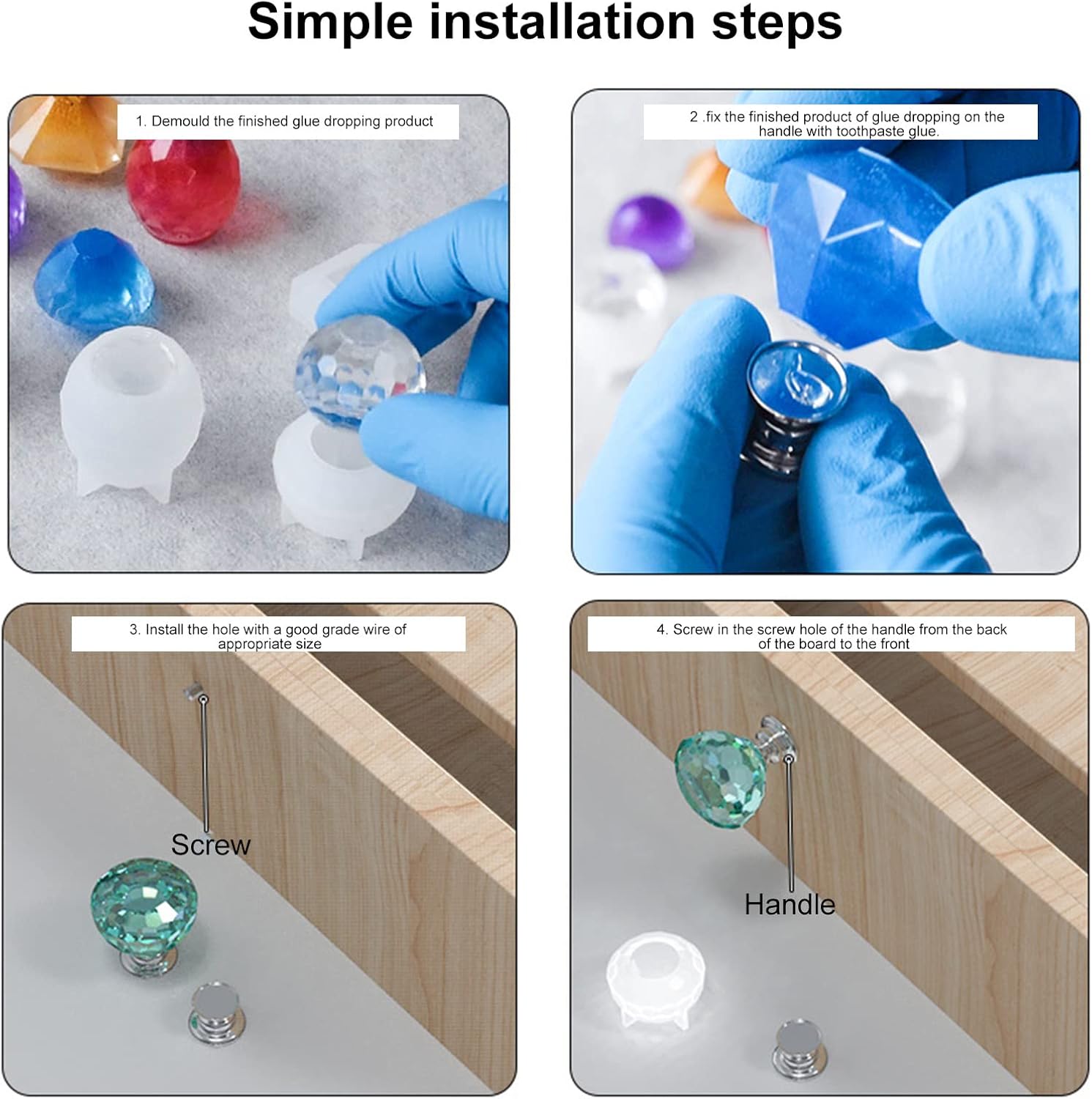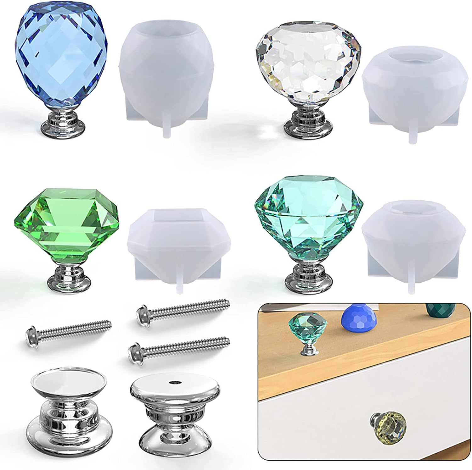 Pacchetto completamente attrezzato: riceverai 8 basi della maniglia del cassetto, 10 viti, 4 stampi Materiale riutilizzabile: il nostro stampo per la maniglia della porta è realizzato in materiale in silicone di alta qualità , resistente alle lacrime, non facile da deformarsi, con linee chiare, facili da demolire e pulire, può essere riutilizzato molte volte e il prodotto finito è luminoso come un diamante Semplice da realizzare: il nostro stampo è l'ultimo prodotto nel 2022, semplice e pratico. È necessario versare il materiale preparato nello stampo e attendere un po ', finalmente puoi sbucciare facilmente lo stampo dal prodotto finito Applicazioni di stampo a manopola: i nostri stampi sono adatti per gioielli e pendenti. Il prodotto finito è per tirare armadi, cassetti, cassetti e mobili che si adattano alla tua vita. Può anche essere usato come ornamenti e ornamenti