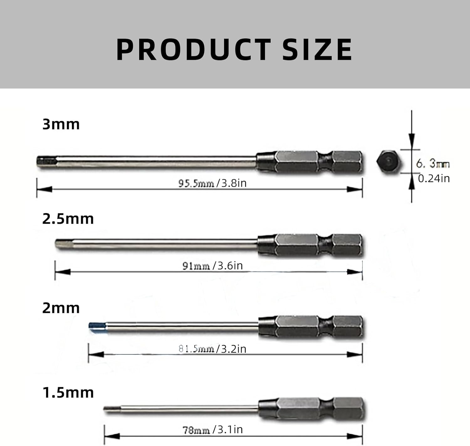 Include quattro teste di cacciavite esagonali nelle dimensioni 1,5 mm, 2,0 mm, 2,5 mm e 3,0 mm. Non importa se lavori sull'elettronica, assembli mobili o esegui riparazioni automobilistiche, questo set di cacciaviti è la tua soluzione per precisione e operatività L'ergonomia delle prestazioni offre comfort per un uso prolungato e costituisce un'aggiunta essenziale a qualsiasi kit di strumenti per qualità e praticità Adatto per appassionati, tecnici professionisti e hobbisti che richiedono uno strumento efficiente per i loro progetti, questo set soddisfa le esigenze di diverse competenze e applicazioni Scopri la durabilità con il nostro set di cacciaviti a rondella esagonale, realizzato in acciaio rapido per mantenere una resistenza superiore, perfetto per qualsiasi attività di riparazione