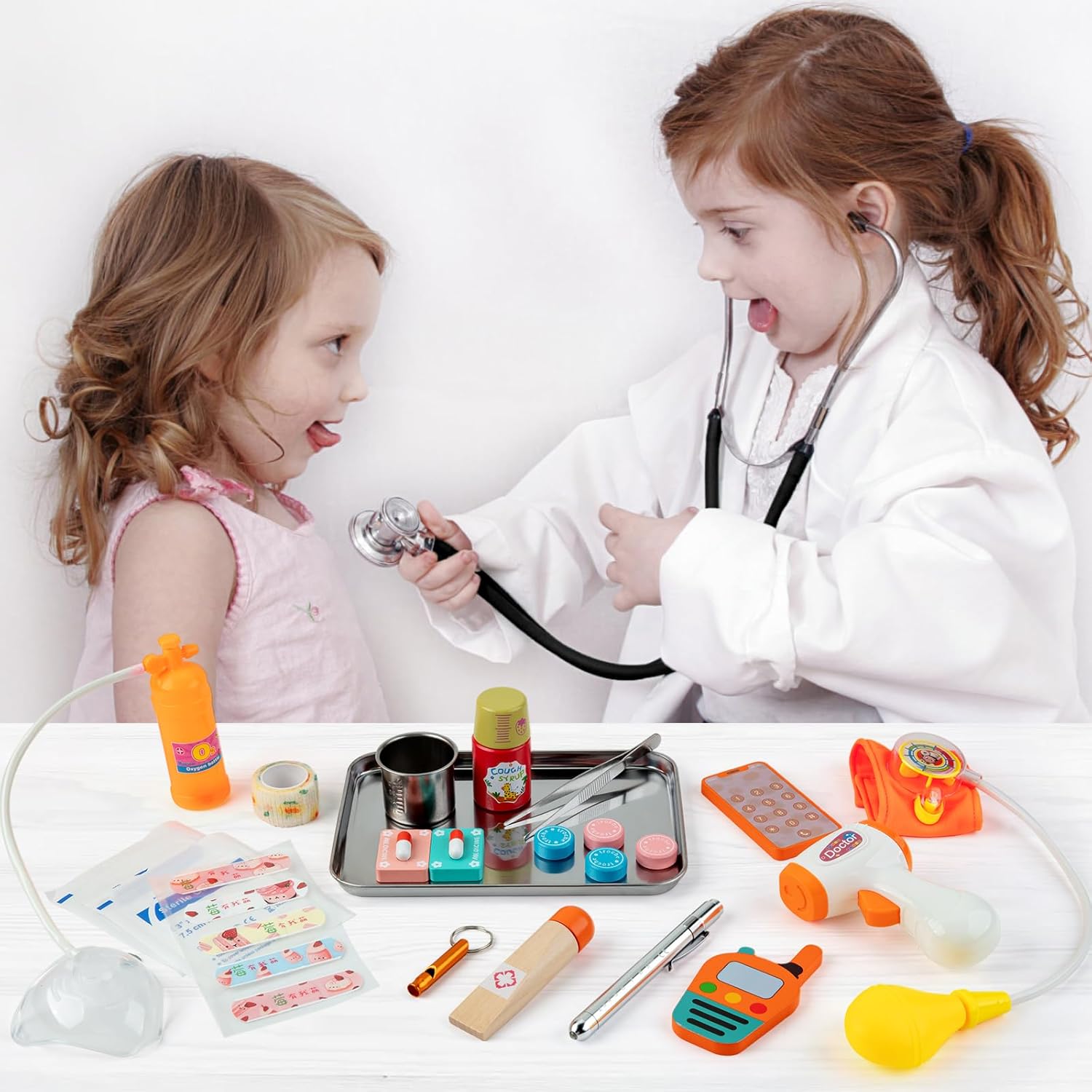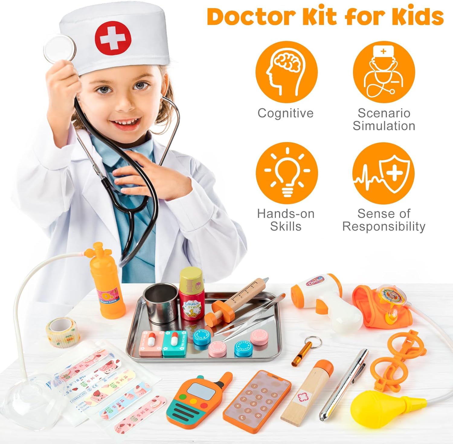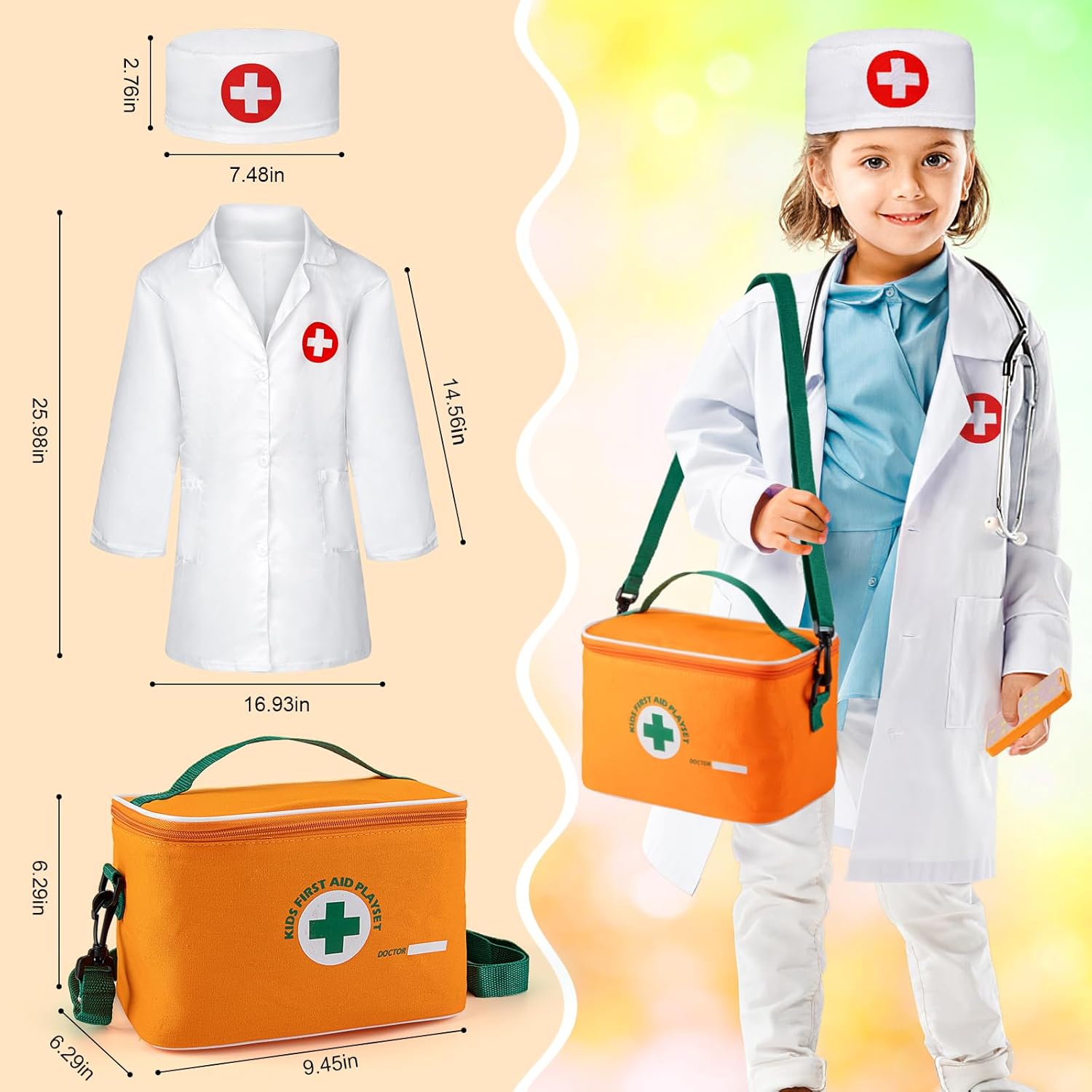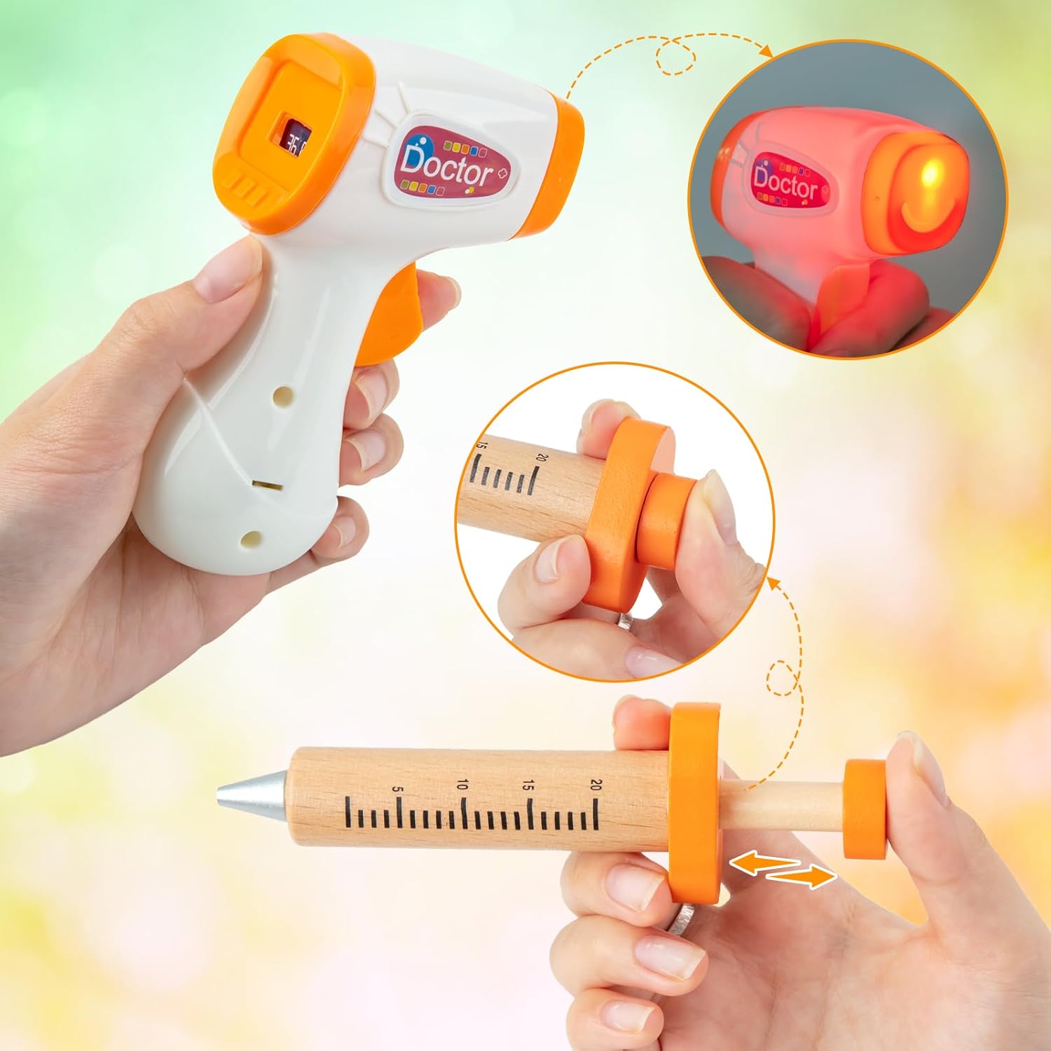 【Set Dottore Bambino】Questa kit medico per bambini dai 3 anni include: camice da dottore, cuffia da dottore, tessera del medico, stetoscopio giocattolo, misuratore di pressione per bambini, bombola d'ossigeno, siringa in legno, termometro frontale, torcia, walkie talkie, telefono giocattolo per bambini, pinzetta in metallo e altri accessori da dottore. I bambini possono giocare a fare finta di essere dottori, ricreare scene mediche e imparare a usare alcuni strumenti medici. 【Sicurezza e Non Tossicità】Questo set dottoressa bambina è realizzato in legno di alta qualità e resistente plastica ABS, garantendo che sia non tossico, privo di BPA e privo di odori sgradevoli. Questi strumenti sono stati levigati più volte, privi di spigoli taglienti, consentendo ai bambini di giocare in sicurezza e offrendo un'esperienza di gioco sicura e affidabile per i più piccoli. 【Giocattoli Educativi & Idee Regalo】Utilizzando il EFO SHM kit dottore bambini, nel corso del gioco dottore bambino, si simulano scene reali per sviluppare l'immaginazione, le capacità espressive, l'empatia e il coraggio dei bambini. Questo valigetta dottore consente loro di comprendere i passaggi di una visita medica di base e di imparare a usare alcuni strumenti medici. Aiuta a ridurre l'ansia e la nervosismo dei bambini nei confronti delle visite mediche. 【Facile da Conservare & Portatile】 Questo valigetta del dottore per bambini è dotato di una spaziosa borsa portaoggetti con manico e tracolla regolabile e rimovibile, comodo per riporre i giocattoli e portarli con te. È utile per aiutare i bambini a imparare come organizzare le loro cose. 【Acquisto Senza Preoccupazioni】 Riceverete: Una kit medico bambini a partire dai 3 anni. Se avete domande sul nostro borsa medica per bambini, non esitate a contattarci e vi forniremo un servizio clienti cordiale.