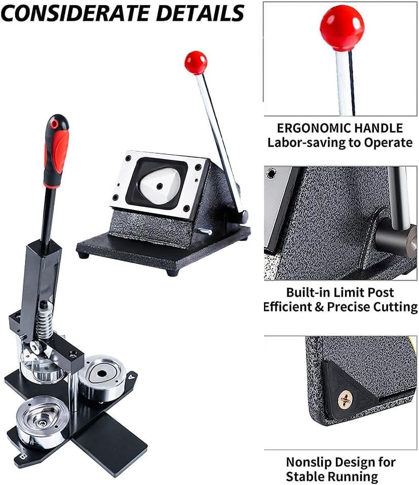 Costruzione durevole e di lunga durata: realizzato in acciaio di alta qualità e lega di alluminio, questo kit per la creazione di badge è costruito per durare. I suoi componenti in acciaio inossidabile e il corpo macchina integrato con design dello stampo non solo garantiscono la durata, ma lo rendono anche leggero e facile da maneggiare. Materiali di qualità professionale per badge di alta qualità: la pressa per badge è realizzata con materiali ad alta durezza, con un corpo in ghisa e una base in metallo per robustezza e longevità. La sua struttura ben congegnata promette un funzionamento sicuro e la produzione di badge premium. Processo di creazione di badge semplificato: produci facilmente badge posizionando una copertura, un'immagine e una pellicola metallica nello stampo A, allineandolo con lo stampo superiore tramite la piastra girevole rotante e inserendo un perno nello stampo B per l'allineamento. Questo processo garantisce risultati di alta qualità con il minimo sforzo. Kit completo di avviamento: questo kit include una macchina in lega di alluminio, un set di stampi in metallo, 1 taglierina e 100 set di materiali per badge insieme a 100 immagini vuote. Tutto ciò di cui hai bisogno per iniziare a creare badge dall'aspetto professionale è proprio qui in un unico pacchetto. Versatile per vari usi: ideale per creare bottoni a spillo, fascette, badge da appendere e molto altro ancora. Che si tratti di feste, campagne, scopi educativi o divertimento personale, questa macchina soddisfa una vasta gamma di esigenze creative e promozionali.