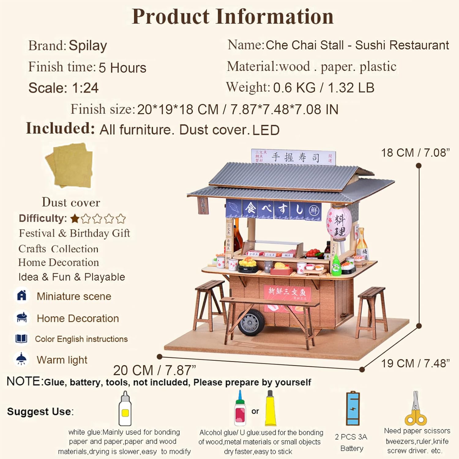Questo splendido kit fai da te per una casa delle bambole in miniatura è un regalo perfetto per compleanni, Natale o San Valentino: è creativo e premuroso. La casa delle bambole completata è in scala 1:24, misura 34 x 25 x 26 cm e pesa circa 2,5 kg, il che la rende compatta e raffinata, perfetta per essere esposta. Le luci LED integrate e il carillon aggiungono un tocco caldo e invitante alla casa delle bambole, e la copertura antipolvere inclusa protegge efficacemente il modello dalla polvere. Trascorrere unora al giorno ad assemblare il kit è rilassante e sviluppa la pazienza, portando infine a una casa in miniatura davvero straordinaria. Il montaggio richiede colla liquida al silicone e due batterie AAA (non incluse a causa di restrizioni di spedizione). Si prega di prepararle in anticipo per un completamento senza intoppi.