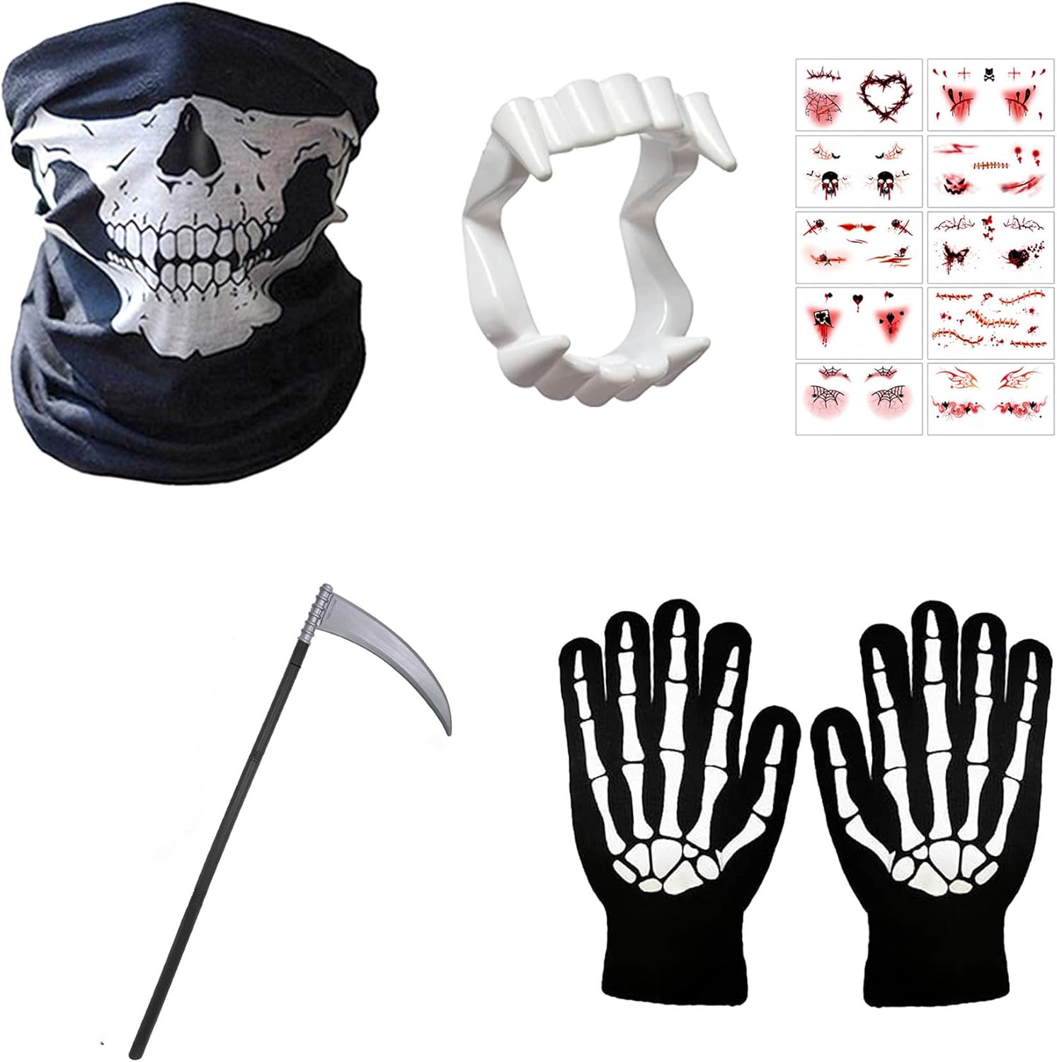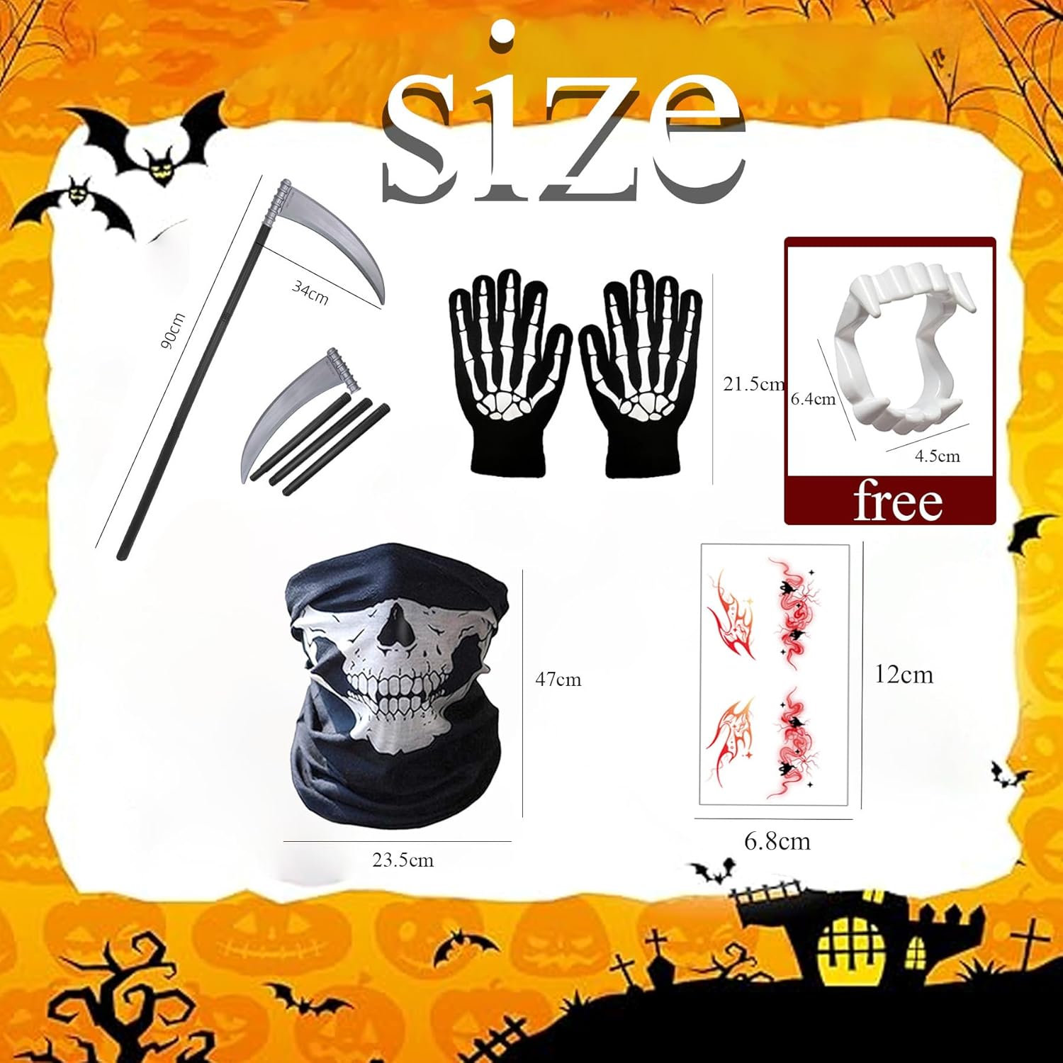 Set Spectral Complet - Guanti ossei articolati, passamontagna cranica 3D, falso di mietitore 85 cm Tecnologia Comfort: la maglia termo-regolata evita il sudore, polsini elastici per una vestibilità perfetta durante le serate prolungate. Bonus Professionals - Denti vampiri regolabili + adesivi "ferite spettrali" aderenti alla pelle/vetro/metallo. Versatilità Decorativa - Crea statue fantasma sospese, scene indoor infestate o decorazioni da giardino raccapriccianti. Resistenza esperta - PVC infrangibile (da -15°C a 60°C), lavabile in lavatrice a 30°C