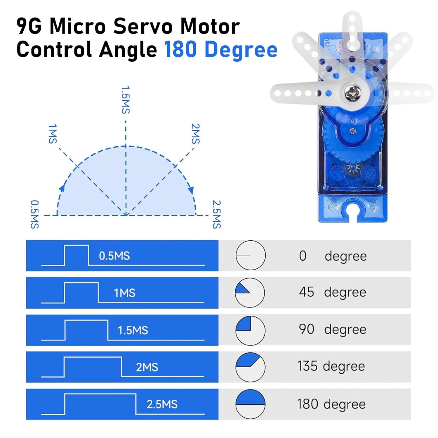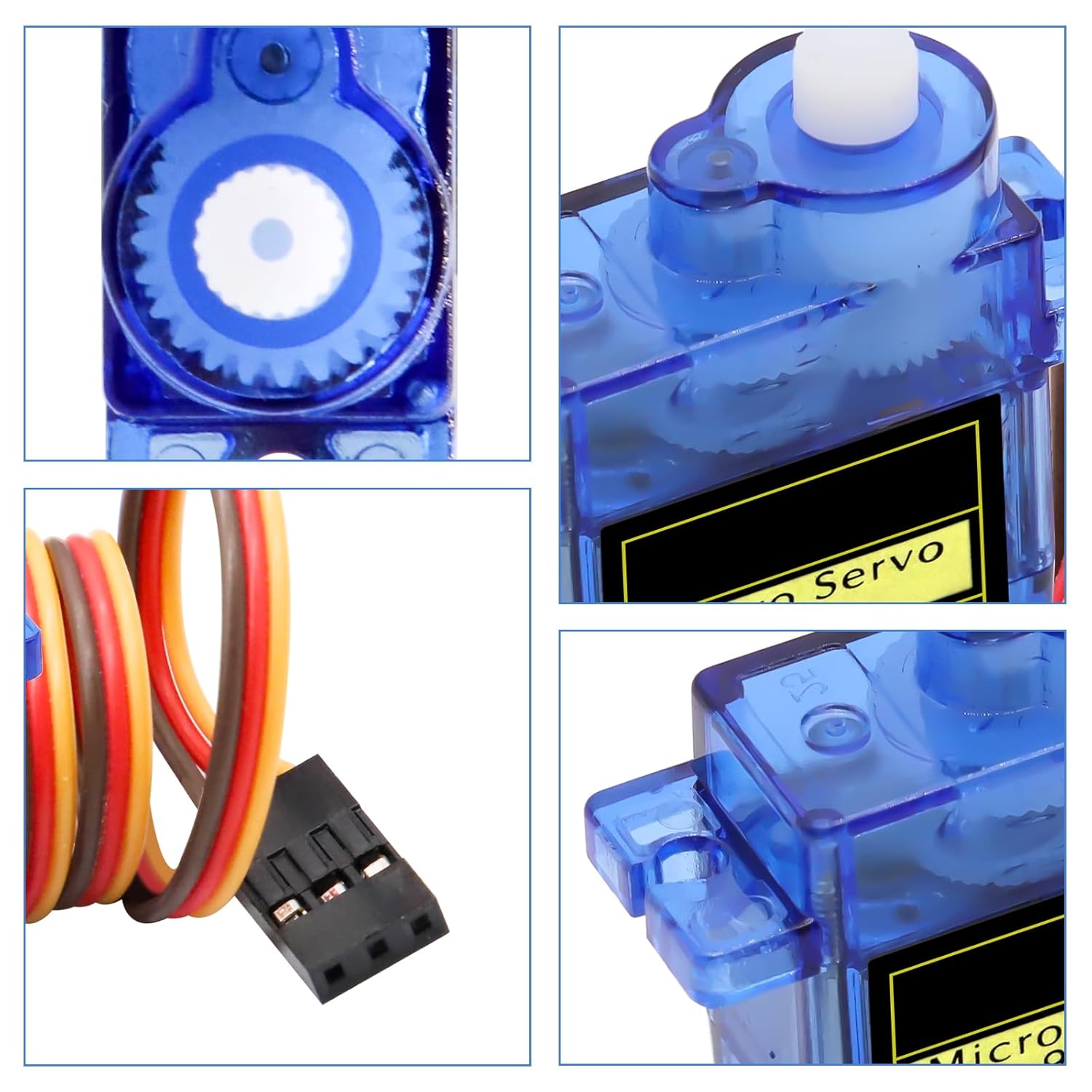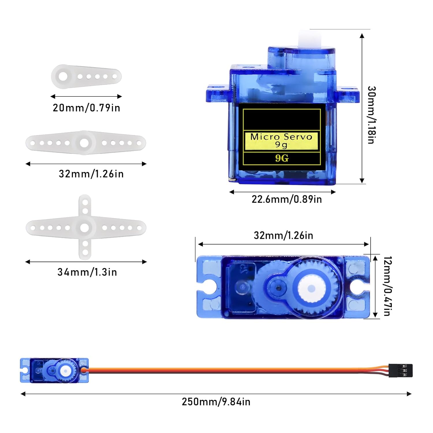 Design ultraleggero: il microservomotore 9G è leggero e adatto per piccoli progetti fai da te, in particolare per dispositivi remoti e robot. Controllo ad alta precisione: utilizza un motore ad alte prestazioni e ingranaggi interni precisi per garantire una risposta d'azione uniforme e stabile. Tipo di interfaccia: compatibile con interfacce JR e FUTABA. Velocità di marcia (senza carico): 0,09 ± 0,01 sec./60° (4,8 V) 0,08 ± 0,01 sec./60° (6V). Angolo di funzionamento: 180 gradi. Coppia di arresto (4,8 V): 17,5 oz/in (1 kg/cm). Regolazione nastro morto: 7 ms. Tipo di amplificatore: Controller analogico. Tensione di esercizio: 4,8 V~6,0 V 【Multiuso】 Ampiamente usato in bracci robotici telecomandati, robot da corsa, aeromobili, barche telecomandate e automobili e altre scene per soddisfare una varietà di esigenze creative.
