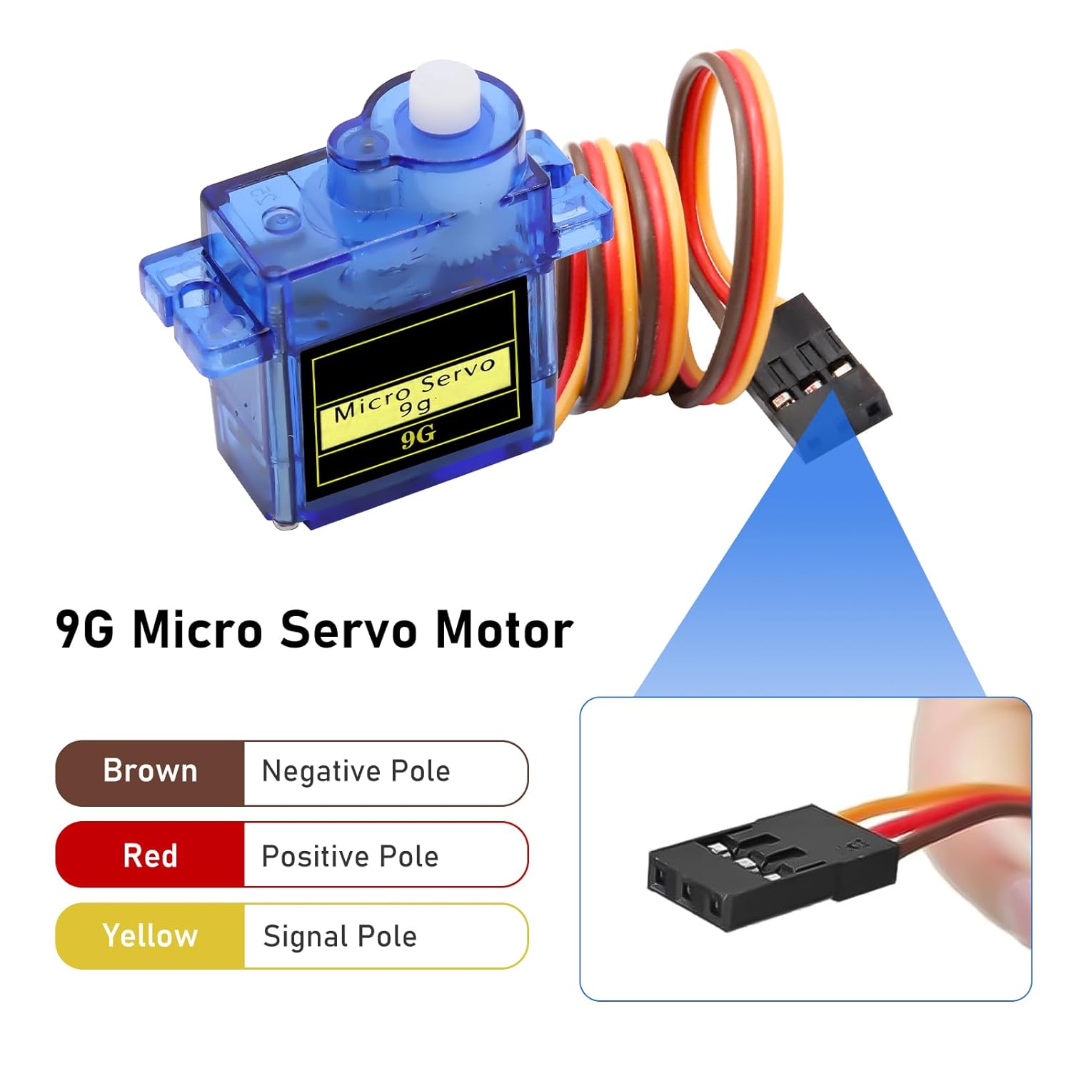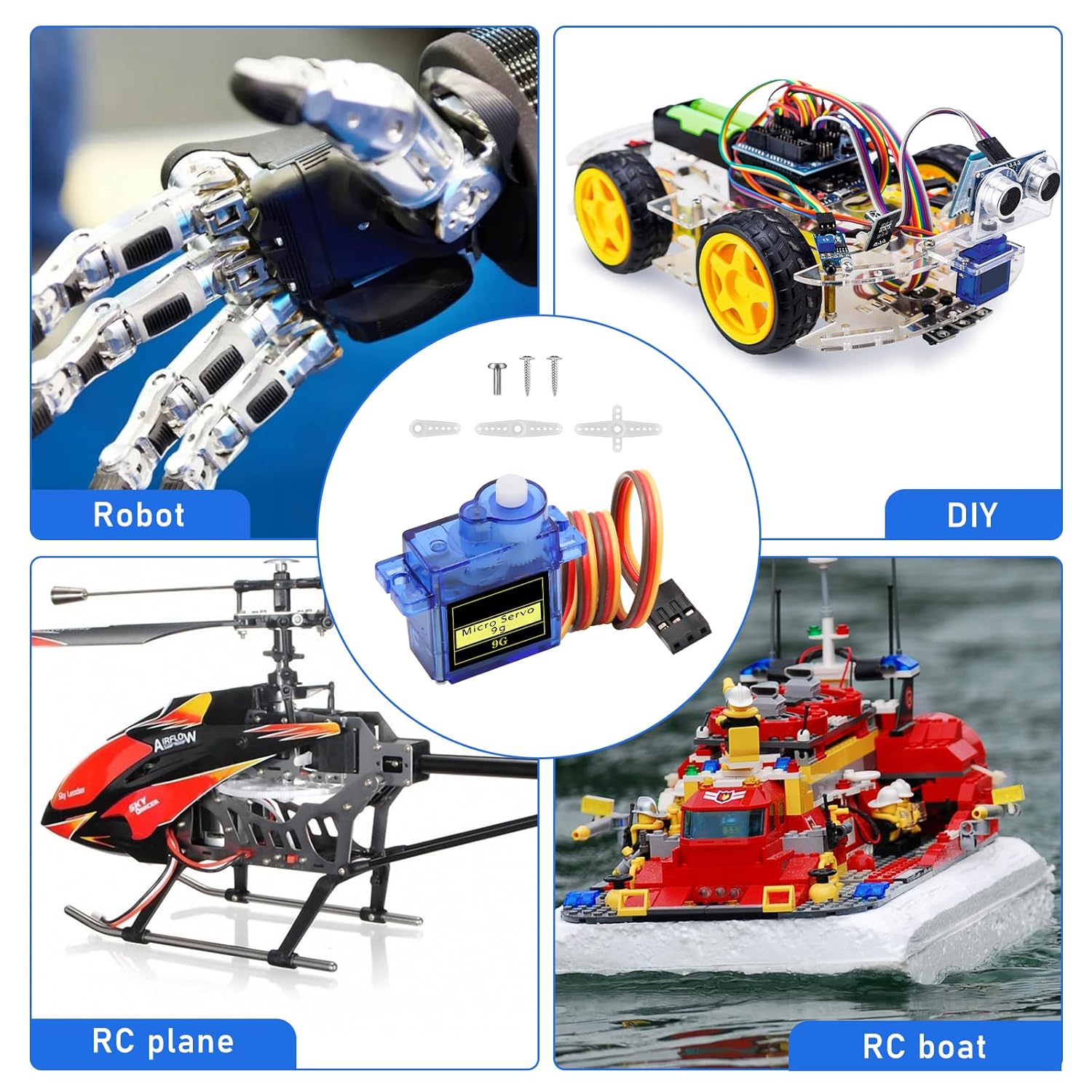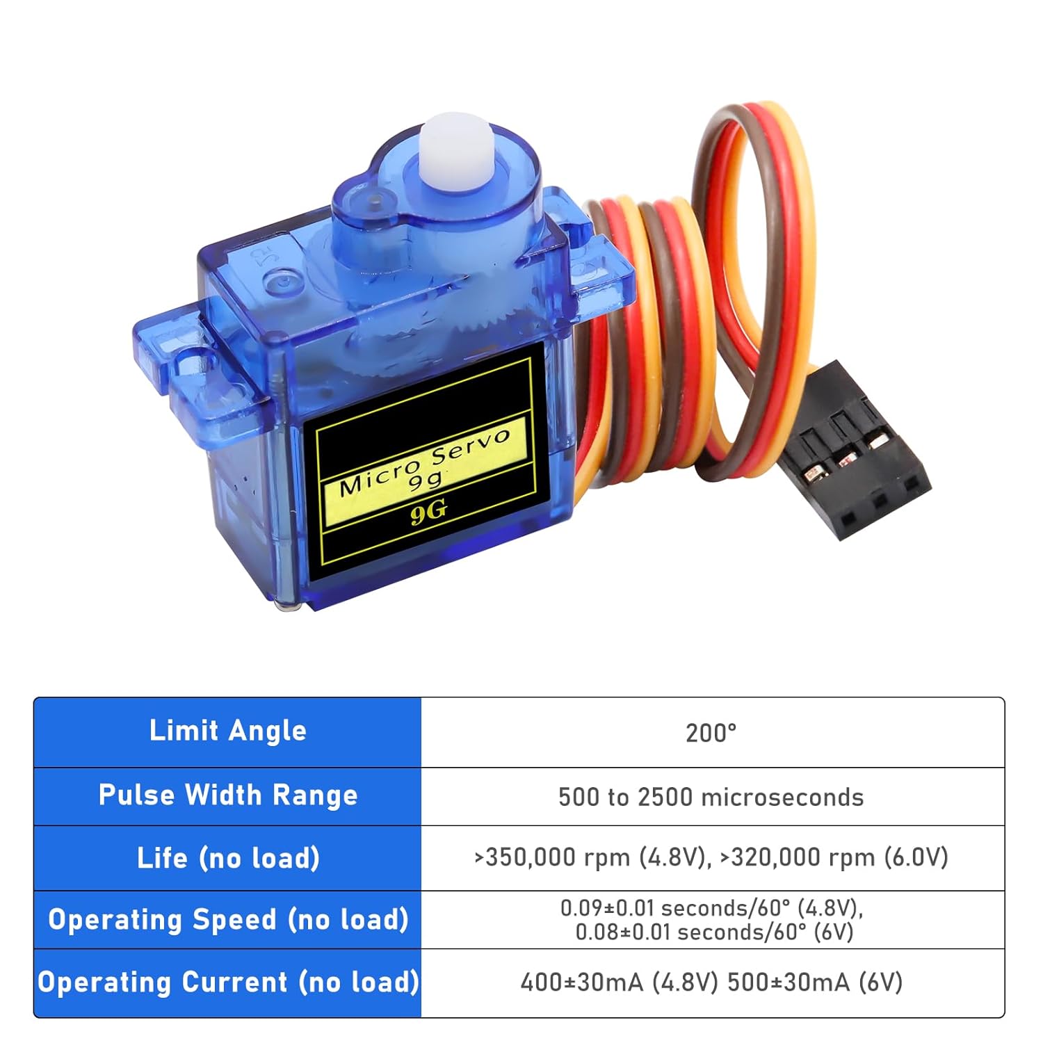 Design ultraleggero: il microservomotore 9G è leggero e adatto per piccoli progetti fai da te, in particolare per dispositivi remoti e robot. Controllo ad alta precisione: utilizza un motore ad alte prestazioni e ingranaggi interni precisi per garantire una risposta d'azione uniforme e stabile. Tipo di interfaccia: compatibile con interfacce JR e FUTABA. Velocità di marcia (senza carico): 0,09 ± 0,01 sec./60° (4,8 V) 0,08 ± 0,01 sec./60° (6V). Angolo di funzionamento: 180 gradi. Coppia di arresto (4,8 V): 17,5 oz/in (1 kg/cm). Regolazione nastro morto: 7 ms. Tipo di amplificatore: Controller analogico. Tensione di esercizio: 4,8 V~6,0 V 【Multiuso】 Ampiamente usato in bracci robotici telecomandati, robot da corsa, aeromobili, barche telecomandate e automobili e altre scene per soddisfare una varietà di esigenze creative.