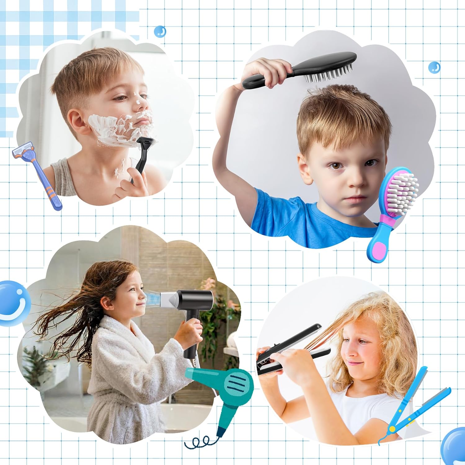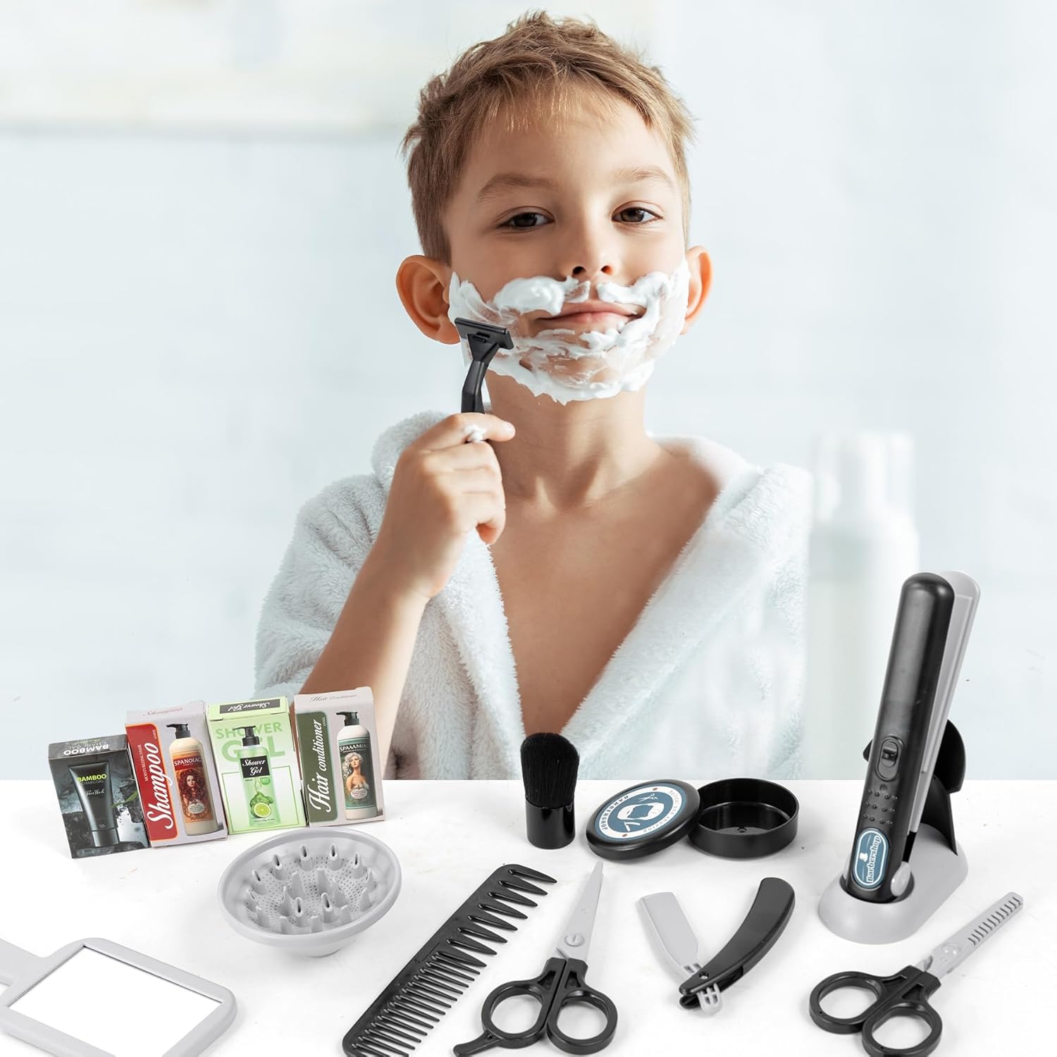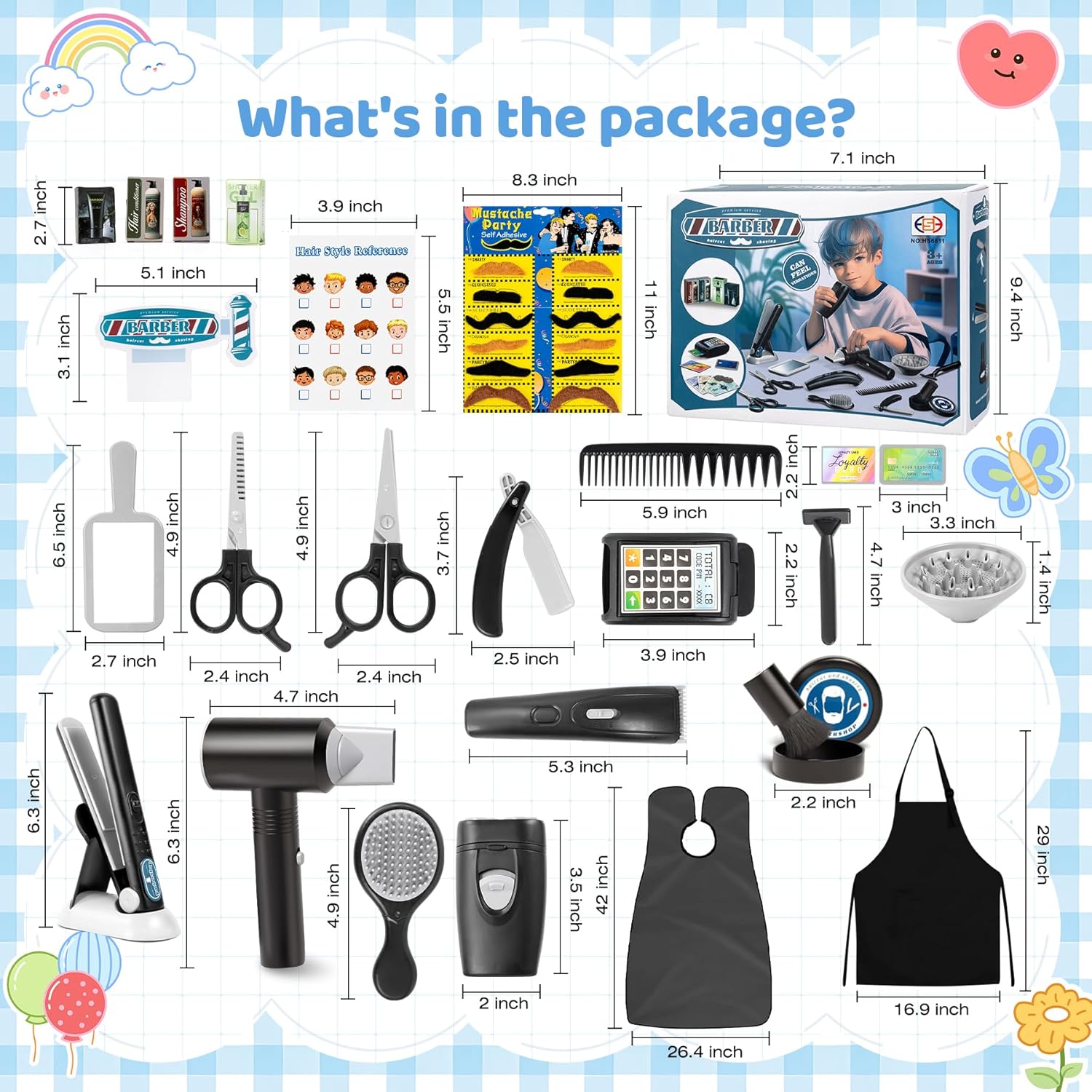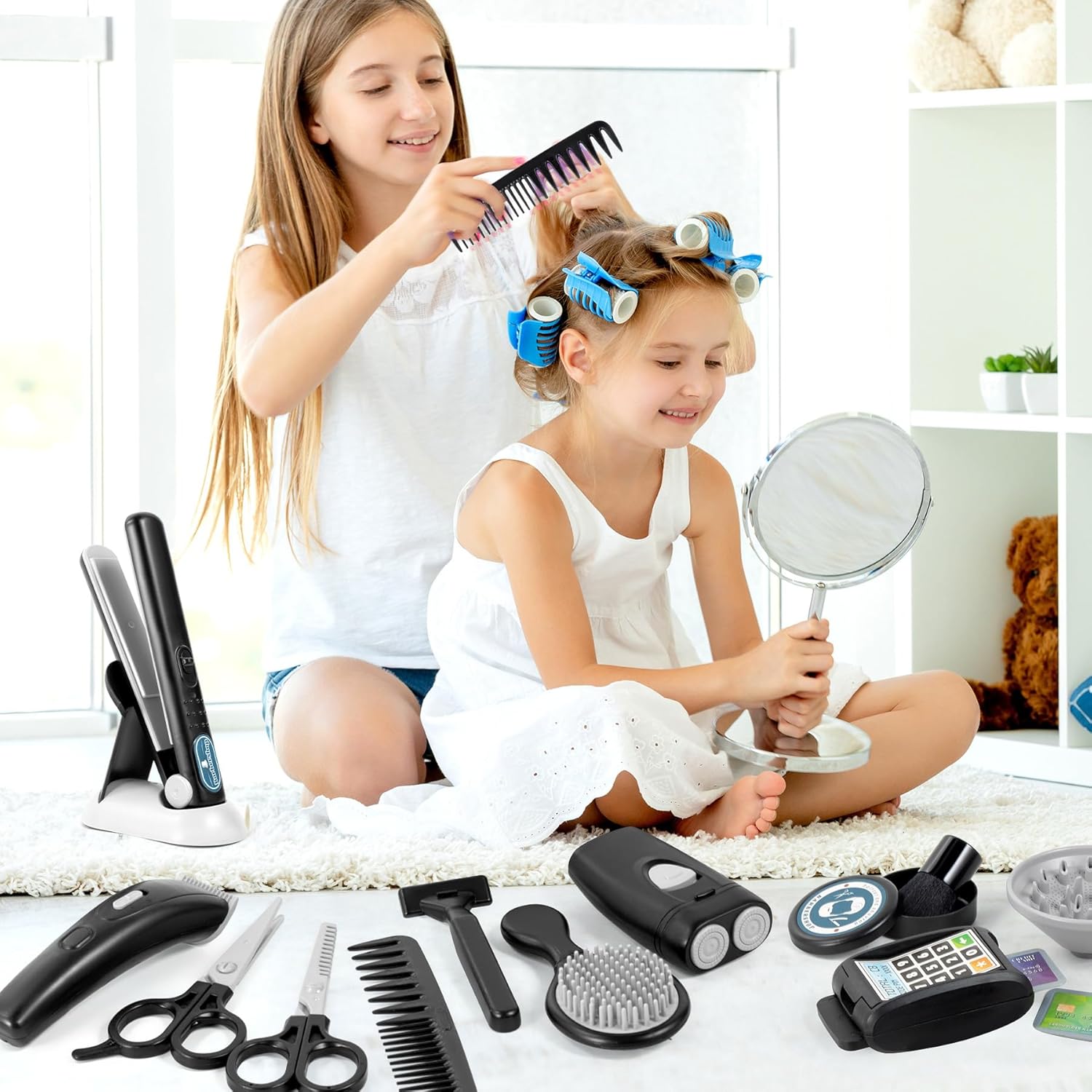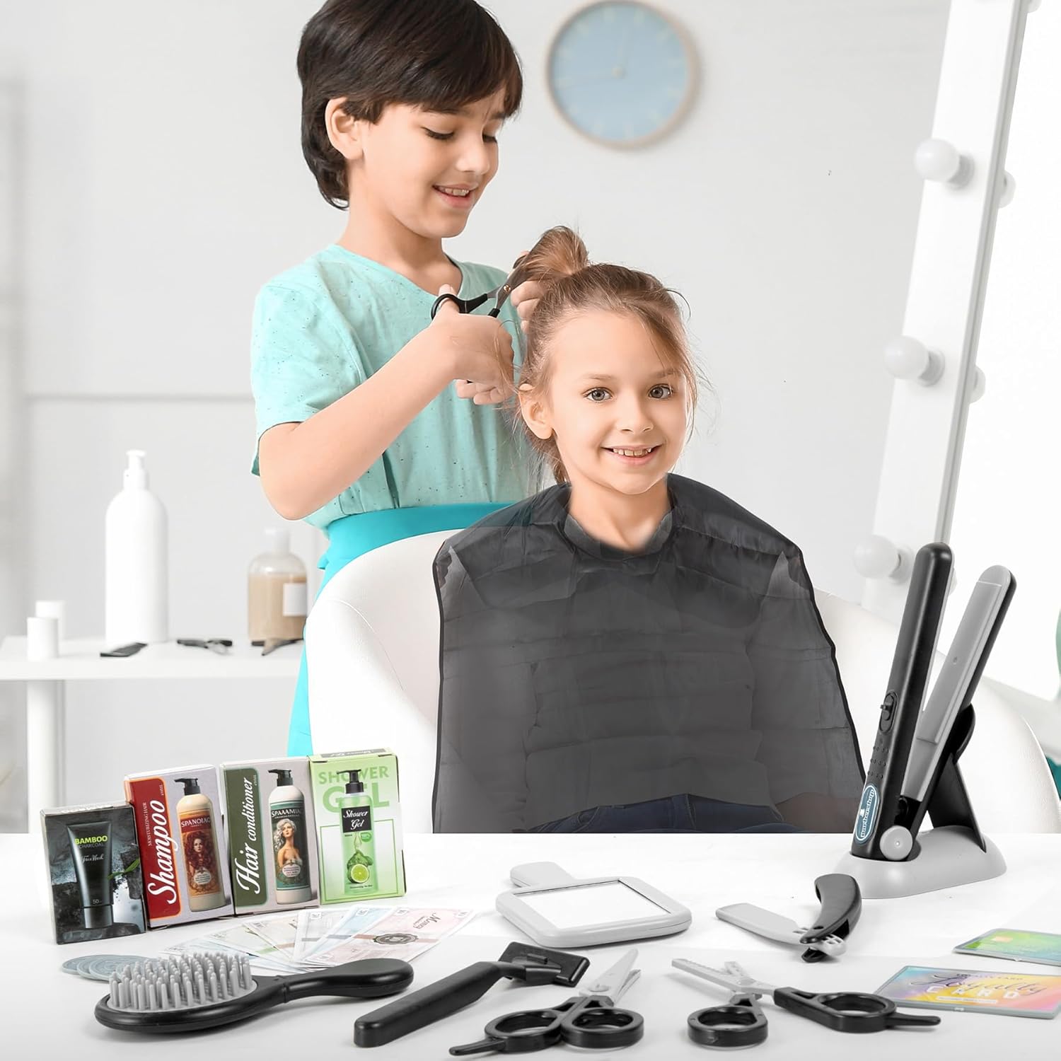 💈Tantissimi accessori e molteplici modalità di gioco: Set da Gioco Parrucchieri include rasoio, asciugacapelli, piastra per capelli, specchio, pettine, forbici da parrucchiere, mantello da parrucchiere, spazzola per il trucco e baffi finti, ecc. che consentono ai bambini di simulare a piacimento tutti i tipi di scenari del salone di parrucchiere. Carte di credito, banconote, monete e un lettore di carte aggiungono il divertimento di gestire un salone da parrucchiere e stimolano l'immaginazione e la creatività del bambino. 💈 Effetti sonori realistici per un gioco di ruolo coinvolgente: l'asciugacapelli e il rasoio possono essere dotati di batterie AA (le batterie non sono incluse in questo prodotto) e, quando sono dotati di batterie, producono suoni estremamente realistici che ricordano il funzionamento di un vero salone da parrucchiere, offrendo al bambino un'esperienza di gioco di ruolo coinvolgente e aumentando il divertimento del gioco. 💈 MATERIALE SICURO, CURA DELLA SALUTE DEI BAMBINI: Set Parrucchiera e Trucchi è realizzato in materiale sicuro, non tossico e rispettoso dell'ambiente, tutti gli accessori hanno bordi lisci e non presentano bave, il che garantisce la sicurezza dei bambini durante il gioco e mette i genitori a proprio agio, ed è una scelta affidabile per i bambini per iniziare il viaggio del loro sogno di diventare parrucchieri. 💈Regalo creativo per trasmettere gioia: che sia per compleanni, feste o come ricompensa quotidiana, Kit di Bellezza e Parrucchiere per Bambini è un'ottima scelta regalo. Set da Parrucchiere per Bambini non solo porta gioia infinita ai bambini, ma esercita anche le loro capacità di gioco, il che è un regalo divertente e significativo. 💈Stimolare le molteplici potenzialità e facilitare la crescita: quando giocano, i bambini usano forbici, pettini e altri accessori per esercitare i movimenti fini della mano e la coordinazione occhio-mano; giocano a fare i parrucchieri e i clienti per migliorare l'espressione linguistica e le abilità sociali; e disegnano acconciature per stimolare l'immaginazione e la creatività. Set di Parrucchieri per Bambini è un buon partner per la crescita e stimola le molteplici potenzialità dei bambini nel parco giochi.