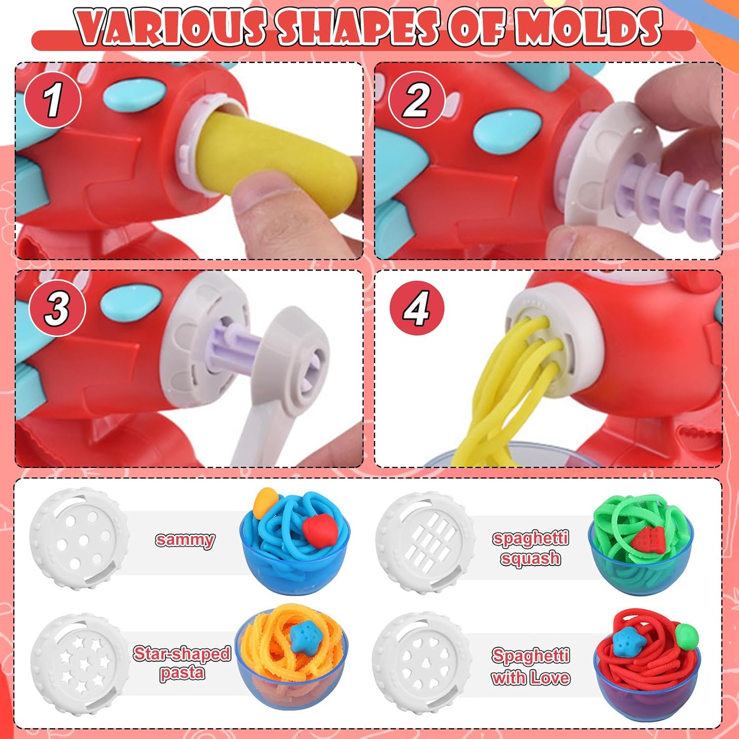 Kit plastilina: il kit plastilina contiene un totale di 47 accessori: 12 scatole di plastilina, macchina per pasta a forma di cartone animato, macchina per gnocchi, macchina per panini, una varietà di forme di frutta e posate, ecc. Esistono molti strumenti per impastare per soddisfare le esigenze di produzione dei bambini. Argilla da modellare fai-da-te: l'argilla da modellare è di colore chiaro e ha una buona consistenza che può essere facilmente modellata in qualsiasi forma, in modo che i bambini possano liberare la loro immaginazione, creare forme uniche e godersi una giornata di divertimento. Macchina per la pasta per bambini: la macchina per la pasta all'interno del kit di plastilina è un'ottima funzionalità. Basta aprire il coperchio sulla parte anteriore della macchina per la pasta, riempire l'impasto, chiudere il coperchio, girare indietro la maniglia e si crea una bella pasta. I bambini adoreranno giocare con il giocattolo educativo: il kit Playdough offre una varietà di giochi creativi. I bambini possono utilizzare diversi strumenti per creare una varietà di cibi o altri modelli creativi in base alle proprie preferenze, migliorare le proprie abilità pratiche, migliorare le proprie capacità di pensiero e sperimentare appieno la propria immaginazione durante il gioco. Miglior regalo: questo kit di pasta da gioco è perfetto per i bambini dai 2 anni in su come regalo per compleanni, Natale, feste e celebrazioni. È un regalo ideale per i bambini a cui piace giocare a giochi di cucina o giochi di ruolo