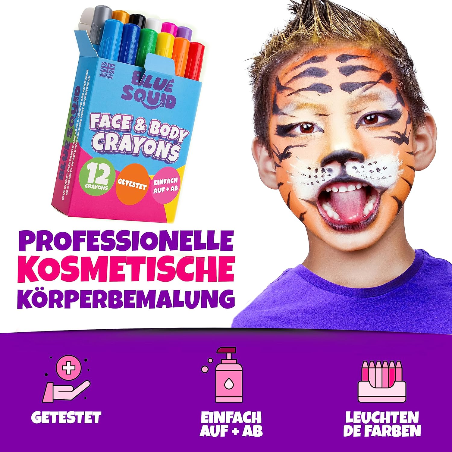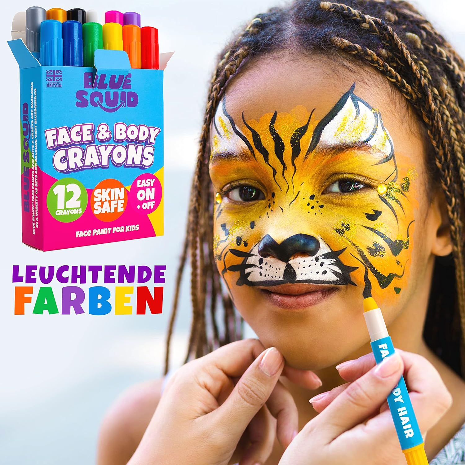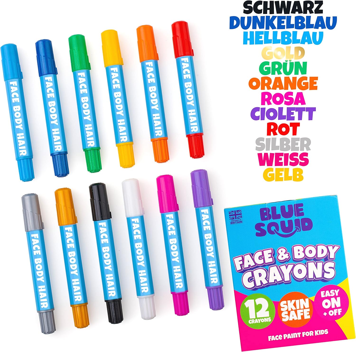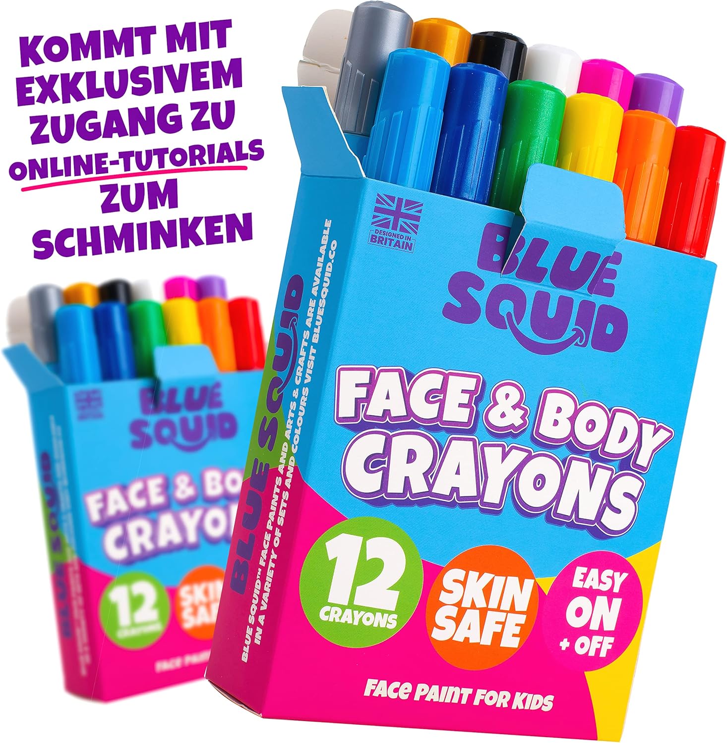FACILE DA USARE ZERO PULIZIA: i pastelli rotanti dipingono matite colorate senza bisogno di acqua, basta spazzolare le matite colorate direttamente sulla tua piccola pelle. Con il prodotto per body painting più pulito, senza macchie e senza pulizia disponibile. COLORI AMAZIN - Dipinti con un arcobaleno e non è tutto A differenza di prodotti simili, i bastoncini di pittura per il viso della migliore qualità sono 2 volte più grandi (14 cm) con abbastanza vernice per colore da poter essere utilizzati per oltre 80 volti. Ideale per scuola, chiesa, festival, carnevali, celebrazioni, feste di compleanno, calcio e altri eventi sportivi, spettacoli teatrali, giochi di ruolo DIVERTIMENTO PER IL TRUCCO SICURO DEI BAMBINI - I colori per il viso Blue Squid dei tuoi bambini sono cosmetici professionali di alta qualità, ipoallergenici, senza parabeni, non tossici e conformi alla FDA, il che li rende ideali per i bambini con pelle sensibile. Sono a base d'acqua, quindi pulire il viso è semplice e veloce come rimuovere la vernice con una salvietta per neonati o un panno e detersivo per i piatti. DIVERTITI CON I TUOI BAMBINI - Non devi essere un artista o un truccatore professionista per offrire ai tuoi bambini ore di divertimento creativo che non dimenticheranno mai con i loro kit per truccabimbi. Come cliente Blue Squid, avrai accesso immediato a un'entusiasmante guida online alla pittura del viso per bambini con video passo dopo passo che ti mostrano come realizzare tutti i tipi di fantastici disegni di pittura per il viso. GARANZIA DI SODDISFAZIONE AL 100% - Abbiamo completa fiducia nella qualità delle nostre vernici per il viso. Se hai qualche dubbio o non sei completamente soddisfatto, siamo qui per aiutarti. Ti garantiamo che sarai soddisfatto del tuo acquisto. Ordina oggi in tutta tranquillità!