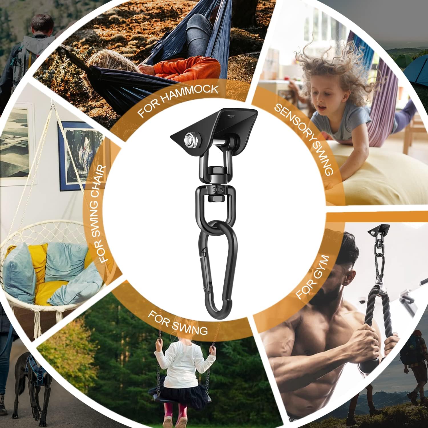 Cosa ottieni: 2 kit di sospensione in acciaio inossidabile, 4 viti in acciaio inossidabile, 4 bulloni in acciaio inossidabile e 2 ganci Super leggero e robusto: realizzato in acciaio inossidabile 304, capacità di carico 1200, perfetto per amache, sedie, letti, cestini, mobili, altalene Il gancio girevole consente una rotazione libera di 360°, speciale design silenzioso per altalene interne/esterne, sedia sospesa, altalena sensoriale, kit altalena per arredamento della camera dei bambini, sedia amaca, altalena, altalena amaca per bambini Facile da installare: viene fornito con bulloni/viti e moschettone, molto facile da montare e assemblare, avrai tutto il necessario per un'installazione facile e veloce Ideale per l'interno della tua casa e per patii, balconi, giardini, terrazze, giardini e piscine