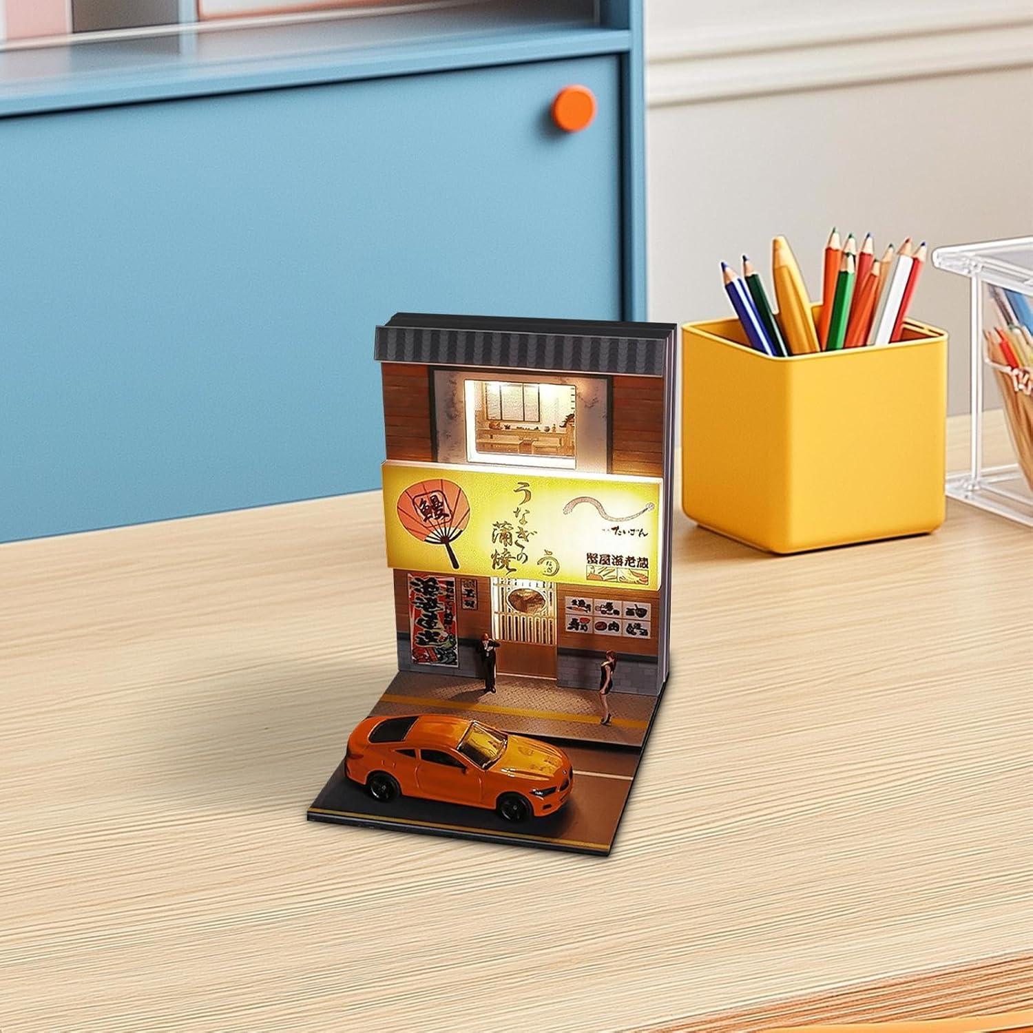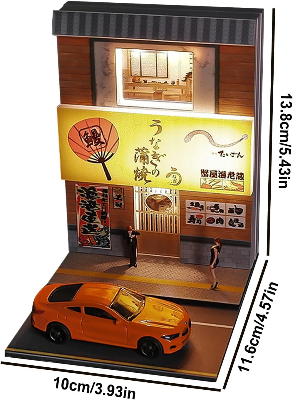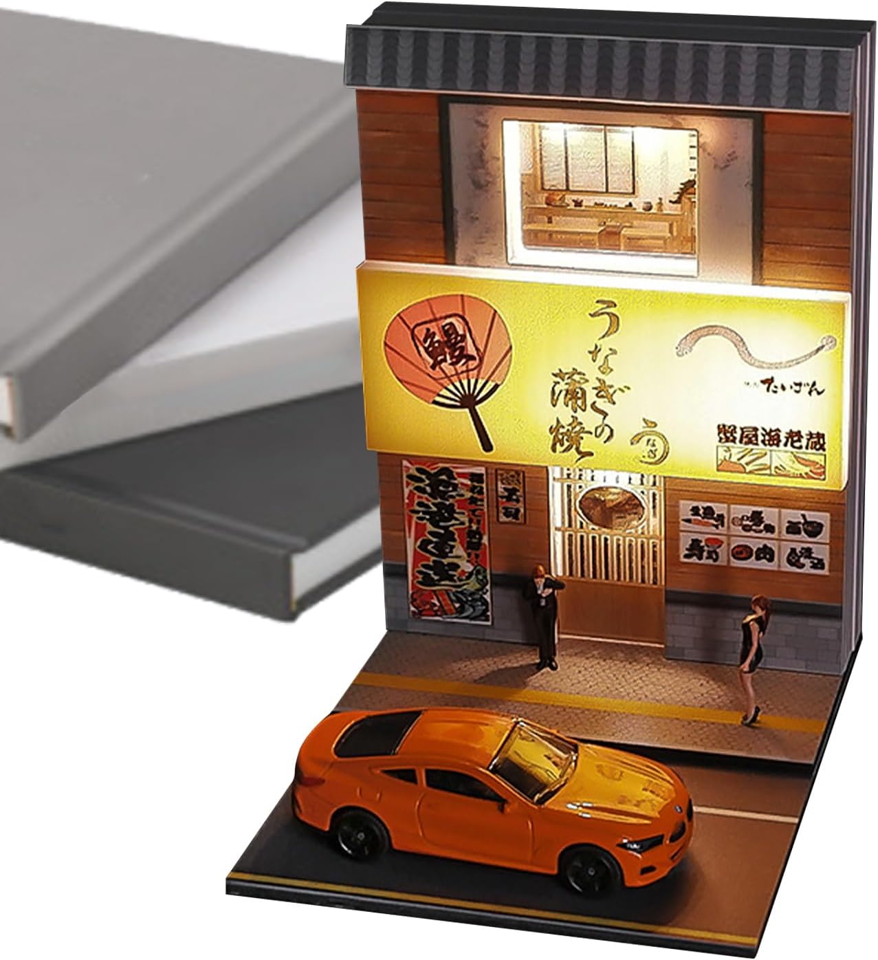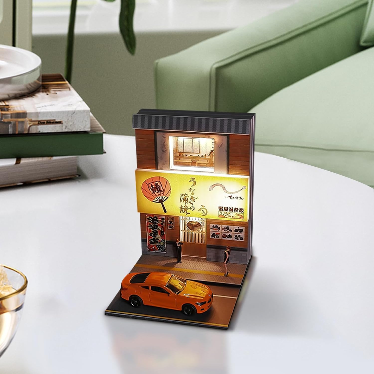 Illuminazione dettagliata: il sistema di illuminazione alimentato tramite USB assicura che il tuo modello illuminato risplenda magnificamente, mostrando dettagli sorprendenti della scena del sushi, anche in condizioni di scarsa illuminazione Realizzato con cura: la chiarezza ad alta definizione della grafica stampata UV su finestre e porte mostra dettagli meticolosi, attirando qualsiasi pubblico con squisito realismo Facile installazione: cavo dati per un controllo senza interruzioni dell'illuminazione, installazione rapida e posizionamento conveniente con nastro biadesivo per un display accattivante Regalo unico per adulti: queste case in miniatura sono l'aggiunta perfetta a qualsiasi ambiente, migliorando il tuo spazio e completando modelli di auto e action figure. Ideale per presentare i collezionisti 1:64 Sushi Restaurant Scene: Immergiti nella scena meticolosamente realizzata in scala 1:64 del ristorante di sushi, con fascino culturale giapponese e oggetti da collezione dettagliati