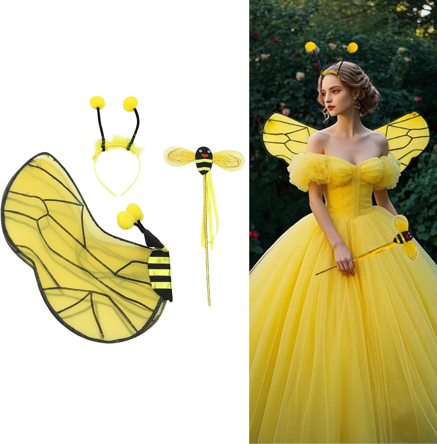 Kit per costume da api per bambini e adulti, bacchetta d'angelo, ala di farfalla, api, fascia per capelli per feste di Halloween, cosplay, puntelli Caratteristiche: Accessori per costume da api, ali di api, bacchetta magica, fascia per orecchie, elastico regolabile per adattarsi al set adatto per donne adulte, ragazze. Facile da indossare e da togliere, l'ala delle api con elastico in vita, si può indossare facilmente per vestire qualsiasi outfit. Materiali realizzati in stoffa, comodi, morbidi, leggeri da indossare, facili da spostare, cosplay e danza. Ampia gamma di applicazioni, è per festival all'aperto, feste a tema fiabe, costume di Halloween, fotografia, regali di compleanno per ragazze, spettacoli di danza, travestimenti da principessa delle fate, abbigliamento quotidiano, spettacoli scolastici. Meraviglioso regalo, è meglio sorprendere le donne adulte per feste di compleanno di Halloween e altre feste speciali, arriverà principesse sognanti. Specifiche tecniche: Materiale: tessuto. La confezione include: Kit costume api Nota: Si prega di considerare un margine di errore di 1-2 cm dovuto alla misurazione manuale. A causa delle differenze tra i diversi monitor, l'immagine potrebbe non riflettere esattamente il colore dell'articolo.
