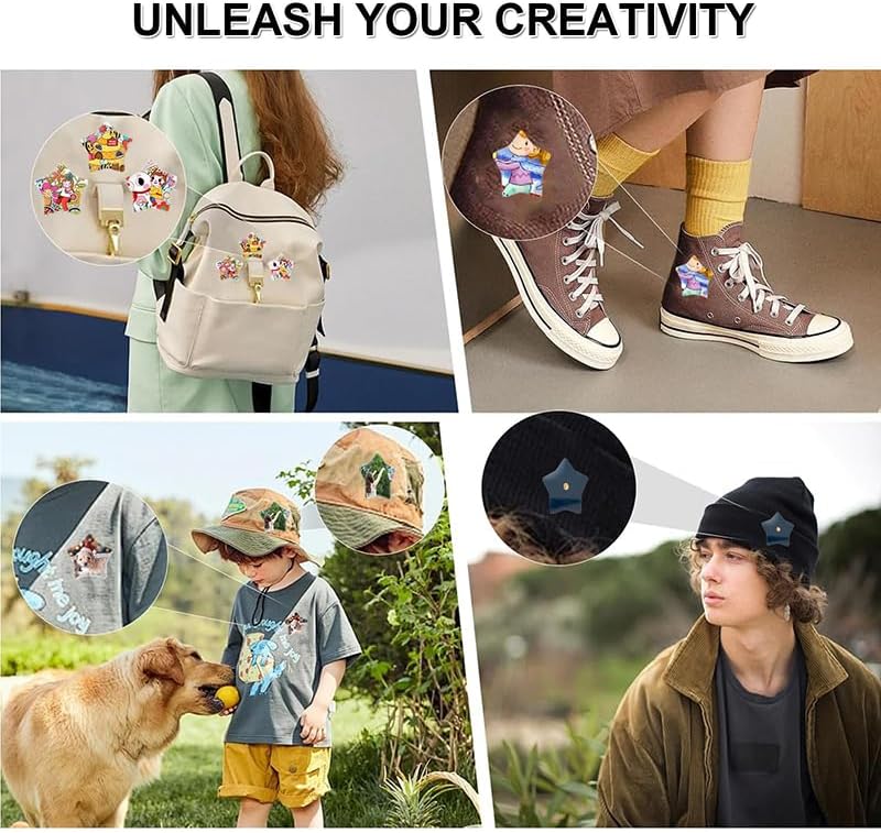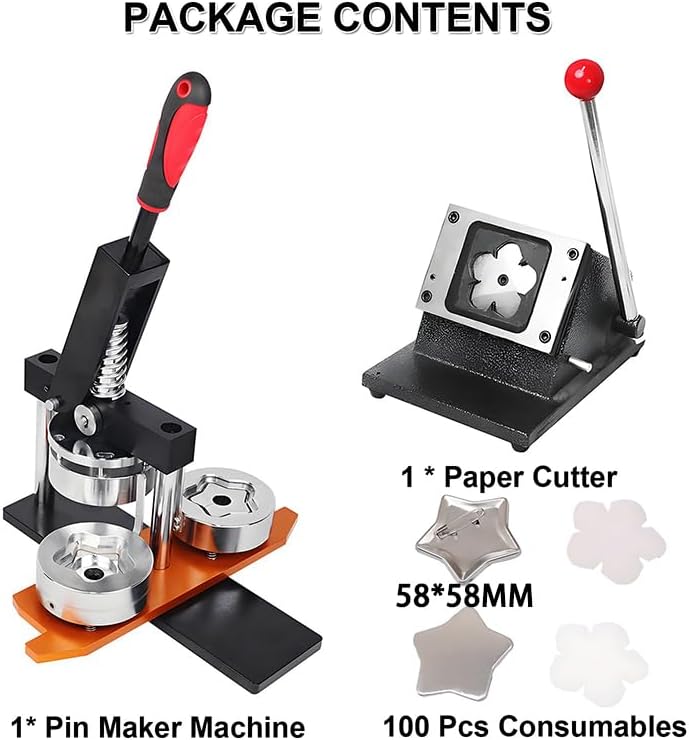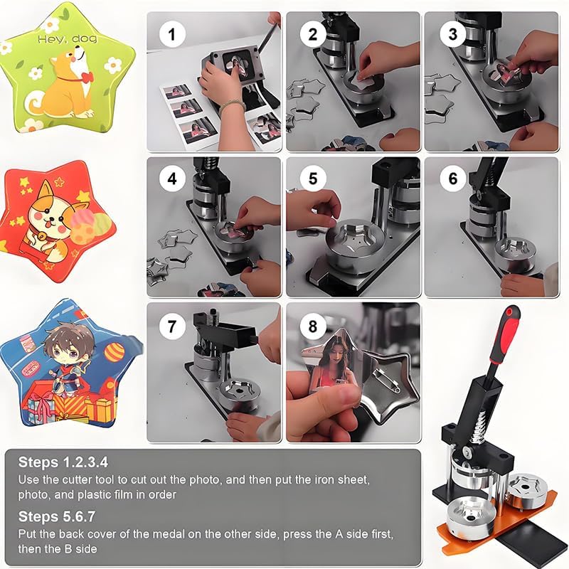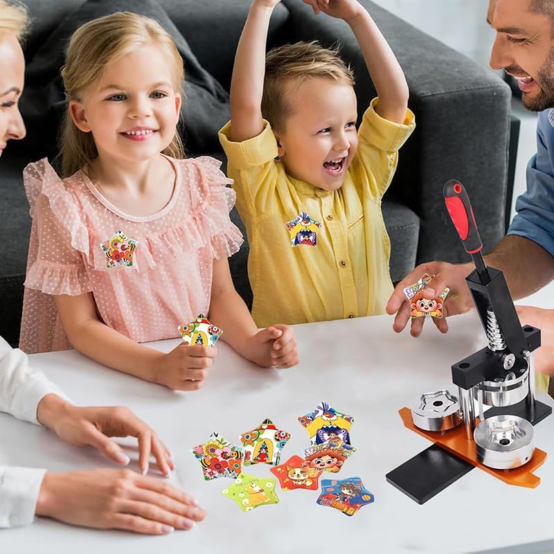Facile processo fai-da-te: basta mettere in ordine il foglio di ferro, la foto e la pellicola trasparente dopo il taglio, quindi premere con la piastra di supporto per completare il badge o la spilla personalizzata. Ideale per accessori personalizzati. 【Design a forma di stella】 Presenta un'esclusiva forma a stella a cinque punte, offre un aspetto più intricato e attraente rispetto ai tradizionali badge rotondi o quadrati, con bordi lisci per una finitura professionale. Supporto a perno migliorato: dotato di tecnologia avanzata di montaggio a perno per una maggiore precisione ed efficienza per garantire che i tuoi badge siano perfettamente posizionati e realizzati ogni volta. Kit iniziale completo: include 1 macchina per bottoni, 1 tagliacarte e 100 pezzi di materiale in modo da poter iniziare subito a creare badge per abbigliamento, cappelli, borse e altro ancora. 【Sviluppa la creatività】 Incoraggia i bambini a migliorare le loro abilità pratiche, immaginazione e creatività attraverso divertenti progetti fai-da-te, rendendolo un ottimo strumento educativo per i legami familiari.