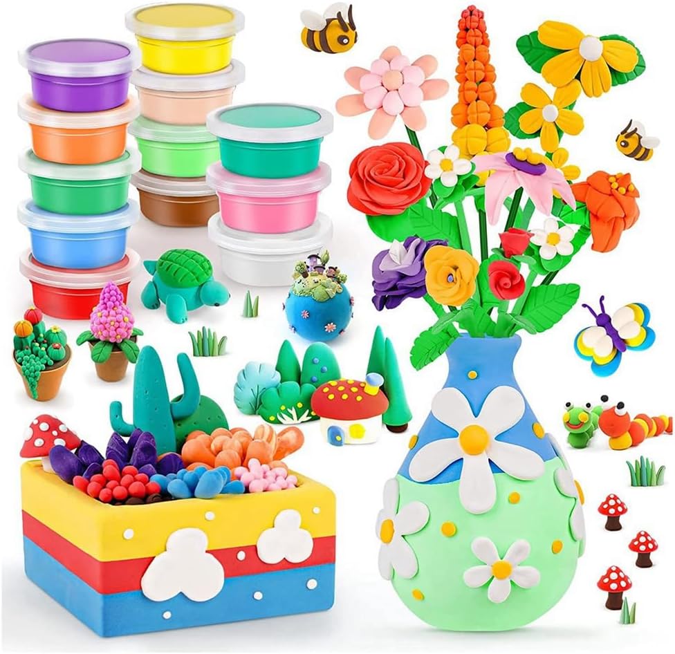 [Argilla modello sicura] L'argilla essiccata all'aria per bambini è morbida, non appiccicosa, sicura e non tossica. la casa: il kit floreale è ottimo come decorazione artistica, tu e i bambini organizzate una festa con gli amici, mettetelo sul tavolo o nella stanza dei giocattoli per renderlo più colorato. [Progetto ] DIY un kit completamente di argilla essiccata all'aria può ispirare i tuoi bambini a coltivare l'abilità pratica, l'immaginazione, la creatività e sviluppare capacità di pensiero. L'argilla essiccata all'aria è adatta anche agli adulti come giocattolo di intrattenimento e potrebbe essere un progetto molto interessante per i membri della famiglia. [ per bambini] Il kit di argilla artigianale include 1 rullo di argilla 3 strumenti per scolpire 1 vaso di legno10 colori di argilla essiccata all'aria, 12 steli di fiori. Le di design [Idea Design] forniscono istruzioni sul processo di progettazione con molteplici opzioni di stile, come mescolare liberamente l'argilla per creare nuovi colori, come realizzare pratiche con le foglie e vari tipi di fiori (girasole, giacinto). I lavoretti per ragazze dagli 8 ai 12 sono facili da usare seguendo il libro. [] Idea regalo e kit artigianale in argilla per bambini e adulti per realizzare il proprio kit di argilla essiccata all'aria e inviarlo a famiglie, amici, insegnanti o compagni di classe.