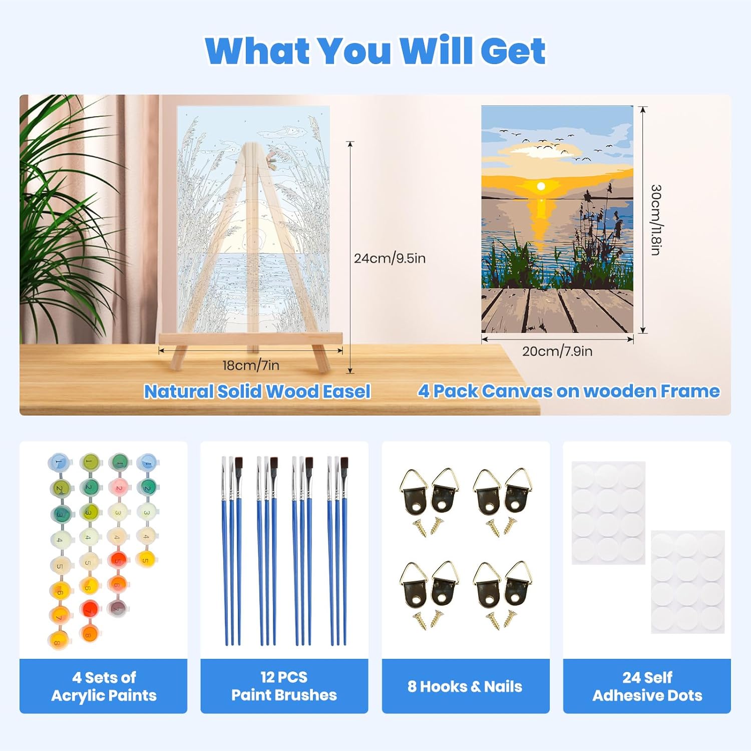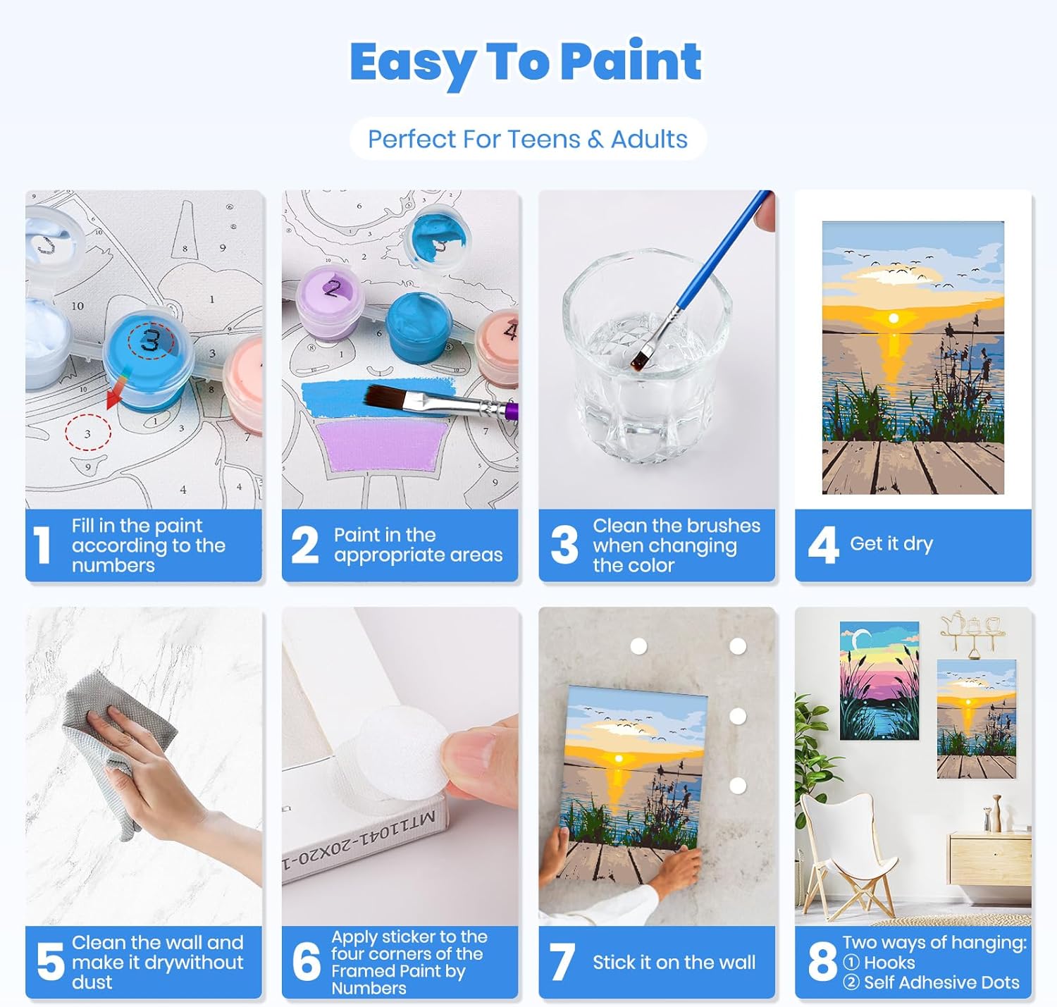 Contenuto della confezione: dipingi con i numeri per adulti su tela con cavalletto in legno, elaborato motivo dipinto a olio fai da te. La confezione include: 4 tele testurizzate prestampate da 20,3 x 30,5 cm (include cornice), 1 cavalletto in legno, 4 set di colori acrilici di alta qualità, 4 set di pennelli (12 pezzi), 8 ganci e chiodi e 24 punti autoadesivi. Puoi appendere il tuo capolavoro alla parete per la visualizzazione Facile da dipingere: questo kit di pittura a colori con numeri è perfetto per adolescenti e adulti. Non sono richieste abilità speciali, basta colorare i numeri corrispondenti sulla tela e creare un capolavoro! Sentirai un senso di orgoglio e gioia quando appendi un bellissimo pezzo d'arte che hai creato con le tue mani Tela incorniciata senza pieghe: a differenza di altre tele piegate o arrotolate, il kit di pittura incorniciato con numeri che offriamo non ha bisogno di essere stirato e può essere appeso direttamente alla parete come dipinto decorativo una volta finito. La nostra tela per pittura numerica utilizza tele colorate ad alta definizione e colori acrilici sani. L'area numerica è più facile da distinguere e la vernice è più facile da aderire ad essa. La tela colorata può prevenire l'affaticamento degli occhi e rendere più facile la pittura La tua decorazione unica per la casa: il tuo capolavoro completato è un ottimo modo per decorare la tua casa! Che si tratti di un principiante o di un professionista, dipingere con i numeri è un hobby davvero semplice e divertente. Se vuoi dedicarti a un hobby, dovresti assolutamente provare il kit fai da te per dipingere facilmente la tela, i kit di pittura sviluppano la pazienza e quando hai finito lo troverai utile e un hobby assolutamente meraviglioso Regalo perfetto: il kit per dipingere con i numeri è il regalo perfetto da regalare ad amici e persone care per compleanni, Natale e altre vacanze. Un'idea regalo divertente e affascinante per tutte le occasioni. I capolavori fatti da soli sono decorazioni per la casa uniche