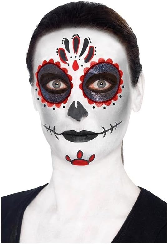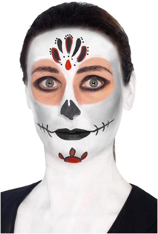 Descrizione prodotto Questo kit per il trucco con teschio messicano comprende pittura per il viso e tatuaggi, pietre acriliche autoadesive, barre colorate per il trucco, spugna e pennelli. Avviso di sicurezza Utilizzare con cautela