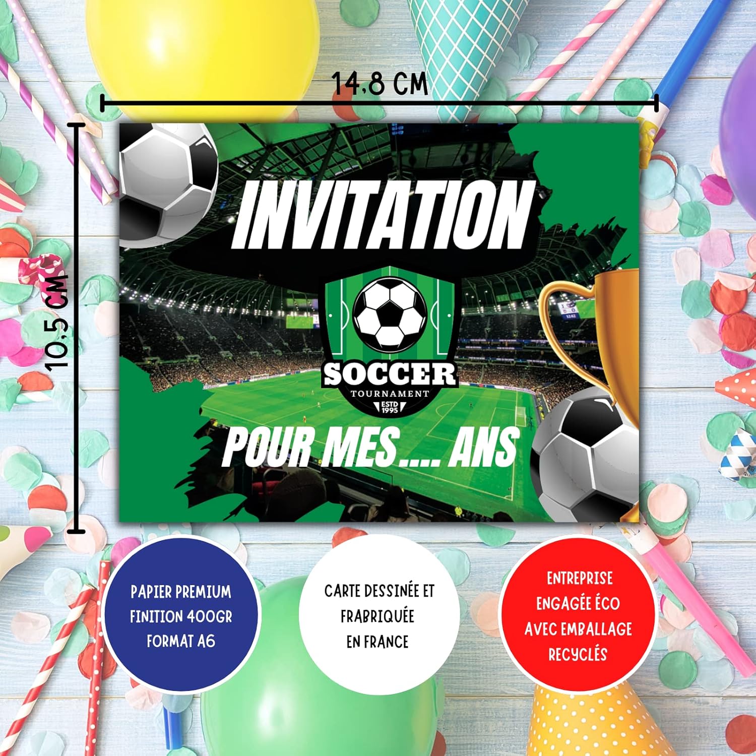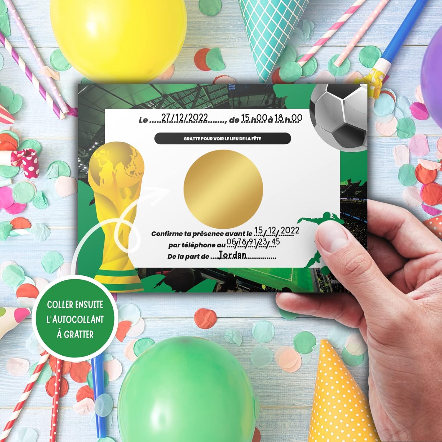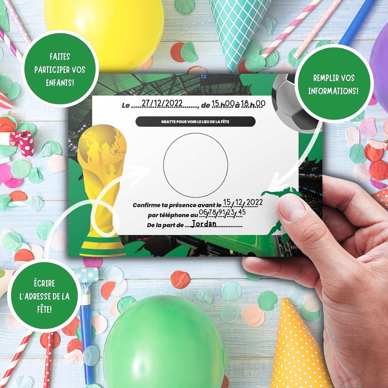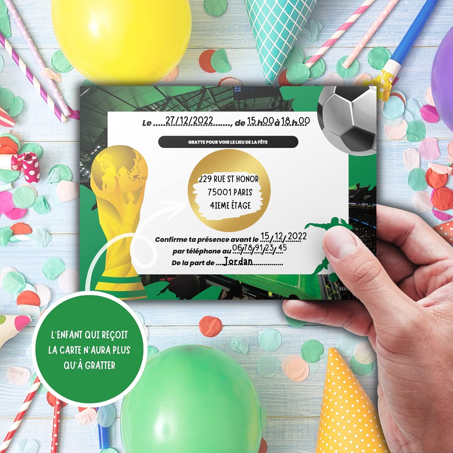 🌟 IL KIT UNICO: Un kit completo con 10 biglietti d'invito a tema Calcio, 10 buste bianche, 10 adesivi gratta e vinci dorati e 10 adesivi Squadra di Calcio per decorare la busta. 🤗 I TUOI BAMBINI PARTECIPANO ALLA CREAZIONE: Il kit è pensato per far divertire i tuoi bambini a creare i propri inviti. Aiutateli a scrivere le informazioni negli spazi di testo previsti a questo scopo. Data, ora, numero di telefono, tutte le informazioni sono lì! Quello più importante è dietro nel cerchio centrale con l'indirizzo della festa che deve essere scritto e poi coperto con l'adesivo dorato. 🤩 EFFETTO SORPRESA GARANTITO: Dopo aver ricevuto questi biglietti, i tuoi ospiti e i loro genitori se li ricorderanno! Il lato giocoso catturerà la loro attenzione mentre il mistero resterà intatto fino al momento di grattare l'adesivo per scoprire il luogo magico della vostra festa. 🥳 UN COMPLEANNO INDIMENTICABILE IN ARRIVO: Fatti notare prima ancora che la festa inizi con questo kit originale! Perché una festa non inizia con il grande giorno, bensì appena viene annunciato. I tuoi piccoli ospiti saranno ansiosi di vedere cosa li aspetta! 🇫🇷 UN MARCHIO FRANCESE: Magik Moments è una creazione francese al 100% che si impegna a mettere un po' di magia in ogni evento significativo della vostra vita. Con sede a Parigi, i vostri prodotti sono immaginati, progettati e assemblati nei nostri locali.
