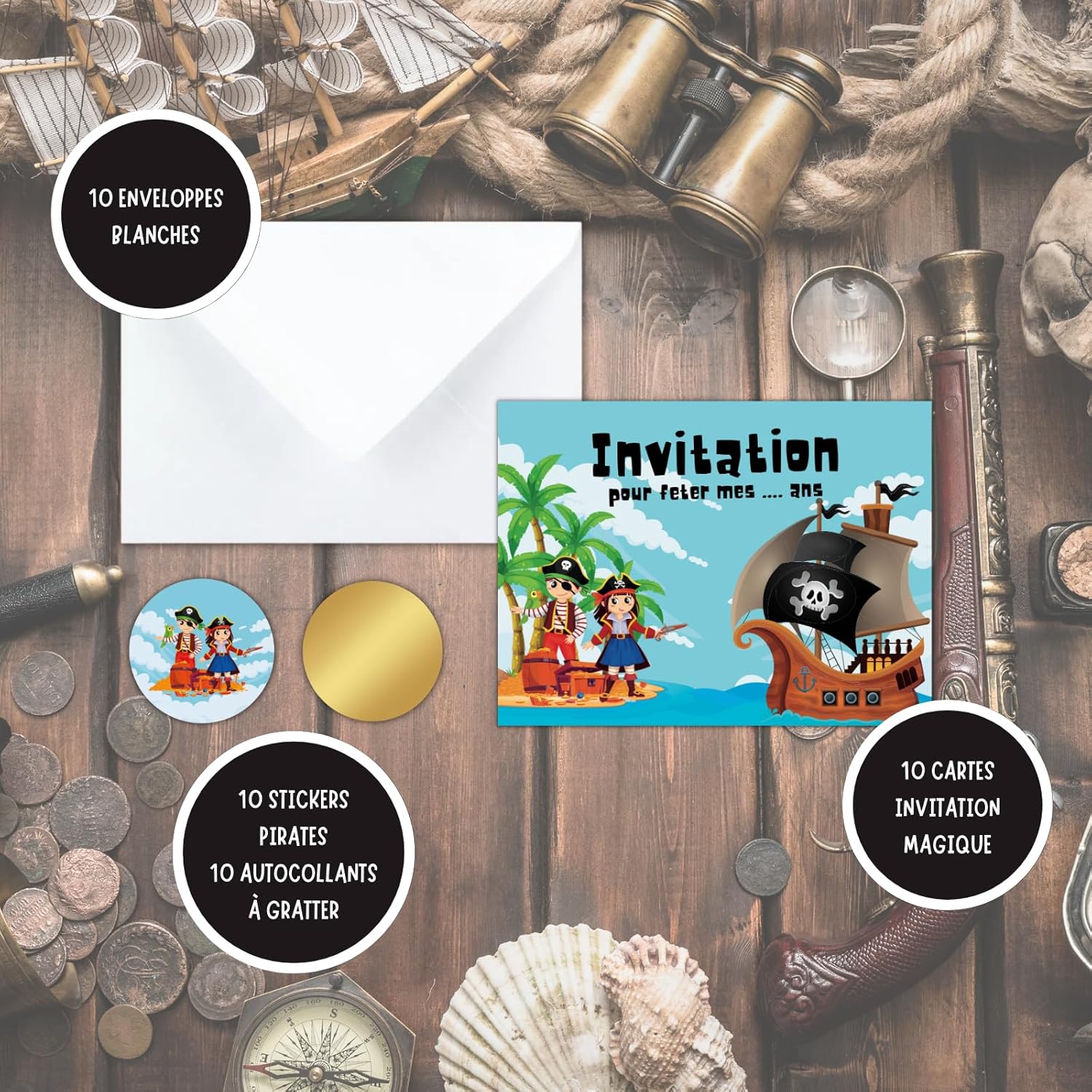 🌟 IL KIT UNICO: Un kit completo con 10 biglietti d'invito a tema Pirati, 10 buste bianche, 10 adesivi gratta e vinci dorati e 10 adesivi emoji compleanno per decorare la busta. 🤗 I TUOI BAMBINI PARTECIPANO ALLA CREAZIONE: Il kit è pensato per far divertire i tuoi bambini a creare i propri inviti. Aiutateli a scrivere le informazioni negli spazi di testo previsti a questo scopo. Data, ora, numero di telefono, tutte le informazioni sono lì! Quello più importante è dietro nel cerchio centrale con l'indirizzo della festa che deve essere scritto e poi coperto con l'adesivo dorato. 🤩 EFFETTO SORPRESA GARANTITO: Dopo aver ricevuto questi biglietti, i tuoi ospiti e i loro genitori se li ricorderanno! Il lato giocoso catturerà la loro attenzione mentre il mistero resterà intatto fino al momento di grattare l'adesivo per scoprire il luogo magico della vostra festa. 🥳 UN COMPLEANNO INDIMENTICABILE IN ARRIVO: Fatti notare prima ancora che la festa inizi con questo kit originale! Perché una festa non inizia con il grande giorno, bensì appena viene annunciato. I tuoi piccoli ospiti saranno ansiosi di vedere cosa li aspetta! 🇫🇷 UN MARCHIO FRANCESE: Magik Moments è una creazione francese al 100% che si impegna a mettere un po' di magia in ogni evento significativo della vostra vita. Con sede a Parigi, i vostri prodotti sono immaginati, progettati e assemblati nei nostri locali.