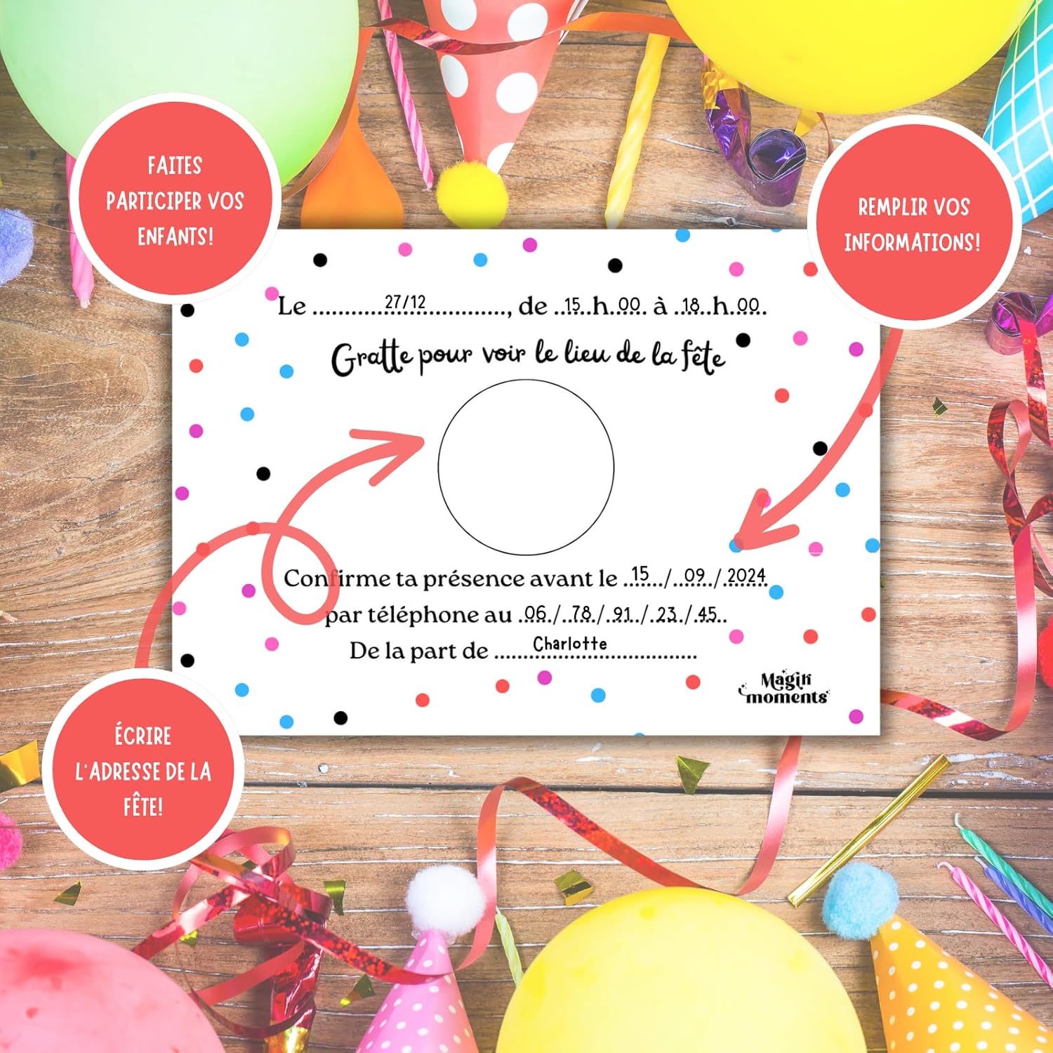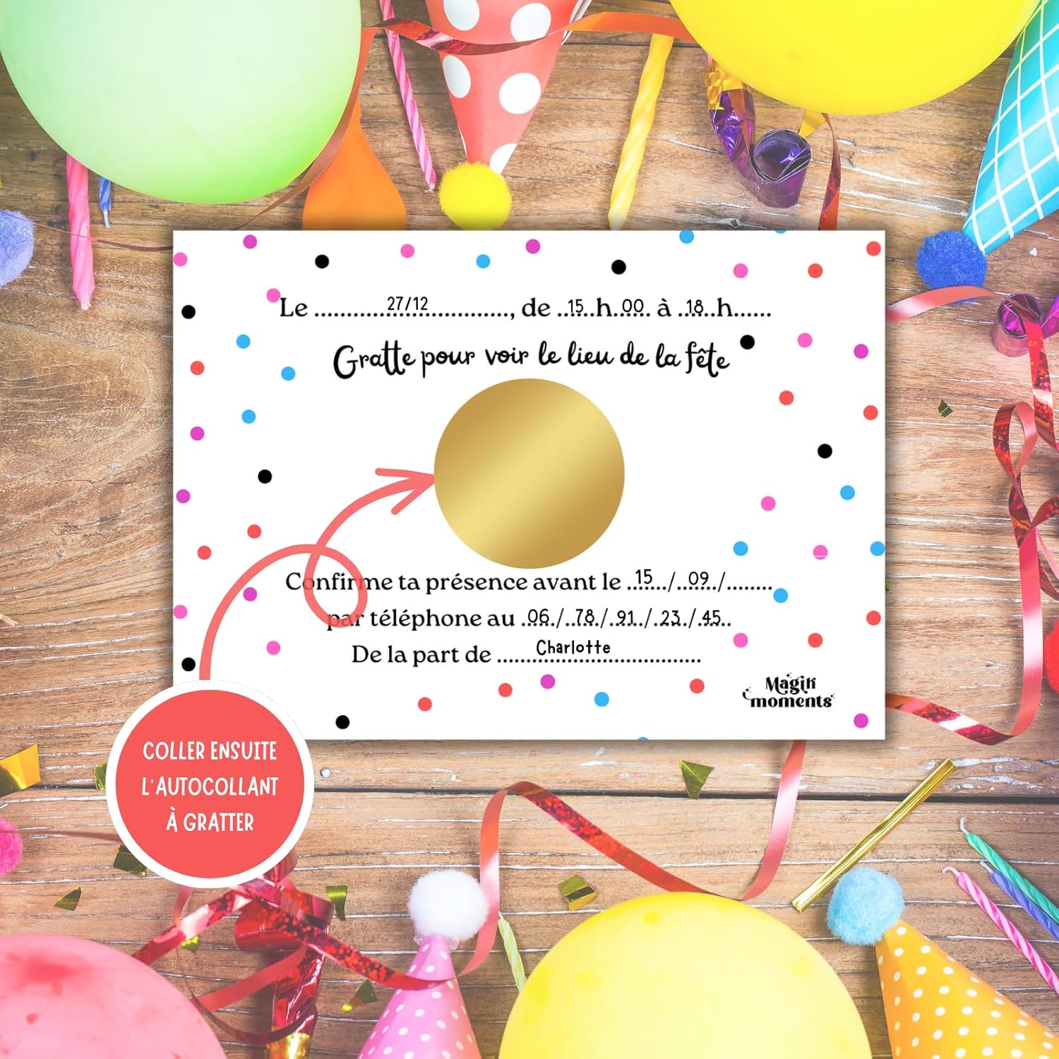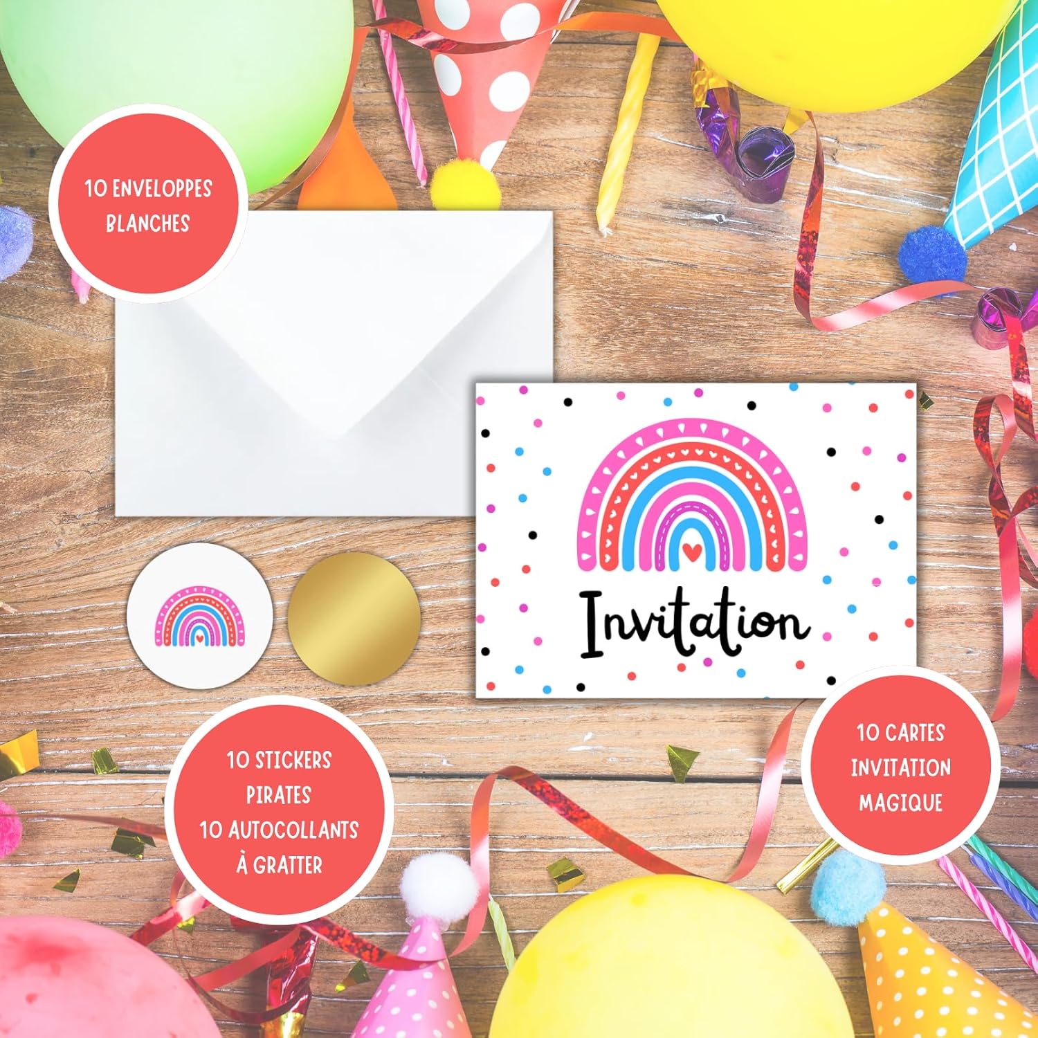 🌟 IL KIT UNICO: Un kit completo con 10 biglietti d'invito a tema Arcobaleno, 10 buste bianche, 10 adesivi gratta e vinci dorati e 10 adesivi Compleanno Arcobaleno per decorare la busta. 🤗 I TUOI BAMBINI PARTECIPANO ALLA CREAZIONE: Il kit è pensato per far divertire i tuoi bambini a creare i propri inviti. Aiutateli a scrivere le informazioni negli spazi di testo previsti a questo scopo. Data, ora, numero di telefono, tutte le informazioni sono lì! Quello più importante è dietro nel cerchio centrale con l'indirizzo della festa che deve essere scritto e poi coperto con l'adesivo dorato. 🤩 EFFETTO SORPRESA GARANTITO: Dopo aver ricevuto questi biglietti, i tuoi ospiti e i loro genitori se li ricorderanno! Il lato giocoso catturerà la loro attenzione mentre il mistero resterà intatto fino al momento di grattare l'adesivo per scoprire il luogo magico della vostra festa. 🥳 UN COMPLEANNO INDIMENTICABILE IN ARRIVO: Fatti notare prima ancora che la festa inizi con questo kit originale! Perché una festa non inizia con il grande giorno, bensì appena viene annunciato. I tuoi piccoli ospiti saranno ansiosi di vedere cosa li aspetta! 🇫🇷 UN MARCHIO FRANCESE: Magik Moments è una creazione francese al 100% che si impegna a mettere un po' di magia in ogni evento significativo della vostra vita. Con sede a Parigi, i vostri prodotti sono immaginati, progettati e assemblati nei nostri locali.