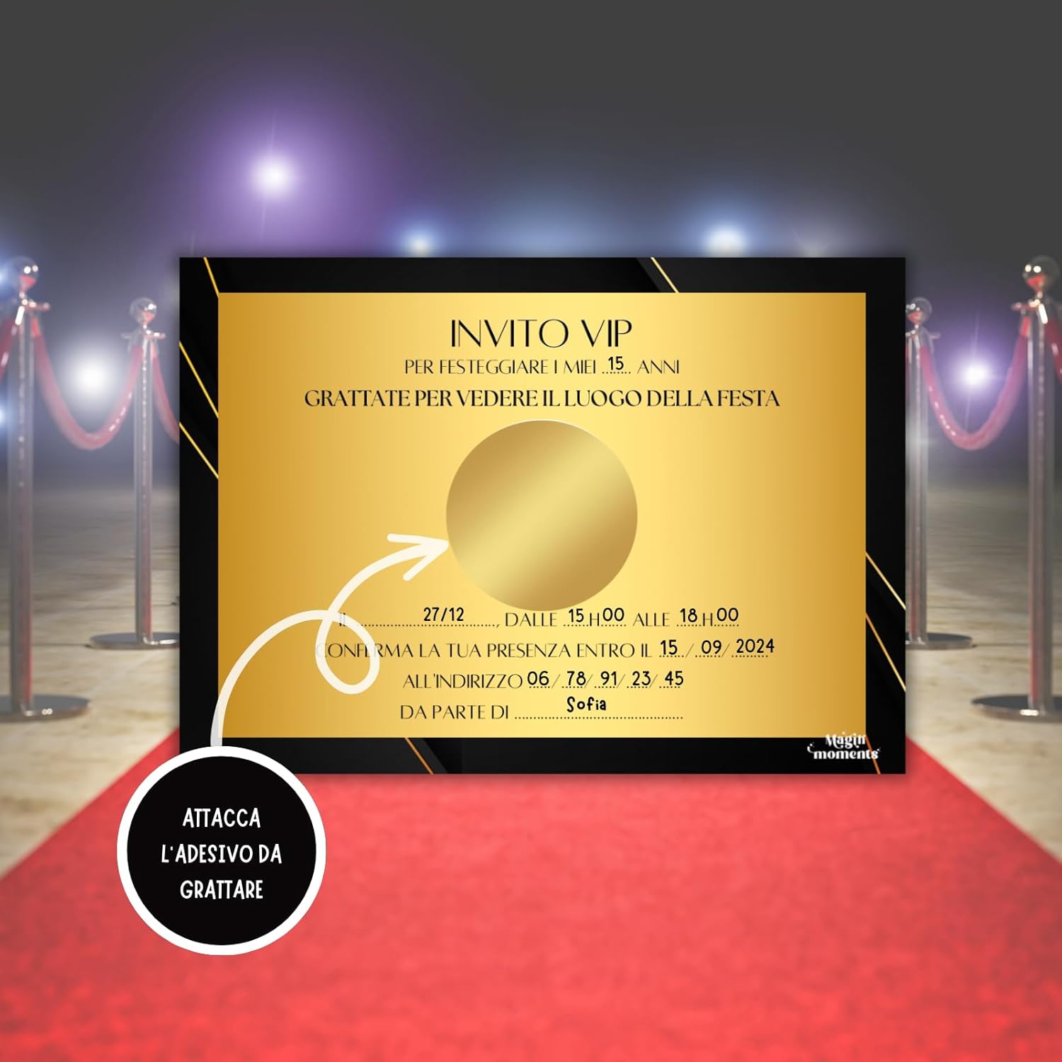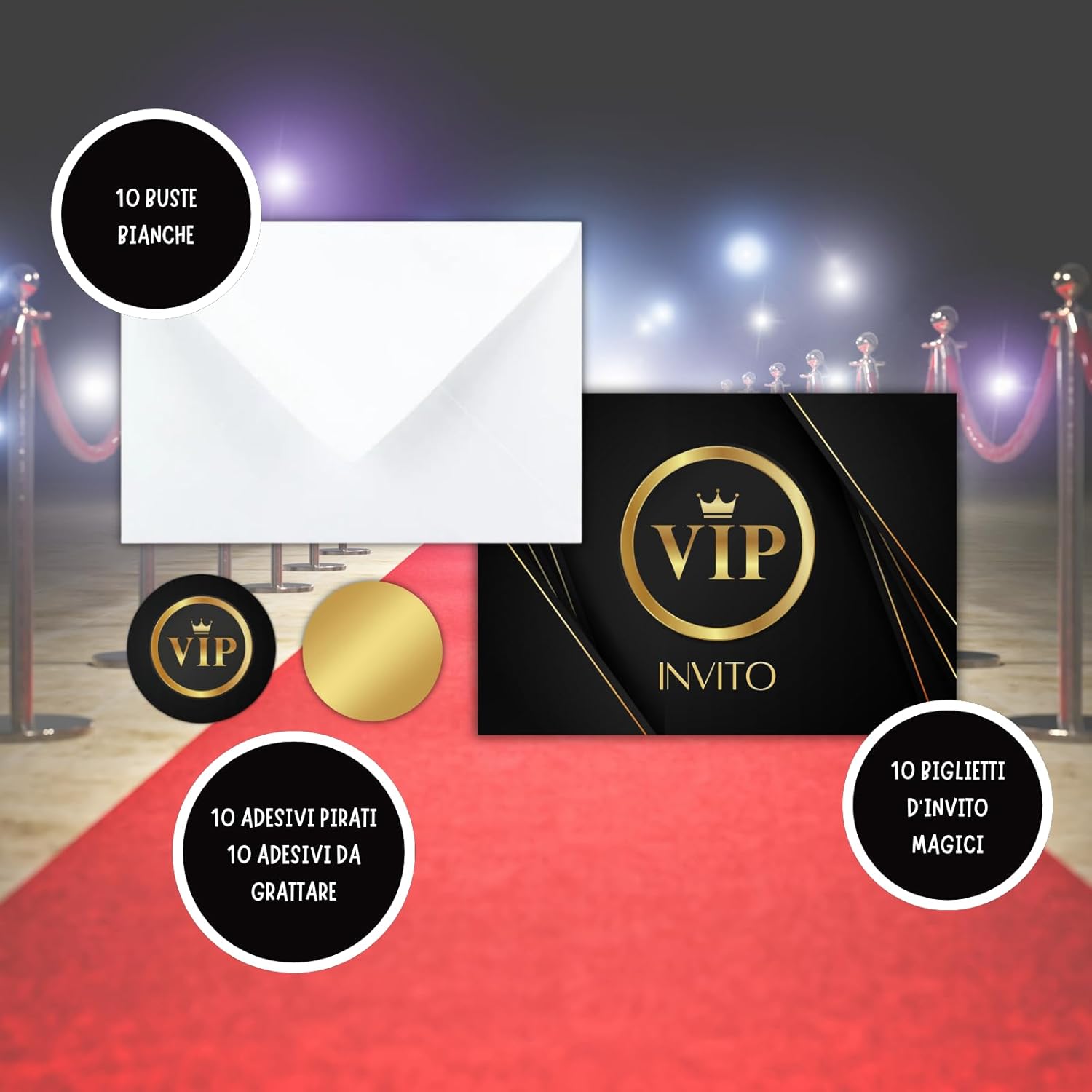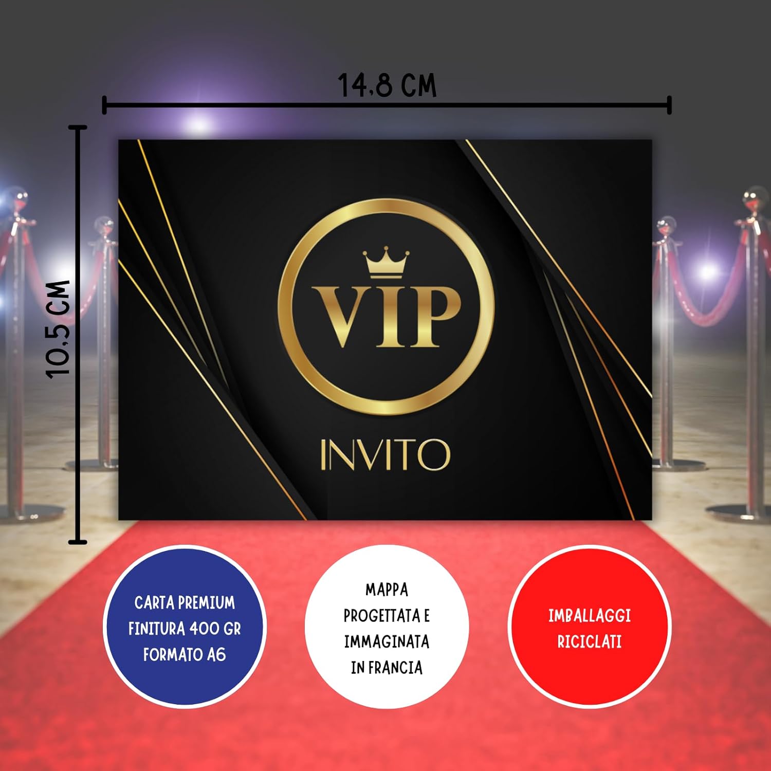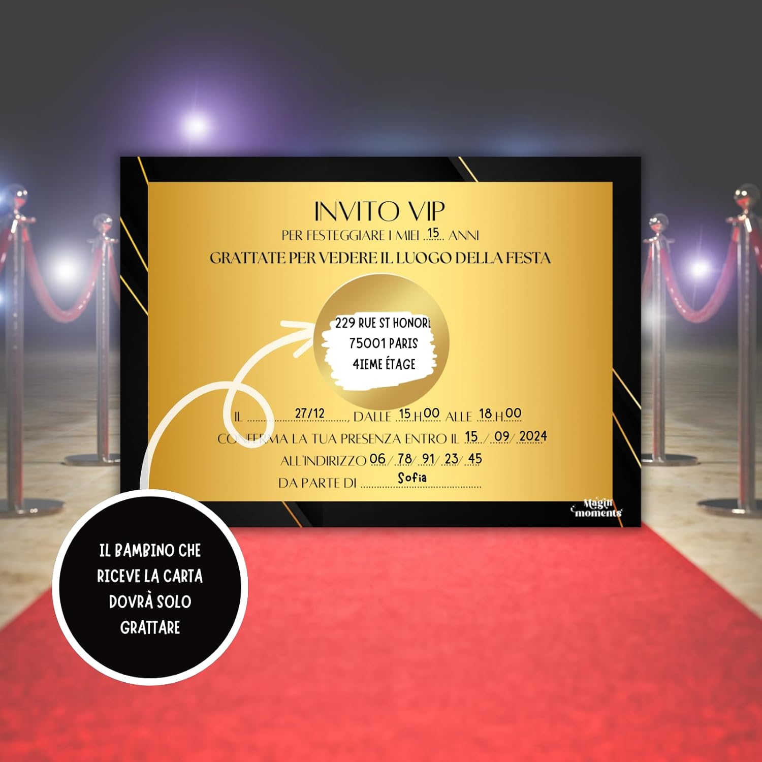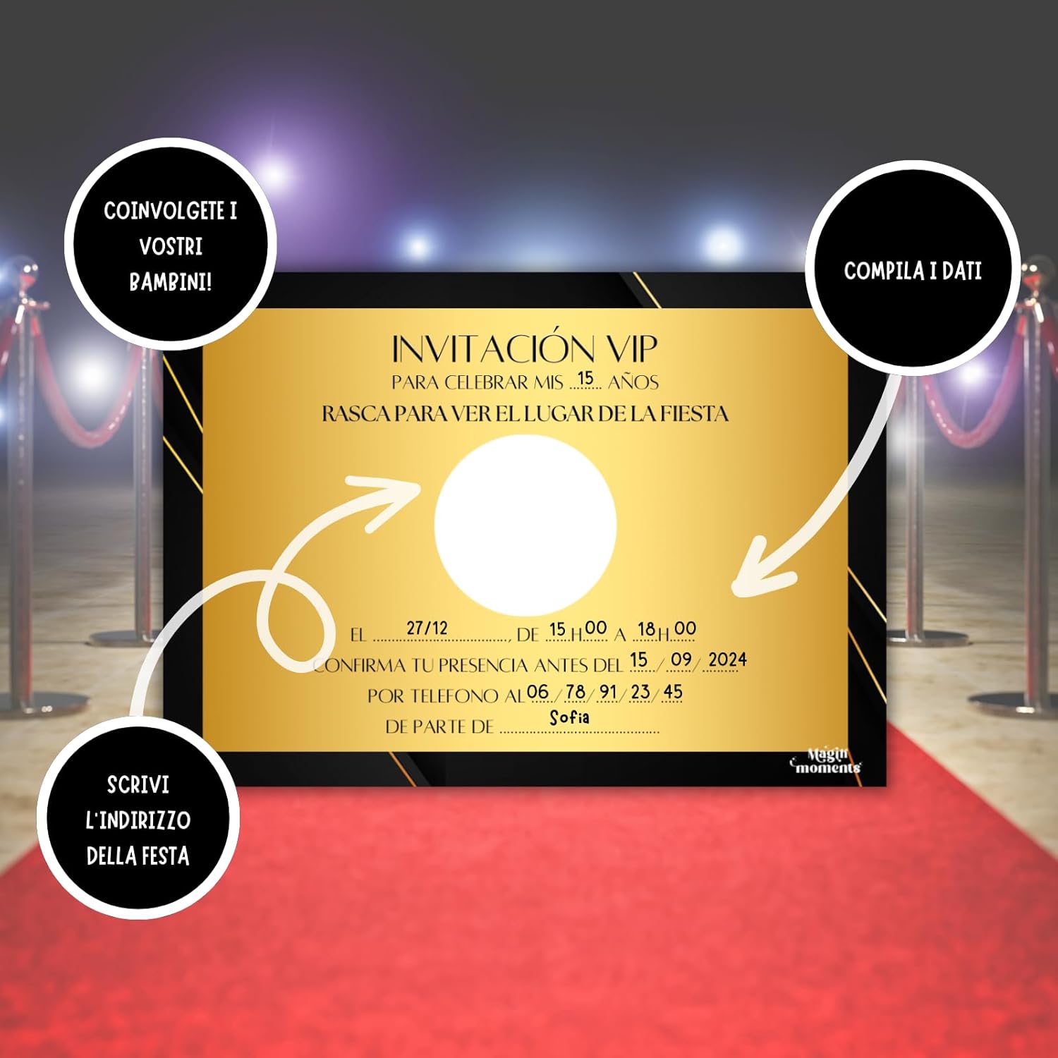 🌟 IL KIT UNICO: Un kit completo con 10 biglietti d'invito a tema VIP, 10 buste bianche, 10 adesivi da grattare dorati e 10 adesivi VIP per decorare la busta. 🤗 I TUOI BAMBINI PARTECIPANO ALLA CREAZIONE: Il kit è pensato per far divertire i tuoi bambini a creare i propri inviti. Aiutateli a scrivere le informazioni negli spazi di testo previsti a questo scopo. Data, ora, numero di telefono, tutte le informazioni sono lì! Quello più importante è dietro nel cerchio centrale con l'indirizzo della festa che deve essere scritto e poi coperto con l'adesivo dorato. 🤩 EFFETTO SORPRESA GARANTITO: Dopo aver ricevuto questi biglietti, i tuoi ospiti e i loro genitori se li ricorderanno! Il lato giocoso catturerà la loro attenzione mentre il mistero resterà intatto fino al momento di grattare l'adesivo per scoprire il luogo magico della vostra festa. 🥳 UN COMPLEANNO INDIMENTICABILE IN ARRIVO: Fatti notare prima ancora che la festa inizi con questo kit originale! Perché una festa non inizia con il grande giorno, bensì appena viene annunciato. I tuoi piccoli ospiti saranno ansiosi di vedere cosa li aspetta! 🇫🇷 UN MARCHIO FRANCESE: Magik Moments è una creazione francese al 100% che si impegna a mettere un po' di magia in ogni evento significativo della vostra vita. Con sede a Parigi, i vostri prodotti sono immaginati, progettati e assemblati nei nostri locali.
