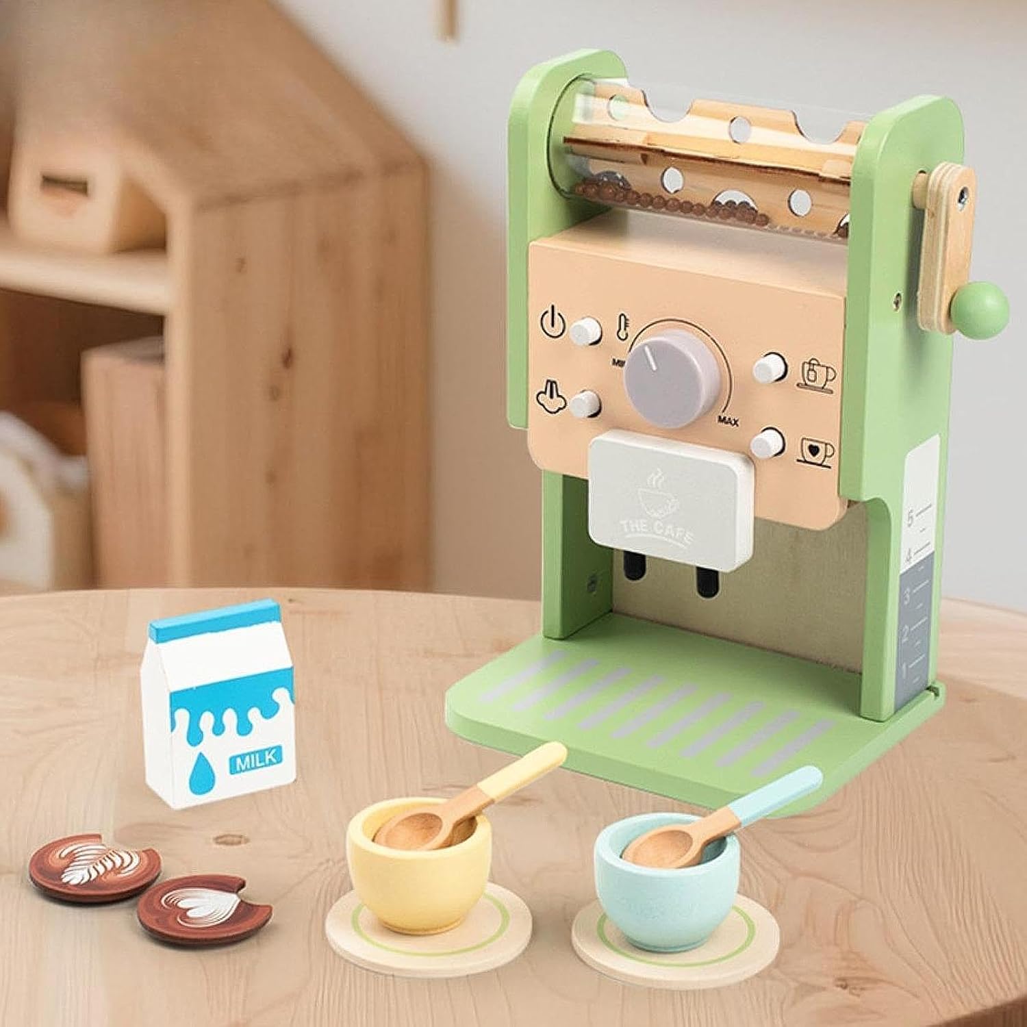 【Informazioni sulle dimensioni】La caffettiera in legno misura circa 17,5 cm x 12,2 cm x 23 cm / 6,89 pollici x 4,80 pollici x 9,06 pollici 【Effetti sonori realistici】: questo giocattolo per macchina da caffè in legno è dotato di un pulsante di rimbalzo che produce un suono quando viene premuto, aggiungendo strato uditivo al finto processo di preparazione del caffè 【Design】: Realizzato in legno sicuro per i bambini, questo giocattolo per bambini con macchina da caffè a manovella è costruito per resistere al gioco entusiasta ed è adatto a bambini dai tre anni in su 【Set di gioco completo】: il set da caffè per giochi di ruolo include una macchina per il caffè, latte, tazze da tè, cucchiai e piattini, fornendo tutti strumenti necessari per scenari di gioco di ruolo immersivi 【Focus sullo sviluppo delle competenze】: come strumento educativo di gioco di finzione, incoraggia le abilità sociali come la condivisione e la cooperazione, migliorando anche le capacità motorie fini e la creatività