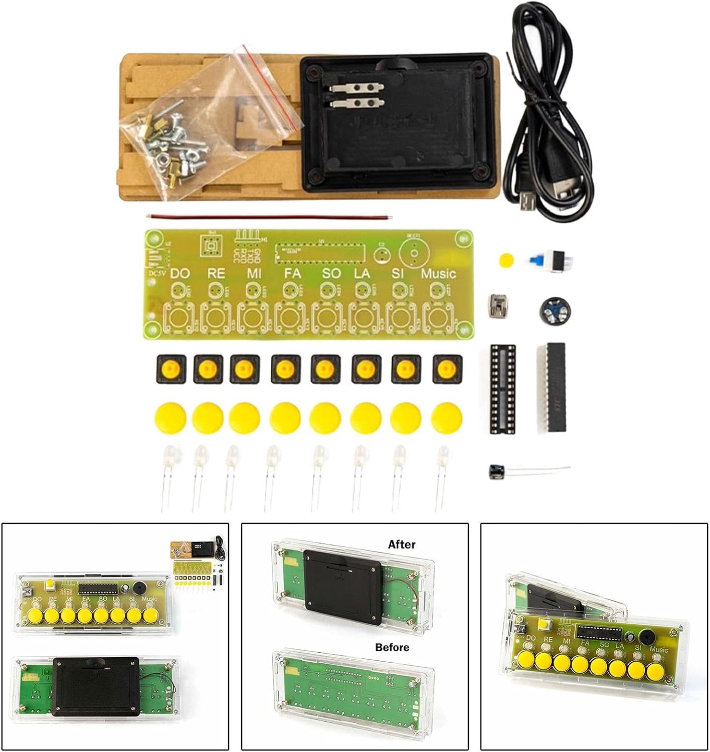 【Ideale per esercitarsi nella saldatura】: questo kit funge da valido strumento di pratica per affinare le tue capacità di saldatura durante la creazione di strumento elettronico funzionale 【Indicatori interattivi】: ogni pressione di un tasto è accompagnata da un corrispondente flash luminoso, che fornisce un feedback visivo e migliora l'esperienza interattiva 【Design compatto】: una volta assemblato, il pianoforte elettronico misura 148,5 mm di lunghezza, 56,9 mm di larghezza e ha spessore di 18 mm, il che lo rende facile da maneggiare e riporre 【Funzionalità versatile dei tasti】: questo kit per pianoforte elettronico fai-da-te è dotato di un totale di 8 tasti, inclusi 7 tasti di scala per suonare le note e 1 tasto dedicato per la riproduzione automatica della musica 【Raccolta di melodie integrate】: goditi una selezione di 18 melodie preprogrammate integrate nel microcontrollore, che offrono una varietà di melodie con cui suonare