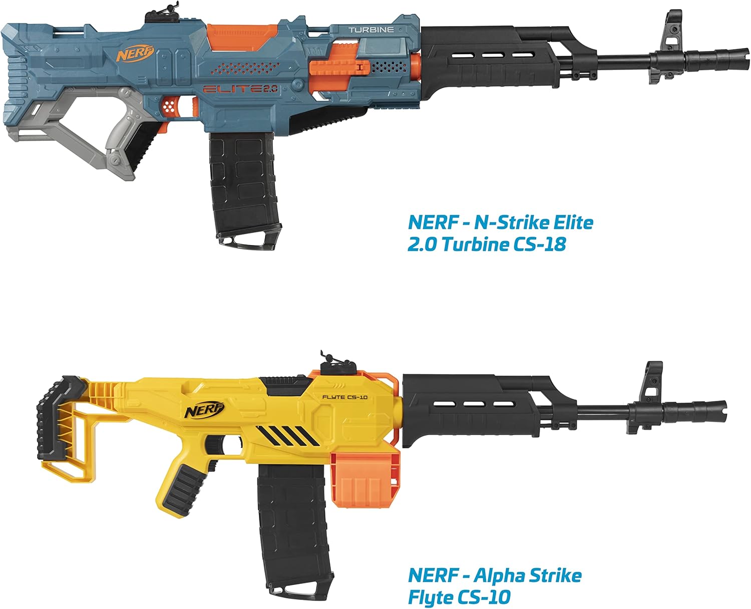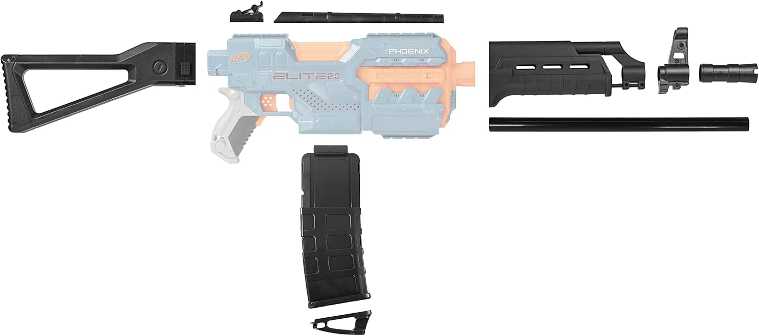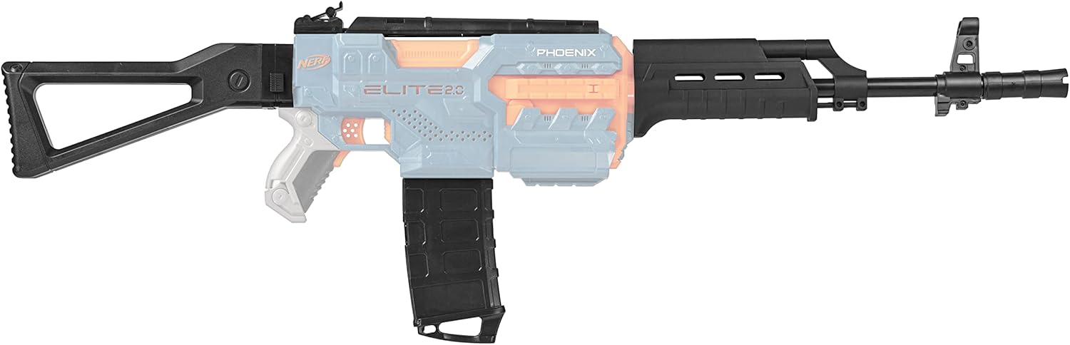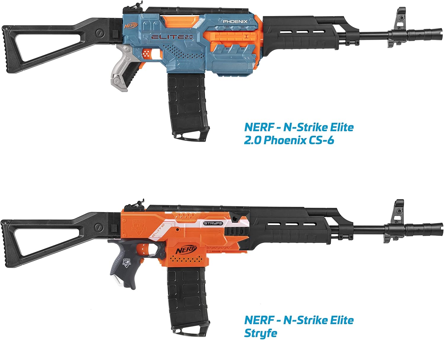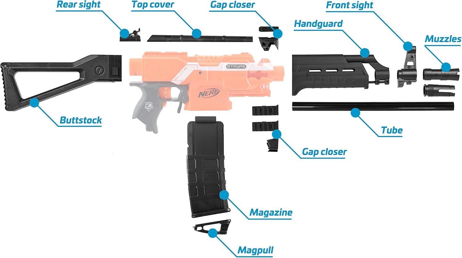 [AK47 Style Mod Kit] Date al vostro NERF Stryfe il look realistico di un AK47 in nero – proprio come nel vostro film d'azione preferito o il nome del computer – Giocattoli Blaster Modding Contenuto della confezione: supporto per spalla, impugnatura, chiusura Gap, caricatore per 12 freccette Nerf con inserto per cambio più veloce, prolungamento del percorso, corsa interna, visiera, inserto per rail, freno a bocca, 1 perno di sicurezza NERF Blaster non incluso [Installazione] Tutti i componenti inclusi possono essere facilmente inseriti nelle registrazioni e nelle aperture del blaster e sono altrettanto rimovibili, senza bisogno di attrezzi [Individualità] La struttura modulare consente l'utilizzo anche solo di singoli pezzi per dare al vostro nerf lo stile personale e personalizzarlo a seconda dell'occasione [Modding] Che si tratti di lotta, lotta zombie o imitazione dettagliata del modello – con un po' di colore aggiuntivo potete continuare a modegno di stryfe