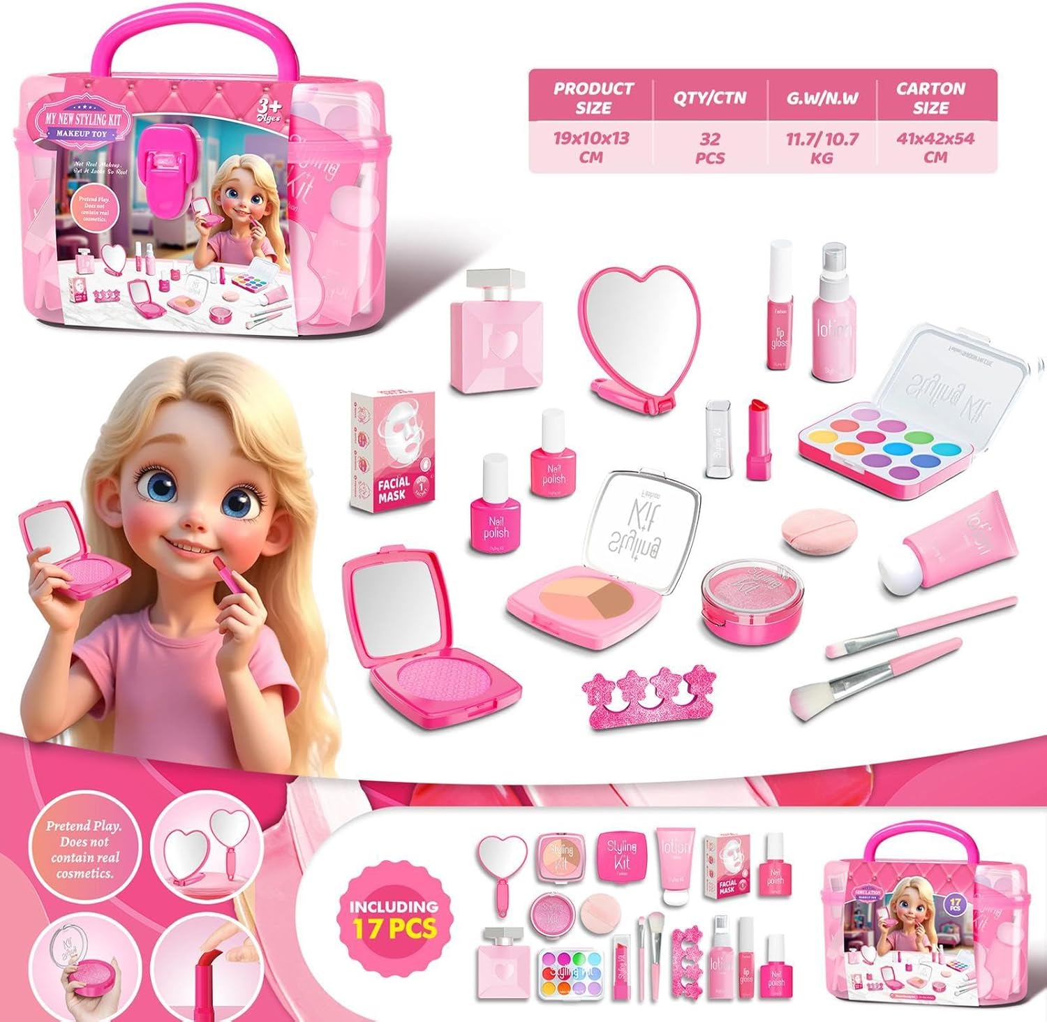 Promuove lo sviluppo artistico: Con colori vivaci e un aspetto raffinato, questo set aiuta a promuovere la creatività, l'immaginazione e le abilità estetiche mentre le ragazze imparano le tecniche essenziali di trucco Sicuro da usare: Con ingredienti naturali, i nostri set di trucco per bambini promuovono la salute della pelle e forniscono un'esperienza di applicazione delicata e non irritante Bellezza organizzata: Evita polvere e trucco comodamente ordinati con la scatola di facile apertura, ideale per i viaggi e i bambini da 1 a 3 anni. Molto pratico Strumento di apprendimento creativo: AMP UP UP GIOCA con fantasia con questo set di trucco per bambini, una combinazione perfetta di divertimento ed educazione, offrendo una varietà di cosmetici per un'esplorazione più creativa Multiuso: per feste di compleanno e occasioni speciali come Natale e Capodanno, questo set di trucchi per bambini fa sentire le ragazze come principesse e crea momenti indimenticabili