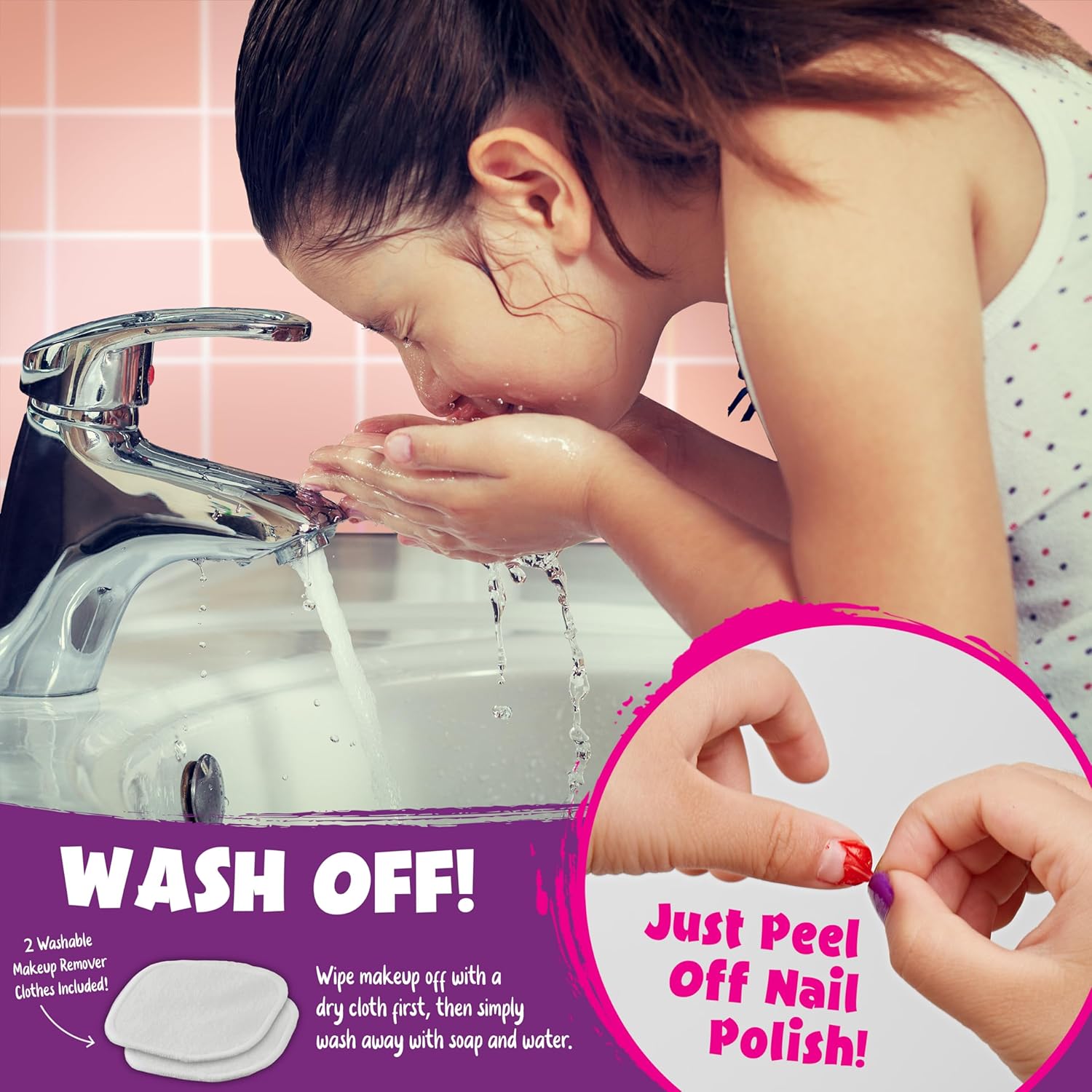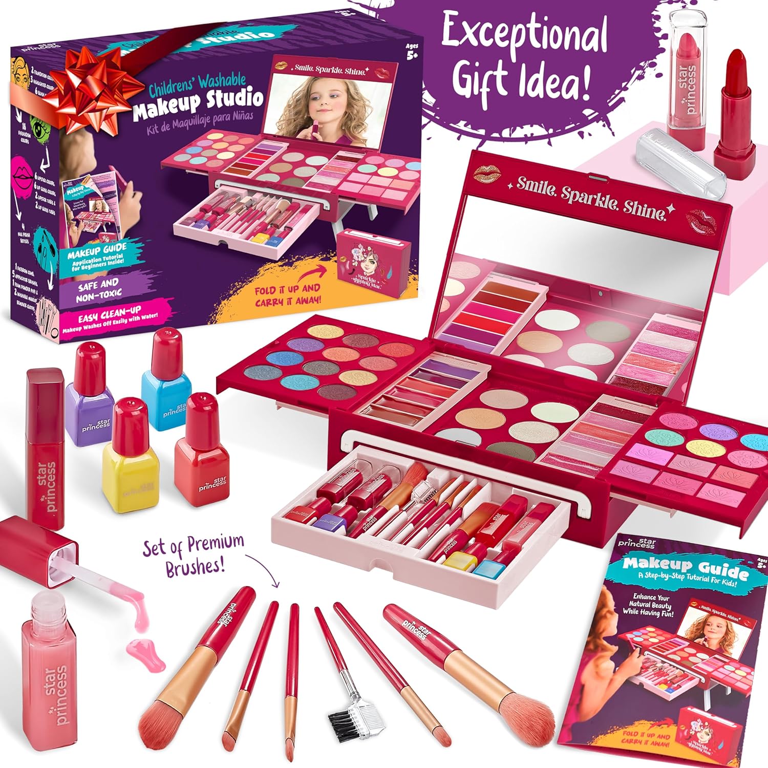 SET COSMETICO TUTTO COMPRESO: questo adorabile studio di trucco per bambini offre alla tua piccola tutto ciò di cui ha bisogno per iniziare la sua vita di bellezza. Contiene una gamma completa di trucchi, dal fondotinta e fard a una vibrante tavolozza di ombretti e una selezione di rossetti, lucidalabbra e smalti per unghie. LA SICUREZZA PRIMA DI TUTTO: Puoi stare tranquillo sapendo che il nostro set di trucchi per bambini è realizzato solo con ingredienti non tossici adatti ai bambini e soddisfa tutti gli standard di sicurezza. NESSUNA PULIZIA E PULIZIA FACILE: goditi cosmetici facili da lavare che si puliscono senza sforzo, rendendo la pulizia un gioco da ragazzi e senza lasciare residui. COME INSEGNARLE LE BASI: Include istruzioni passo passo facili da seguire su come applicare correttamente il trucco. Tanto trucco: 18 colori di ombretti, 2 fondotinta, 3 illuminanti, 6 colori di fard, 8 rossetti, 8 lucidalabbra e 4 smalti. Inoltre tutti gli strumenti necessari per l'applicazione: piumino di schiuma, un set di 5 pennelli per il trucco premium (fard, fondotinta, sfumino, ombretto, pennello per labbra), un pettine per sopracciglia e 2 panni struccanti lavabili.