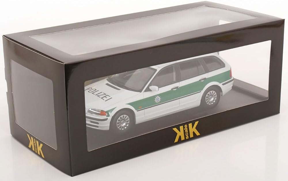 Scala: 1/18 Modello: 3ER E46 Touring German Polizei 1999 Materiale: Metallo Modello da collezione in miniatura altamente dettagliato, montato e verniciato Fabbricante: KK Scale