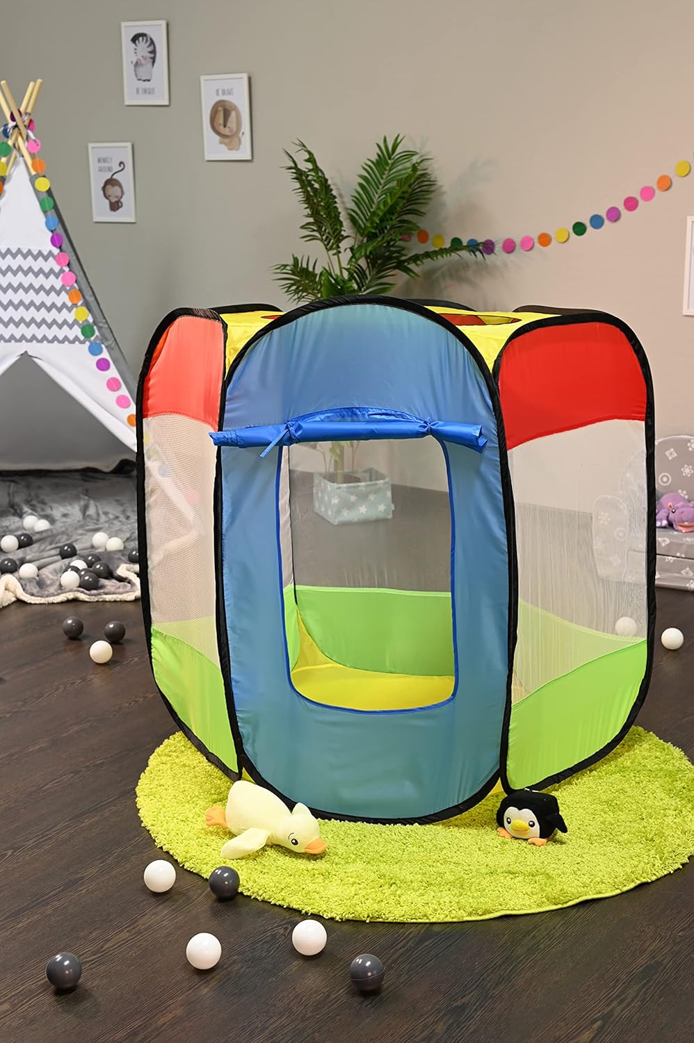 Questa colorata tenda da gioco esagonale della Knorrtoys è versatile e promette un grande divertimento. È ideale anche come vasca per palline (si consiglia l'acquisto di almeno 100 palline). L'ingresso può essere tenuto aperto con cinghie. Grazie alle pareti laterali in garza i bambini hanno una visuale completa anche durante il gioco. La tenda è realizzata in tessuto impermeabile ed è lavabile. Dimensioni: diametro ca. 110 cm e alta circa 98 cm