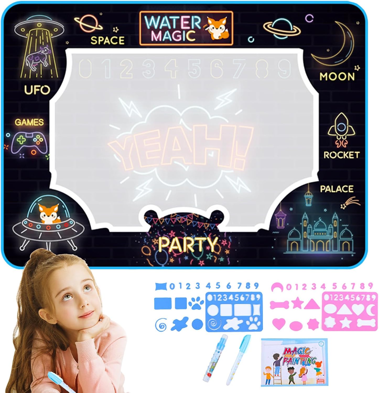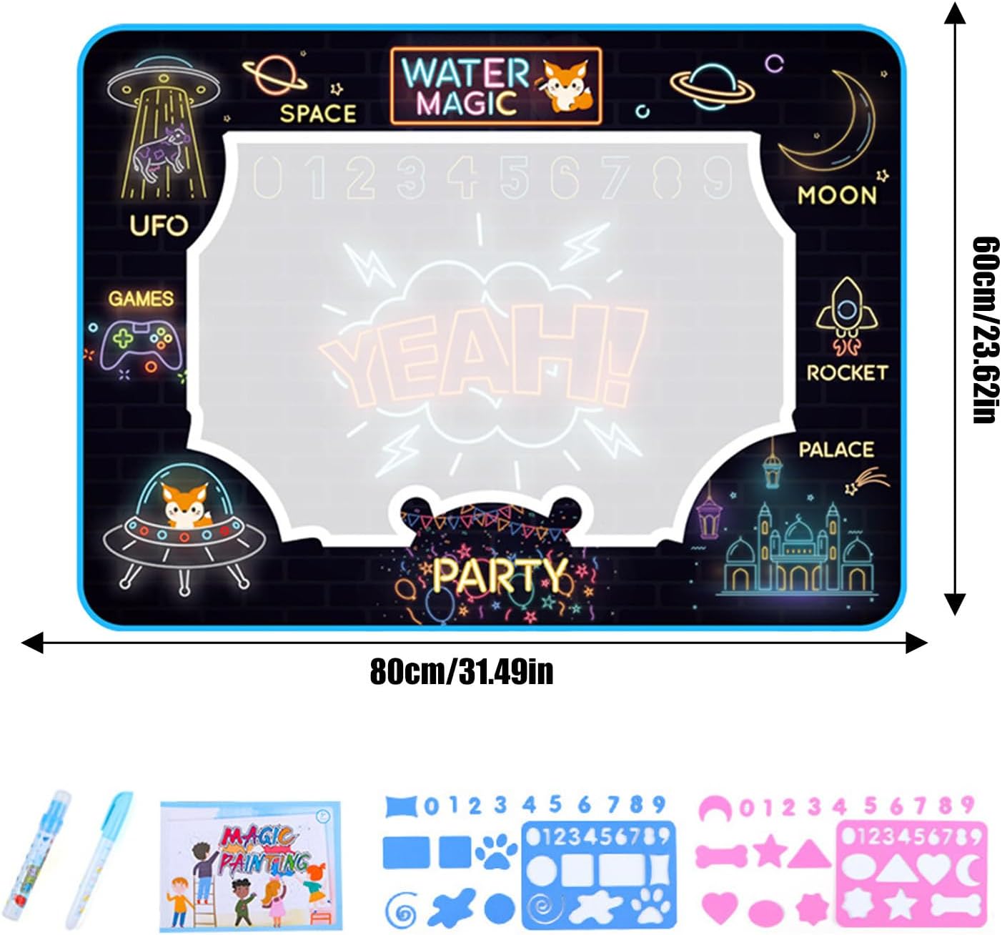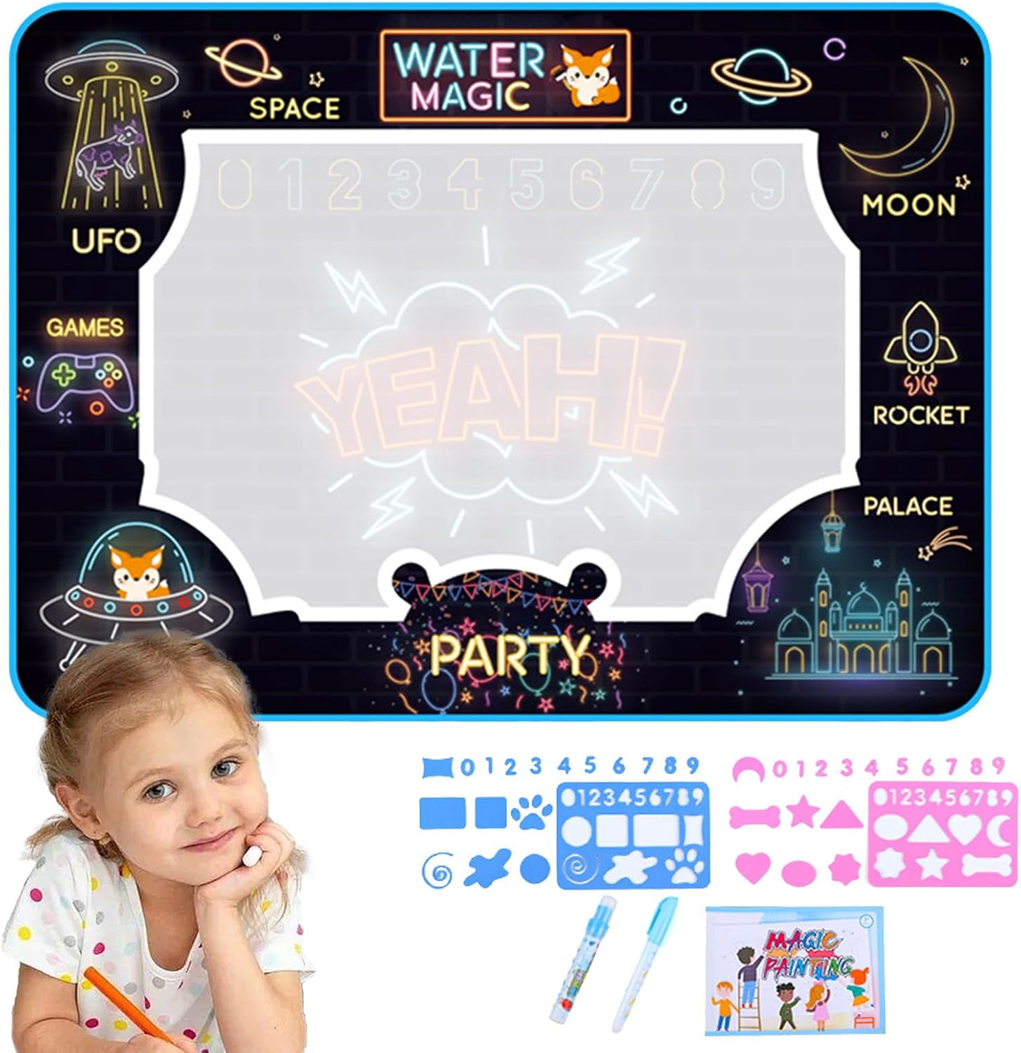 ΣColori in abbondanza: lascia che i tuoi esperimenti con colori e forme su questo incredibile timbro ad acqua per disegnare. Nessun disordine, nessun inchiostro, nessuna sbavatura: solo puro divertimento e apprendimento. Questo tappetino per scarabocchi ad acqua è un'attività preferita per tutte le età. ΣAdatto al riutilizzo: con questo tappetino per scarabocchi ad acqua, puoi disegnare le forme più divertenti utilizzando solo acqua pulita e cuscinetti per scarabocchi riutilizzabili. Non sono necessarie vernici o penne. I disegni si cancelleranno automaticamente dopo 5-10 minuti, permettendoti di divertirti senza problemi. ΣFacile da usare: questo set multifunzionale viene fornito con veri timbri ad acqua, 2 penne speciali, timbri, stencil e un fantastico rullo di stampa. Senza confusione o problemi, tuo figlio può creare incredibili opere d'arte e dare libero sfogo alla sua immaginazione. ΣDivertimento portatile: intrattieni il tuo bambino durante i lunghi viaggi in macchina con il nostro tappetino per doodle d'acqua adatto ai viaggi. Con un ampio spazio di 80x60 cm, potranno disegnare come preferiscono e riutilizzarlo ancora e ancora con le penne ad acqua. ΣRegalo unico: incoraggia l'immaginazione e la creatività di tuo figlio con il tappetino Water Doodle. Intrattienili scrivendo, colorando e imparando alle loro condizioni, tenendo a bada il caos. È un'ottima scelta regalo per tutte le età.