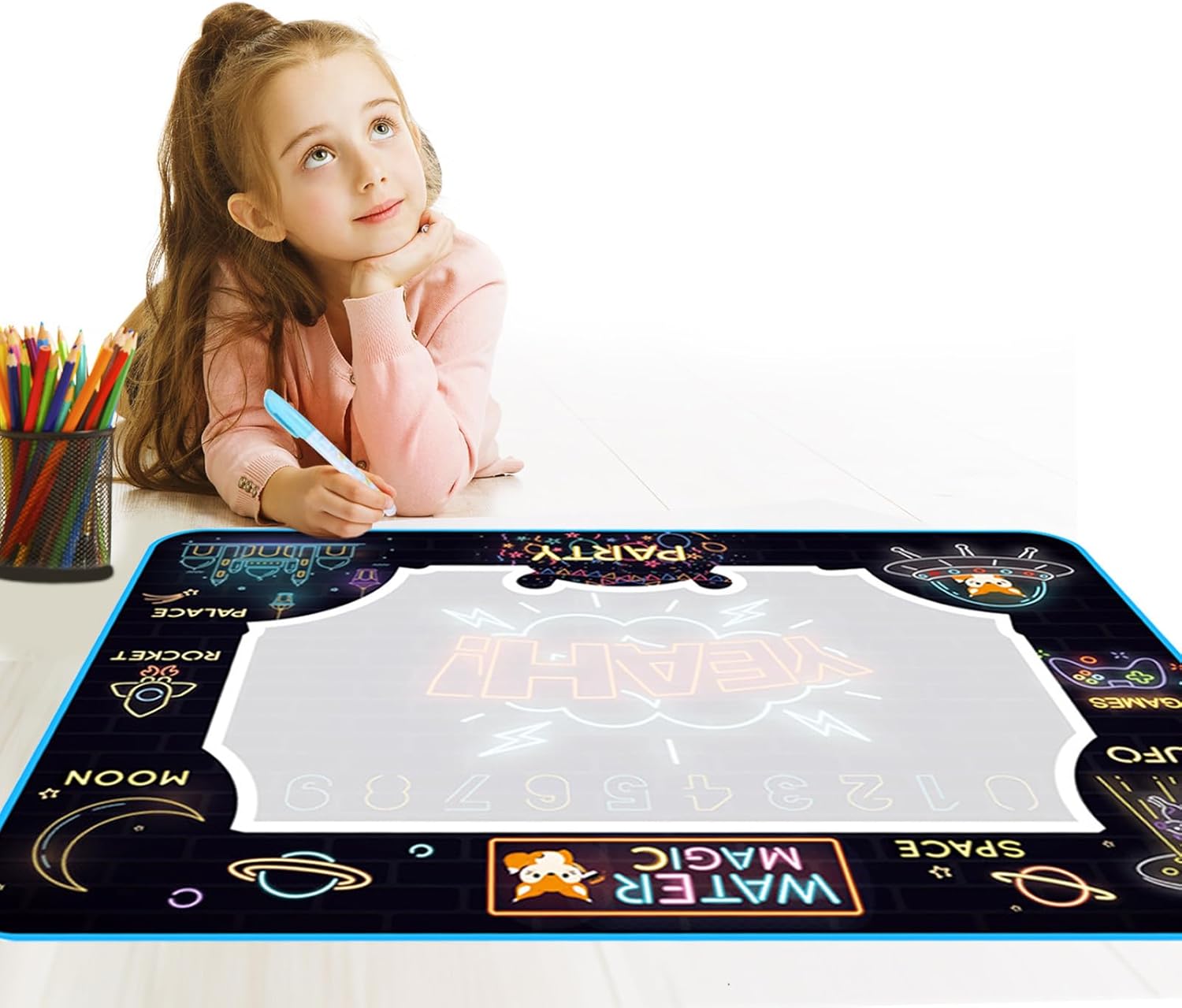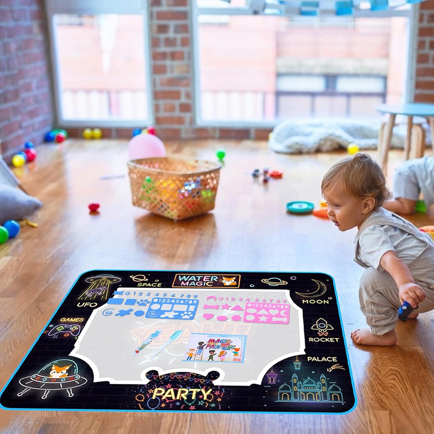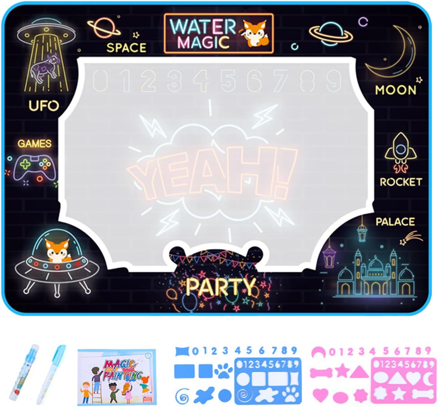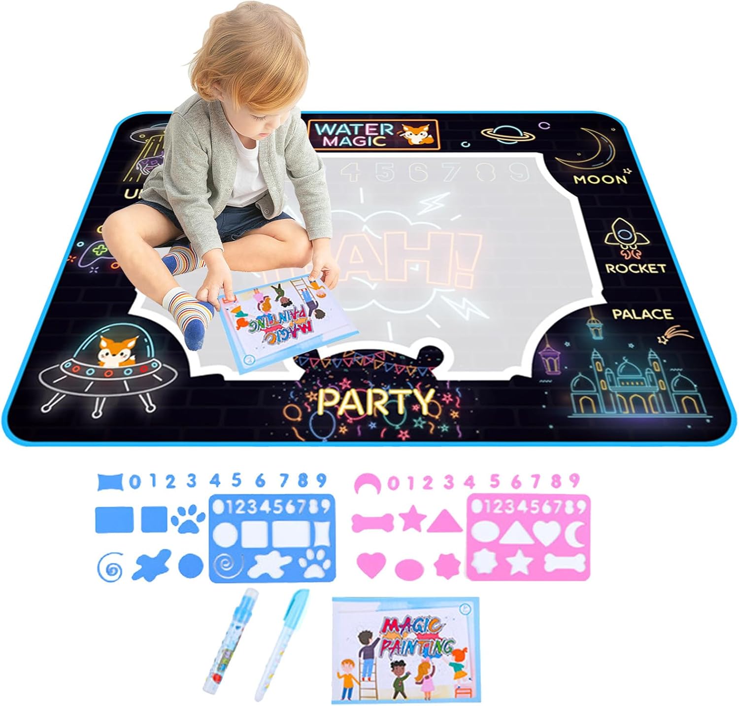 ΣColori in abbondanza: lascia che i tuoi esperimenti con colori e forme su questo incredibile timbro ad acqua per disegnare. Nessun disordine, nessun inchiostro, nessuna sbavatura: solo puro divertimento e apprendimento. Questo tappetino per scarabocchi ad acqua è un'attività preferita per tutte le età. ΣAdatto al riutilizzo: con questo tappetino per scarabocchi ad acqua, puoi disegnare le forme più divertenti utilizzando solo acqua pulita e cuscinetti per scarabocchi riutilizzabili. Non sono necessarie vernici o penne. I disegni si cancelleranno automaticamente dopo 5-10 minuti, permettendoti di divertirti senza problemi. ΣFacile da usare: questo set multifunzionale viene fornito con veri timbri ad acqua, 2 penne speciali, timbri, stencil e un fantastico rullo di stampa. Senza confusione o problemi, tuo figlio può creare incredibili opere d'arte e dare libero sfogo alla sua immaginazione. ΣDivertimento portatile: intrattieni il tuo bambino durante i lunghi viaggi in macchina con il nostro tappetino per doodle d'acqua adatto ai viaggi. Con un ampio spazio di 80x60 cm, potranno disegnare come preferiscono e riutilizzarlo ancora e ancora con le penne ad acqua. ΣRegalo unico: incoraggia l'immaginazione e la creatività di tuo figlio con il tappetino Water Doodle. Intrattienili scrivendo, colorando e imparando alle loro condizioni, tenendo a bada il caos. È un'ottima scelta regalo per tutte le età.