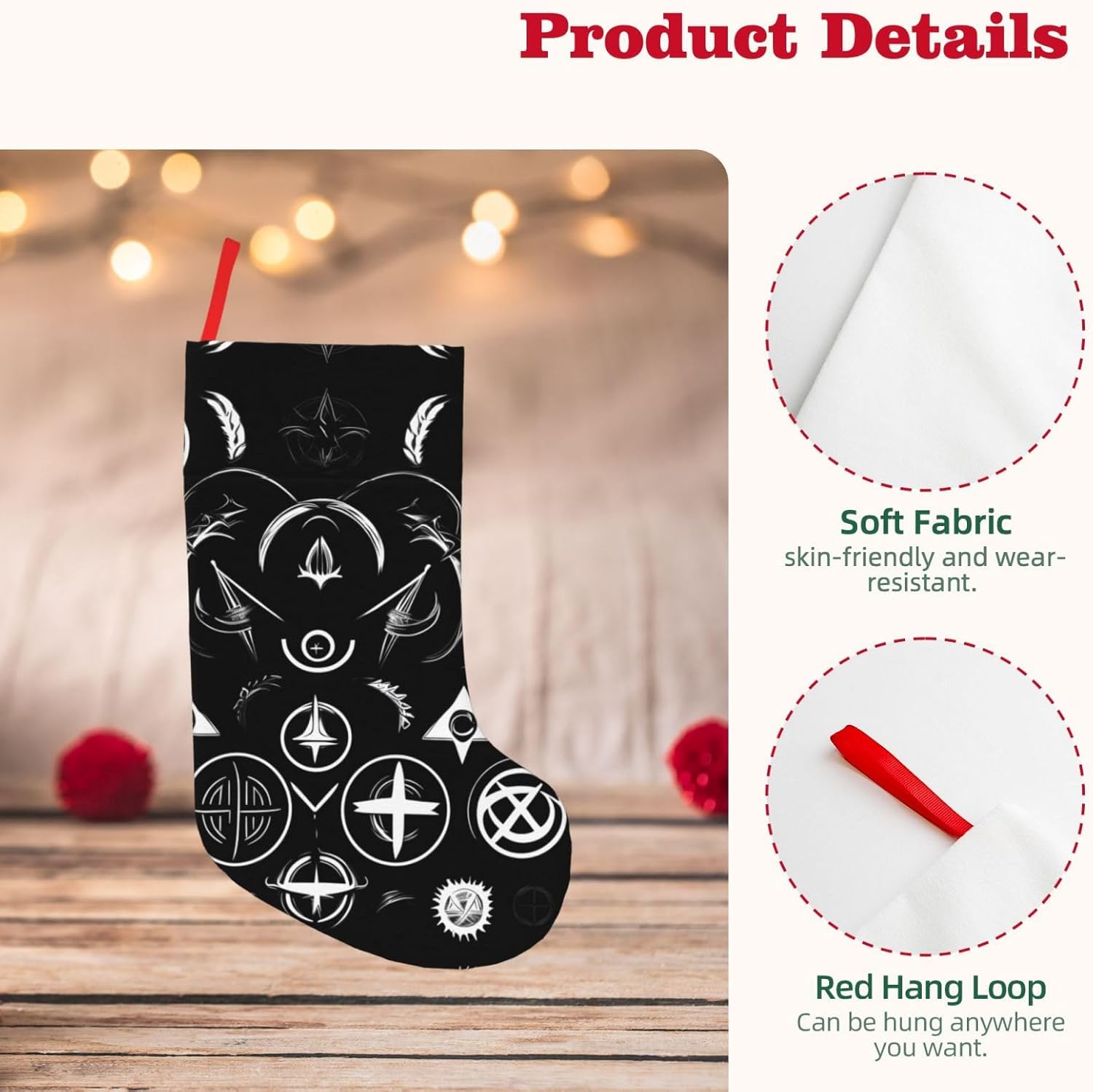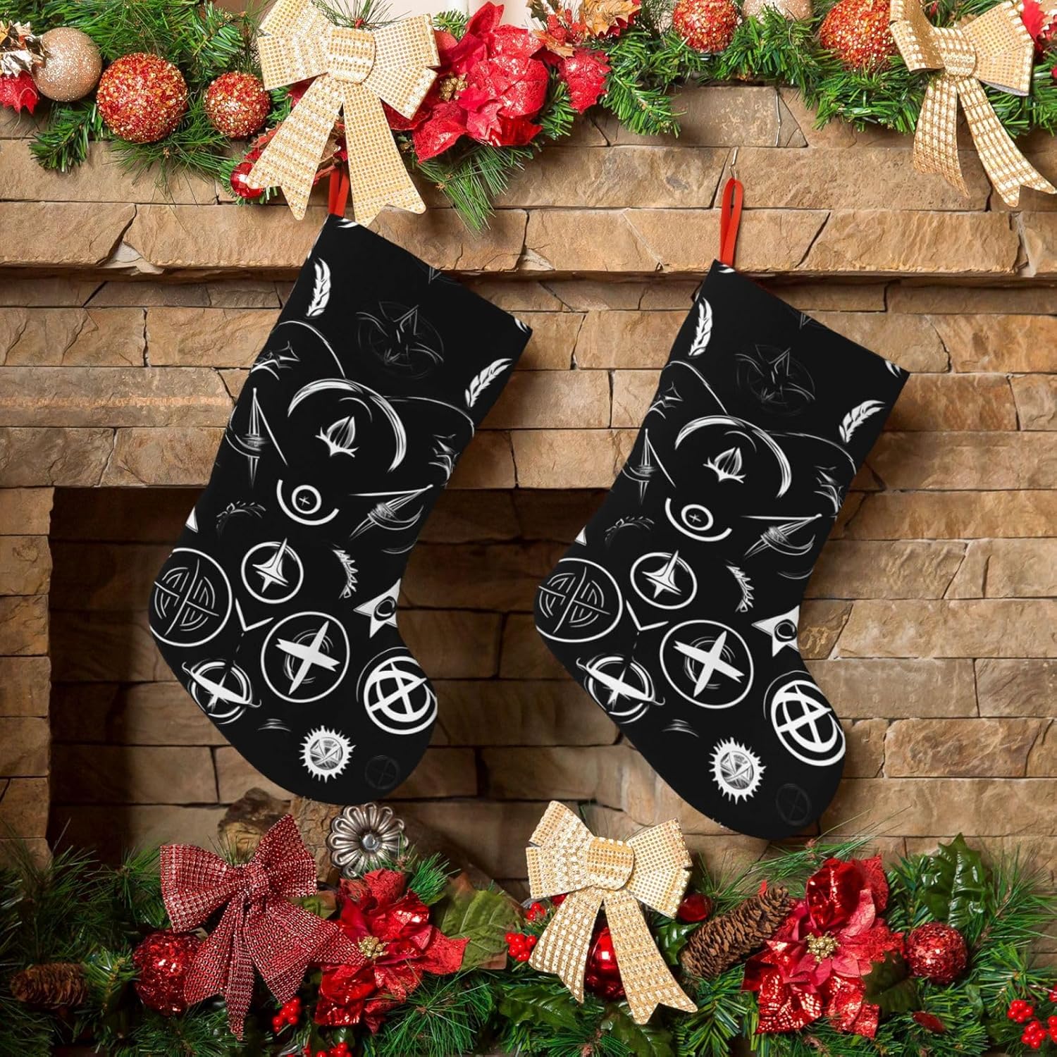KoNsev Calza di Natale da 45,7 cm per ragazzi e ragazze, grandi calze di Natale per vacanze in famiglia, feste di Natale, simboli neri e stampa ispiratrice