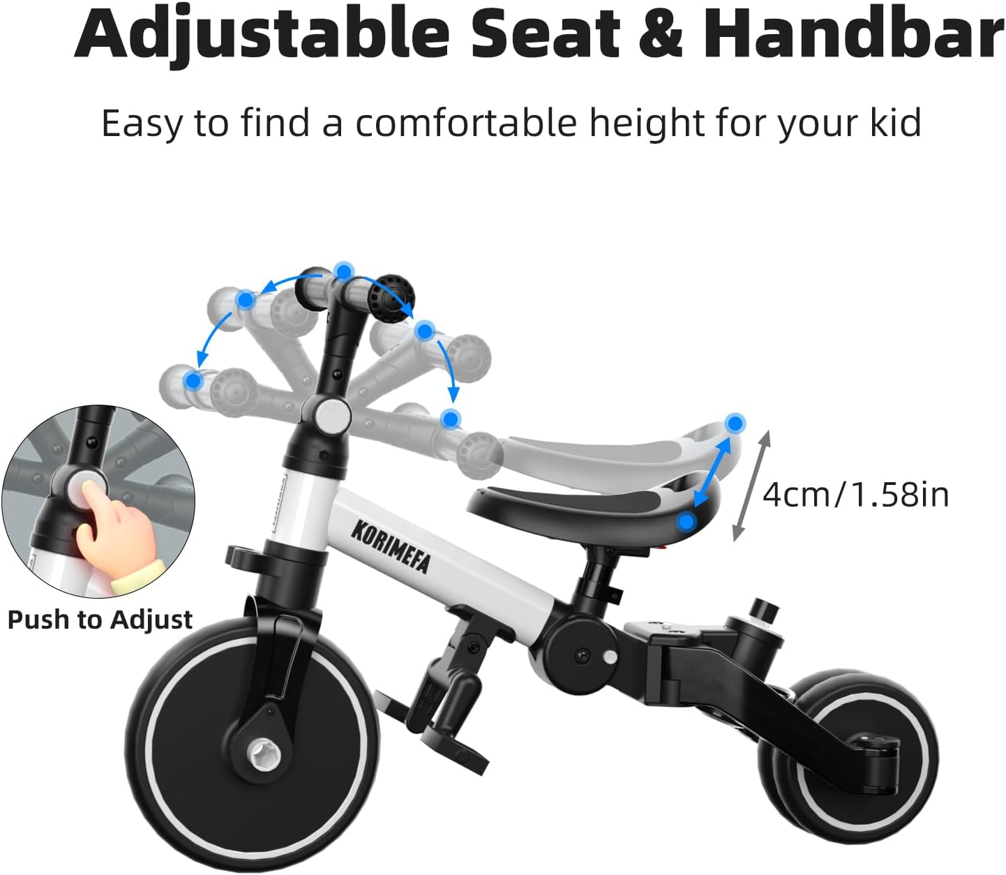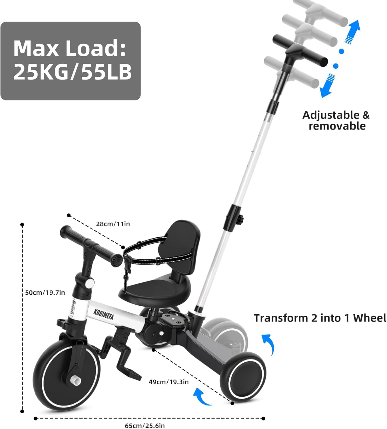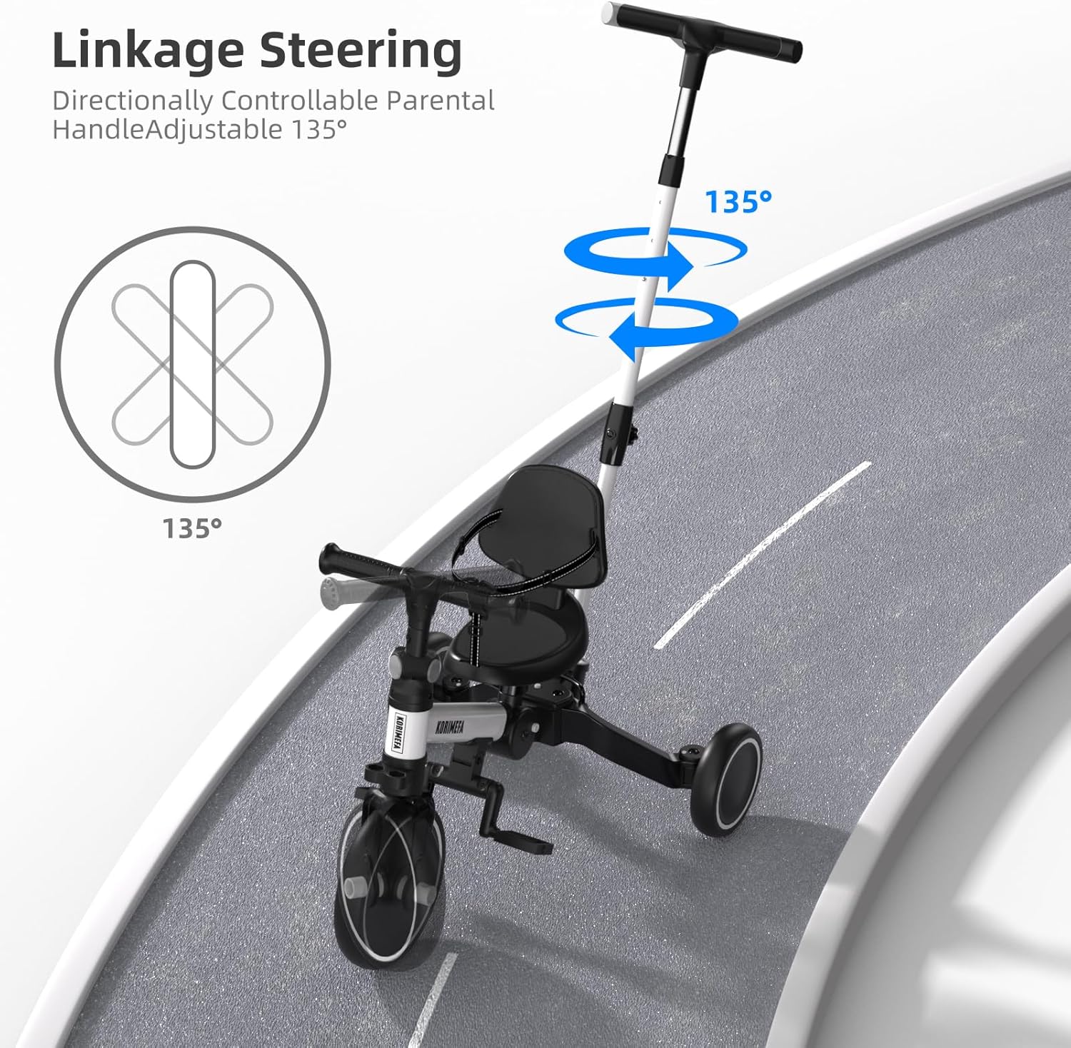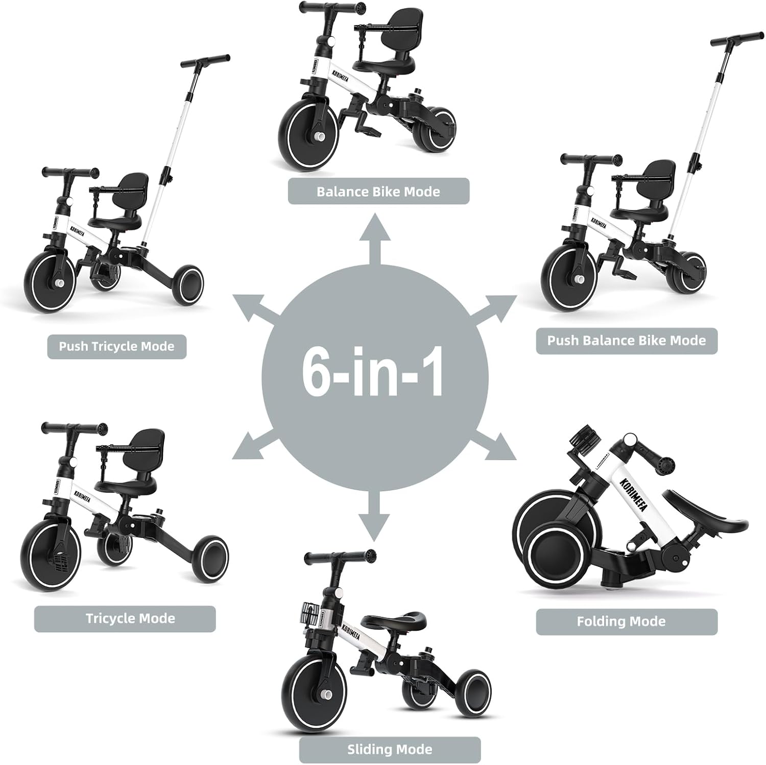 TRICICLO 5-in-1: Questo nuovo toddler aggiornato offre un design versatile 5-in-1. Può trasformarsi senza sforzo in varie modalità, tra cui una balance bike a spinta, un triciclo tradizionale, una balance bike e una modalità di scorrimento. MANIGLIA DI GUIDA PER I GENITORI: È dotato di un robusto manico di sterzo che consente ai genitori di assistere il loro piccolo mentre impara i fondamenti della pedalata e dello sterzo. L'altezza del manico può essere regolata su 4 diversi livelli, da 90 a 105 cm, per soddisfare un'ampia gamma di altezze di adulti. Trike regolabile per bambini da 1 a 3 anni: Il triciclo per bambini è progettato con manubrio e sedile regolabili per adattarsi ai bambini in crescita. L'altezza del sedile può essere regolata di 3,8 cm, garantendo una vestibilità confortevole per il bambino. Include anche poggiapiedi staccabili che possono essere posizionati in due punti diversi. PIEGHEVOLE COMPATTO A UNA SOLA PRESSIONE: Il triciclo KORIMEFA consente una rapida trasformazione da uno stato aperto a una dimensione ordinatamente compatta, perfetta sia per il trasporto che per la conservazione. È possibile riporre l'auto nell'armadio/portineria a proprio piacimento, poiché non occupa molto spazio ed è facile da portare in giro. La scelta perfetta del bambino: Le balance bike sono eccellenti per sviluppare le capacità di equilibrio del bambino. È realizzata con un telaio sicuro in acciaio al carbonio, ruote più larghe e silenziose, che assicurano che i bambini possano giocare in sicurezza. La guida all'interno o all'esterno aiuta i bambini a sviluppare la coordinazione mentre padroneggiano le loro abilità di guida. Sono la scelta ideale per acquisire sicurezza.