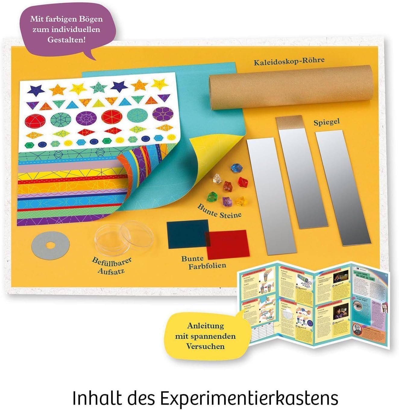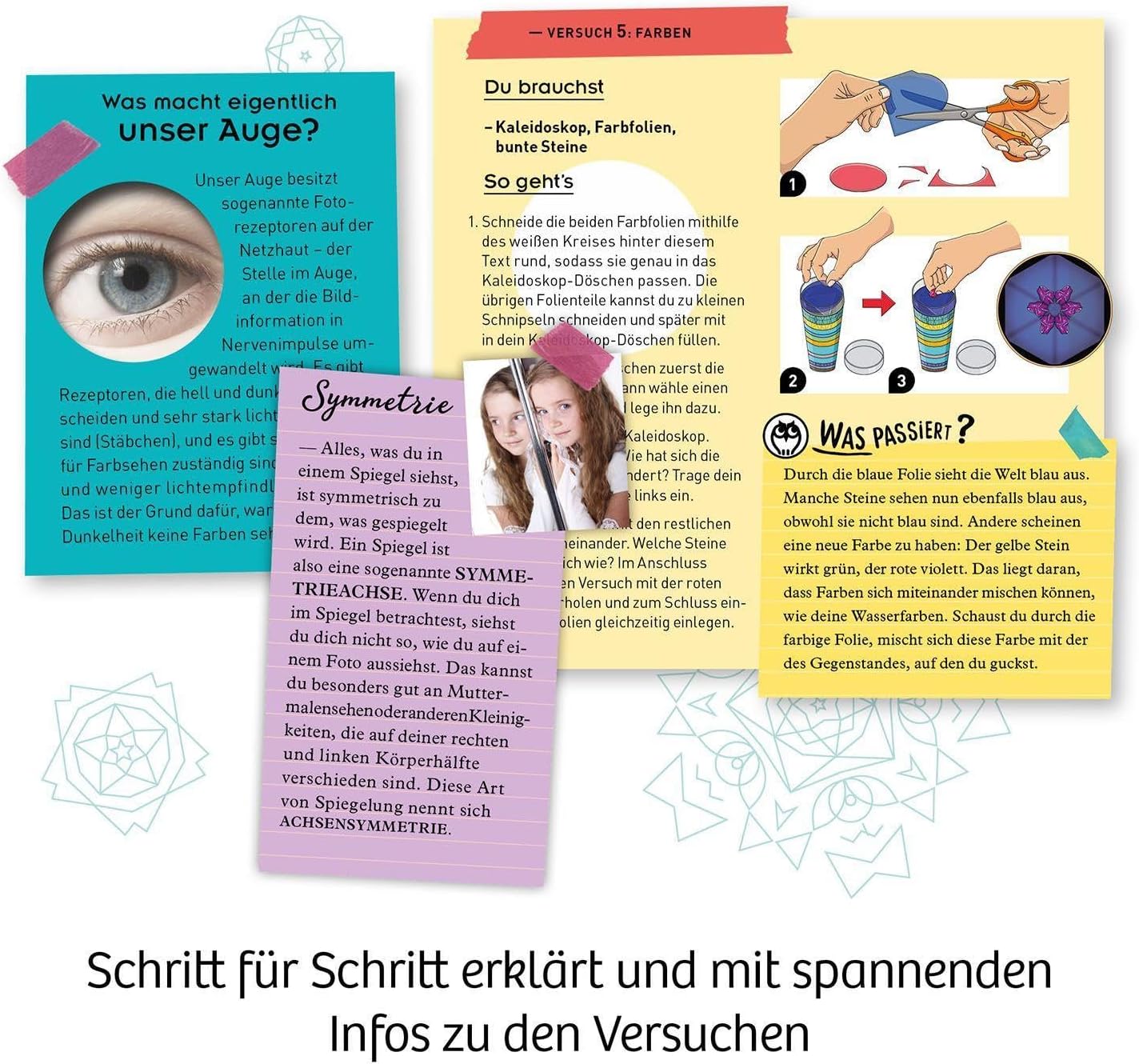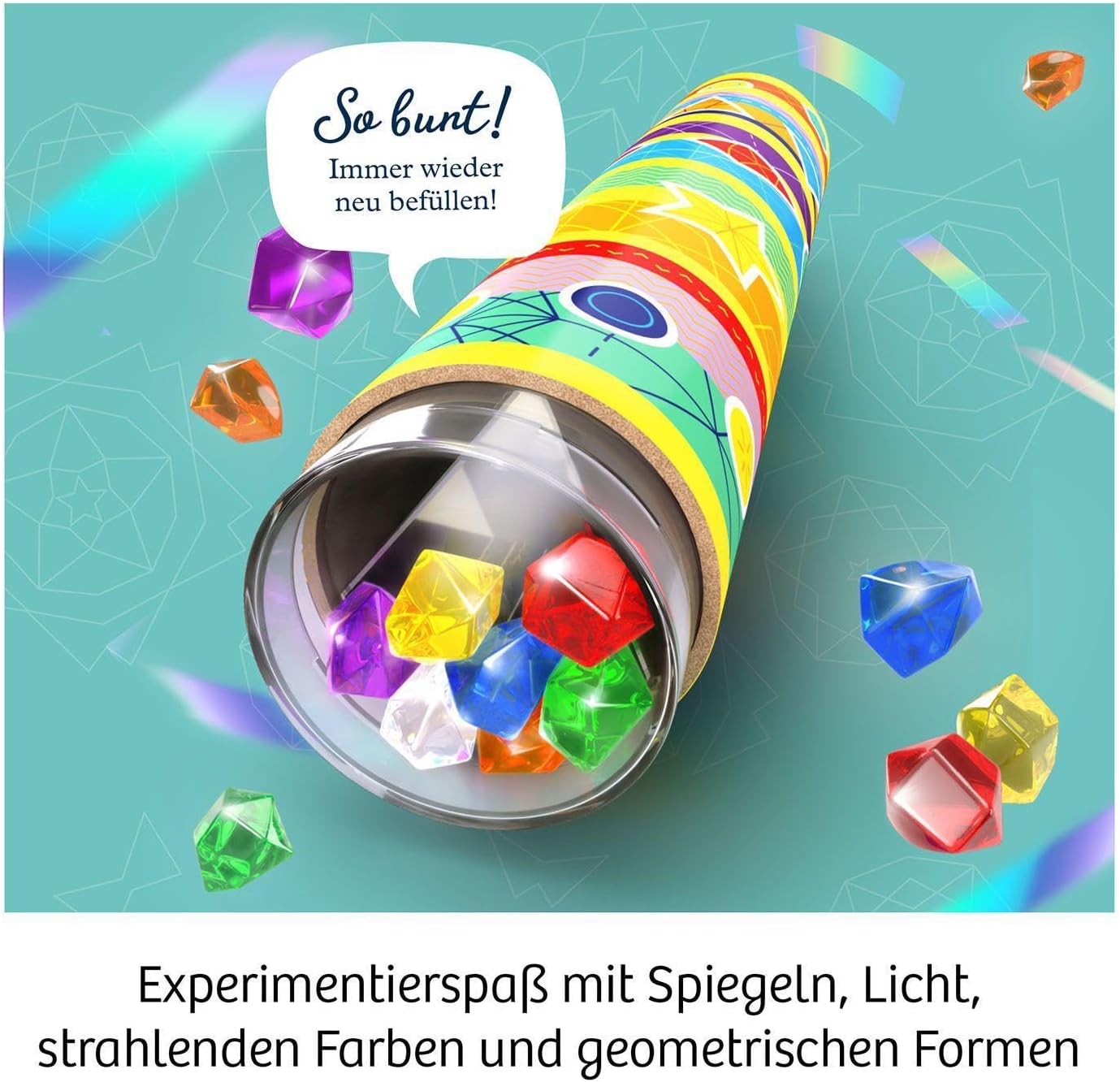 Bellissimo! I colori colorati ballano, crescono e cambiano davanti ai propri occhi. I caleidoscopi stupiscono i bambini da generazioni. Con questo set di ricerca, i bambini a partire dai 6 anni possono assemblare il proprio dispositivo ottico, progettarlo e riempirlo sempre di nuovo. Semplicemente nasce dal tubo caleidoscopio, 3 specchi, molte pietre colorate e 2 filtri colorati. Decorare ancora rapidamente con le strisce colorate e gli elementi decorativi Le istruzioni illustrate guidano i bambini attraverso la costruzione e i piccoli esperimenti e rivela emozionanti sul tema della luce e dei colori. Questo set di esperimenti creativi di KOSMOS fornisce la prima conoscenza dell'ottica e allena le capacità motorie.