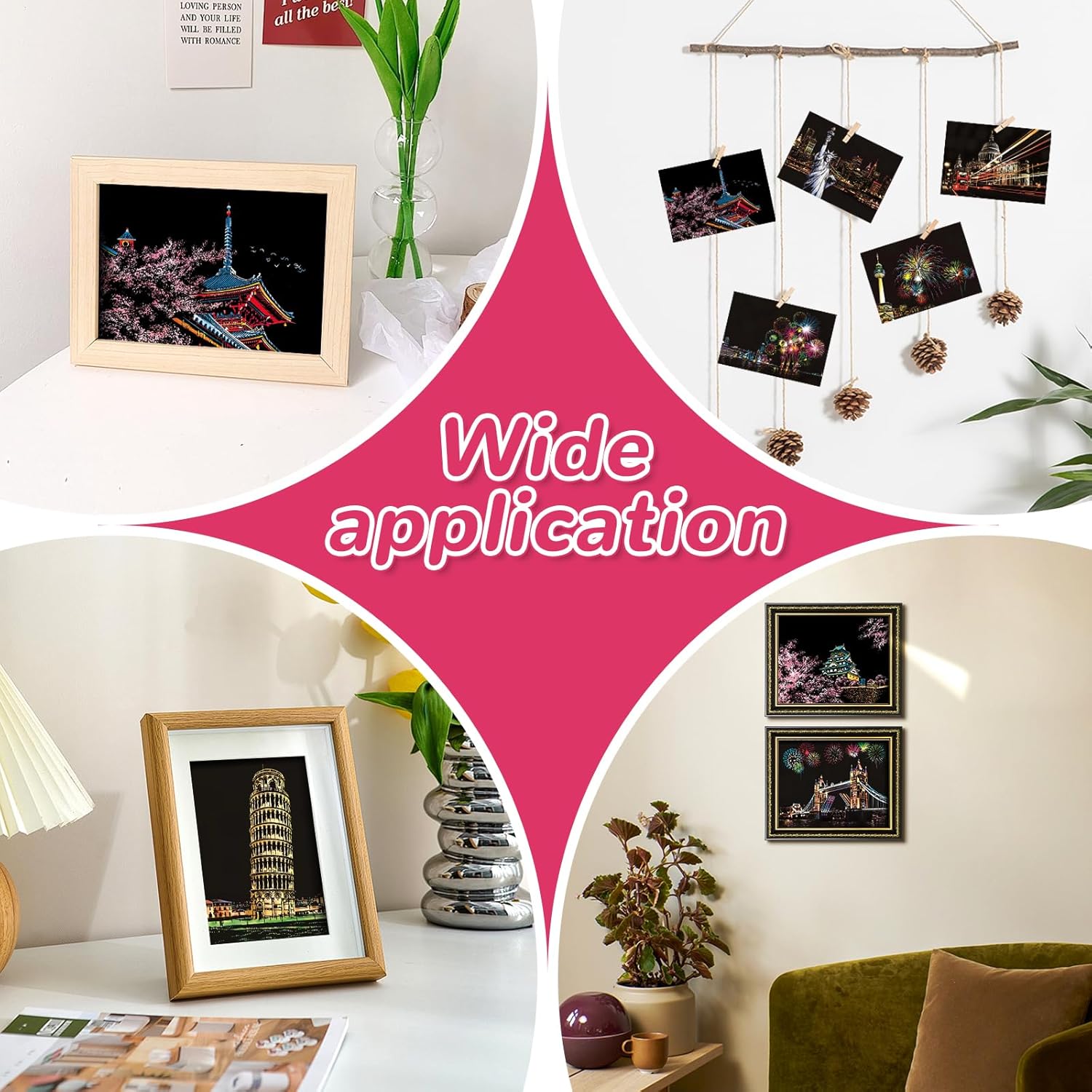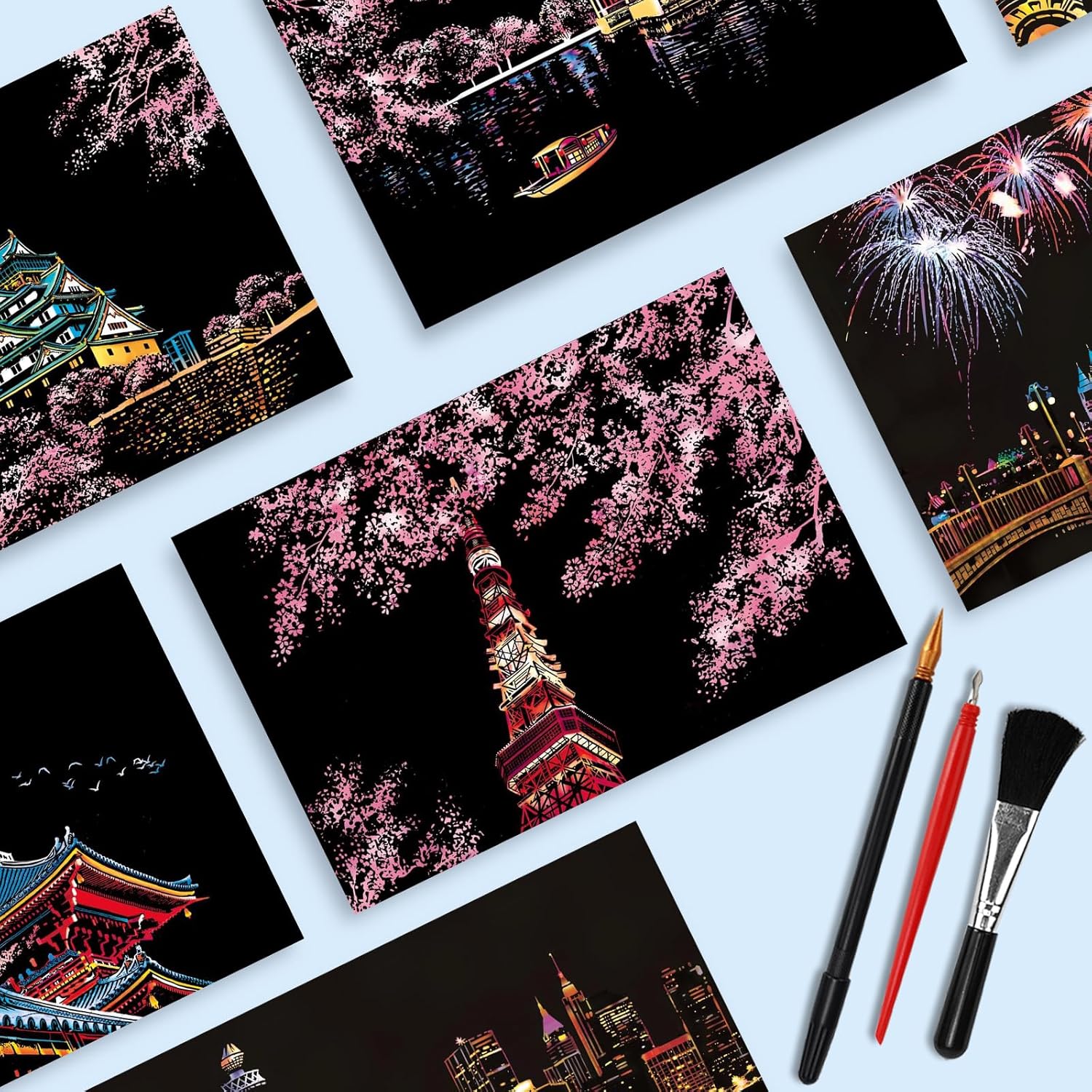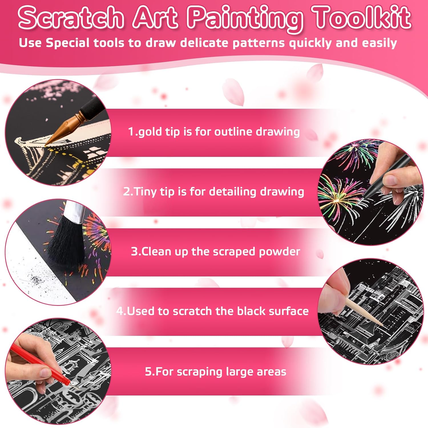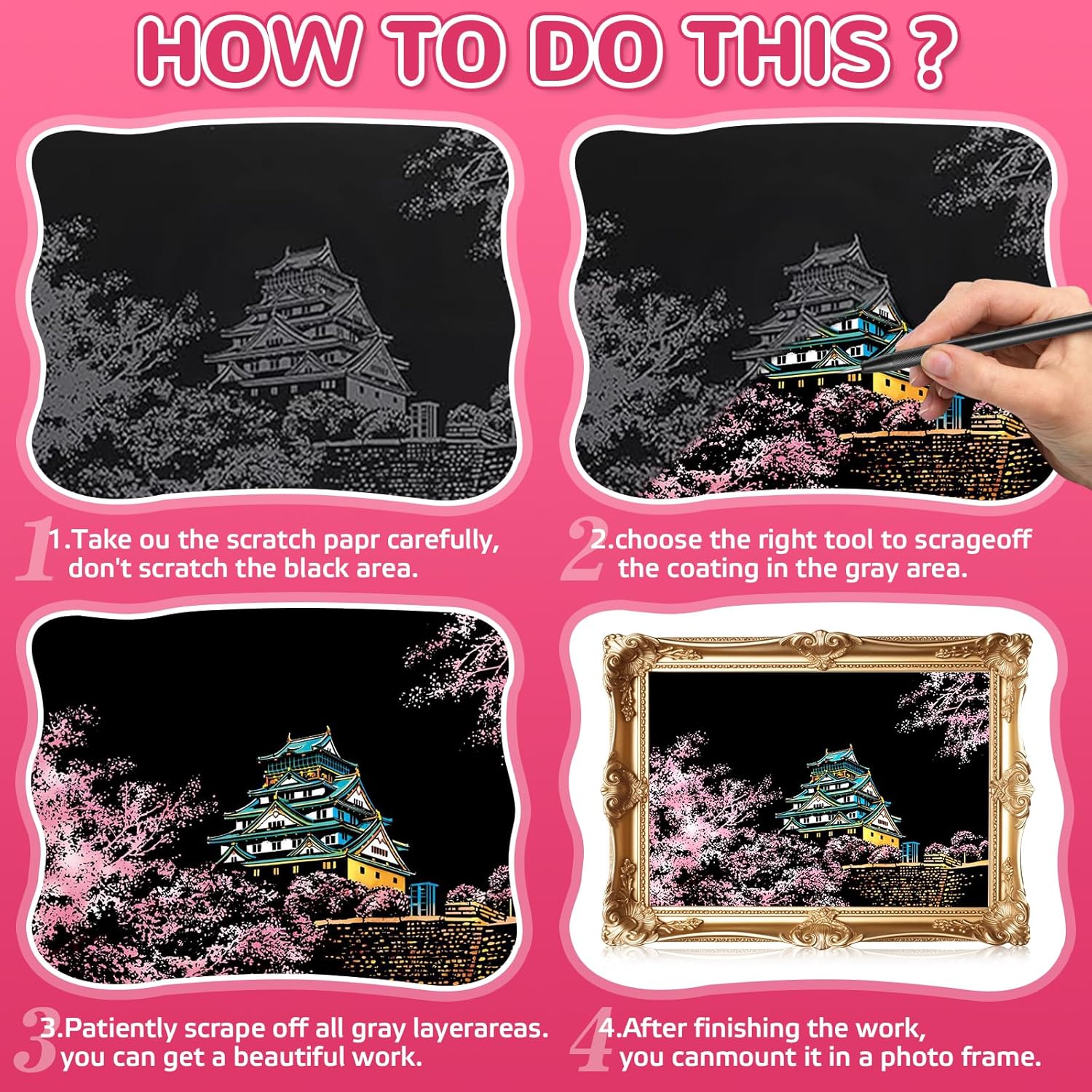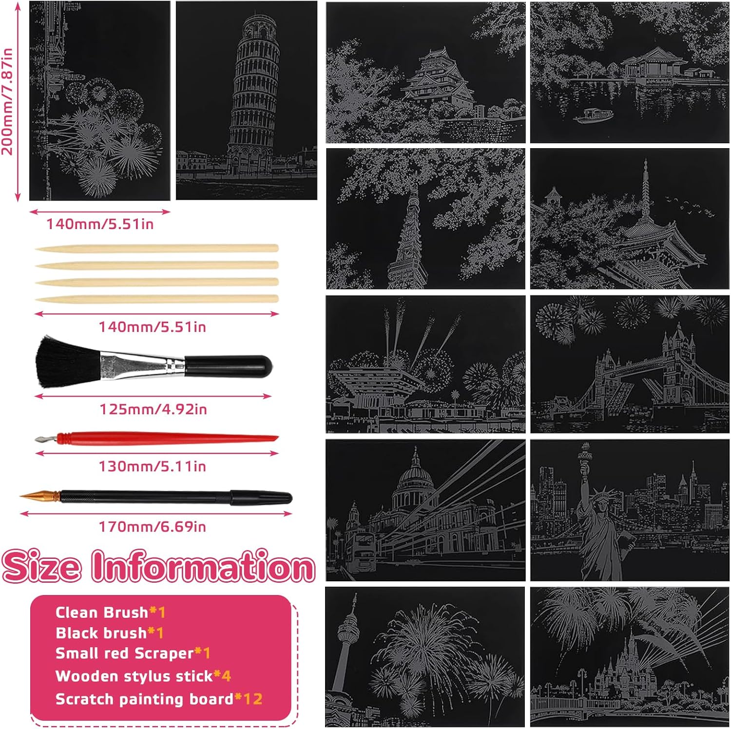 【Fuochi D'artificio e Fiori di Ciliegio Carta da Grattare】 La carta da grattare con fuochi d'artificio e fiori di ciliegio è realizzata principalmente in cartone resistente con rivestimento nero sulla superficie, con 1 set di strumenti: penna placcata oro, penna di bambù, spazzola morbida. 【Immagini da Grattare】Questo tipo di carta da grattare è un'attività molto divertente per godersi il tempo felice. Promuove anche l'interesse dei bambini per la pittura e sviluppa la loro creatività artistica e abilità pratiche. Anche gli adulti si concentreranno su questa carta per dimenticare le preoccupazioni, avere un umore allegro e sentirsi più rilassati. Questo è il modo migliore per alleviare lo stress quando sei lontano dal lavoro. 【Facile da Usare】Utilizza una penna speciale per rimuovere la linea grigia del motivo stampato in modo che tutti possano svolgere facilmente il lavoro. Usa un piccolo pennello per pulire in tempo la polvere nera rimossa e lasciare la superficie dello sfondo, quindi verrà rivelato un mondo completamente nuovo! Lo scenario meraviglioso è presentato a portata di mano, mostrando le abilità artistiche nei dipinti di scratch! 【Interazione con i Genitori】Questo sarà un buon progetto di interazione genitore-figlio! Questi materiali artistici sono ottimi anche per progetti di artigianato interattivi per genitori, fornendo attività creative per ragazze dai 14 anni in su per continuare a imparare e crescere durante feste, giornate di divertimento in famiglia, attività in classe, progetti scolastici e campi. Allo stesso tempo, il bambino deve prestare attenzione alla nitidezza dello strumento durante il disegno per evitare lesioni. 【Regali Creativi】Quando finisci il tuo lavoro e lo abbini alla cornice per foto, questo è un lavoro perfetto. Puoi usarlo per fare regali ad amici o familiari come fai tu stesso per farli sentire felici e sorpresi. Queste carte possono essere incorniciate, quindi appese al muro o messe sulla scrivania, aumentano l'atmosfera artistica e decorano la tua casa.