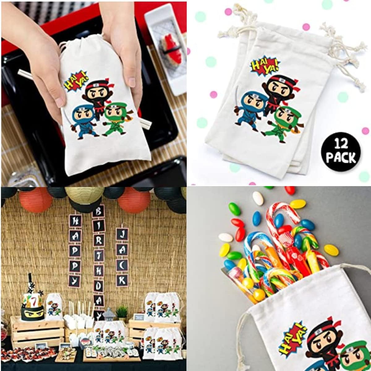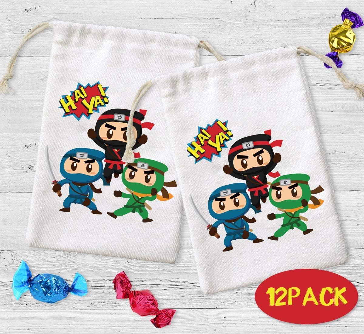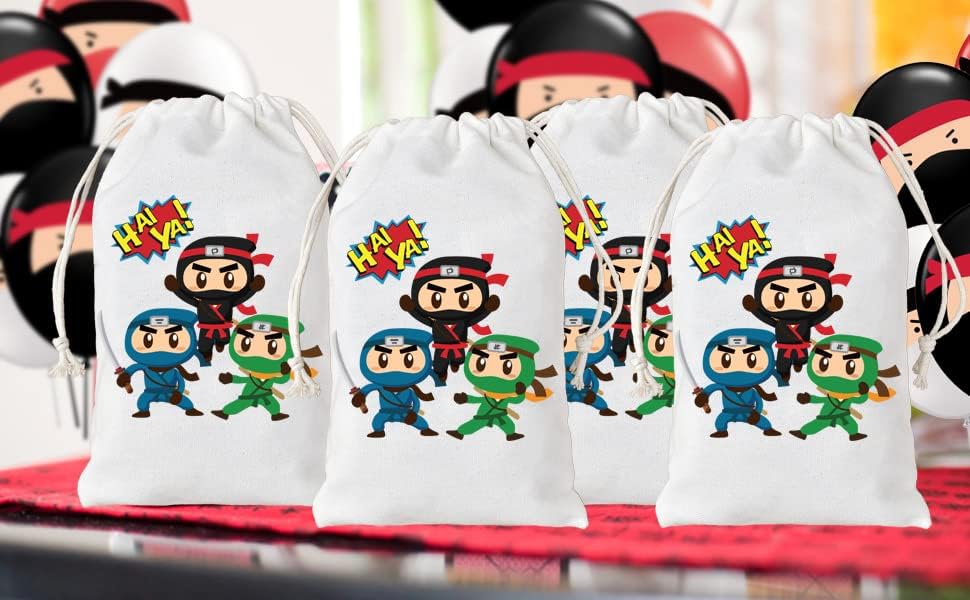 【Preziose borse da festa Ninja】 Il pacchetto include 12 borse ninja con coulisse, stampate con 3 graziosi motivi ninja, quantità sufficiente e più colori per soddisfare le esigenze di decorazione della festa. Materiale e dimensioni della borsa: realizzata in cotone di prima qualità, comoda, riutilizzabile. Dimensioni: 5" x 8", ideale da trasportare e riutilizzare da parte dei bambini, che può ridurre l'uso di sacchetti di plastica ed evitare sprechi. 【Design unico e pratico】Progettato con coulisse, facile da aprire e chiudere; Stampate con bellissimi motivi ninja unici e bellissimi caratteri, queste borse da festa di guerrieri ninja renderanno sicuramente la tua festa diversa dalle altre. Idee per l'uso: puoi utilizzare questi sacchetti per conservare molti regali per le feste come dolci, caramelle, biscotti, snack, bomboniere e piccoli regali e regalarli ai tuoi ospiti. Ovunque vengano posizionati, creano accattivanti decorazioni per le feste. 【Adatto a molte occasioni】 Queste adorabili borse in cotone ninja sono ideali per feste di compleanno di ragazzi o ragazze, feste a tema eroi guerrieri ninja, decorazioni nuziali, forniture per feste baby shower o altri eventi a tema ninja.